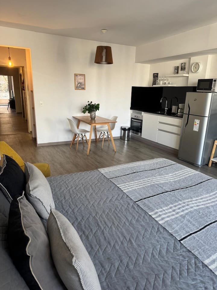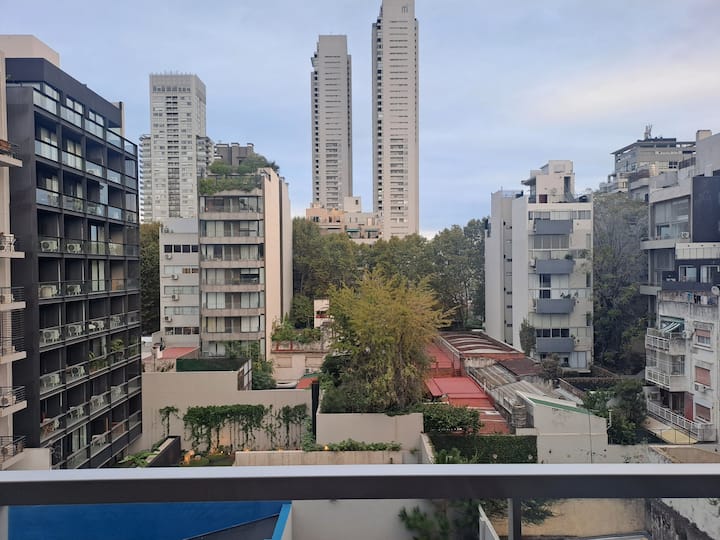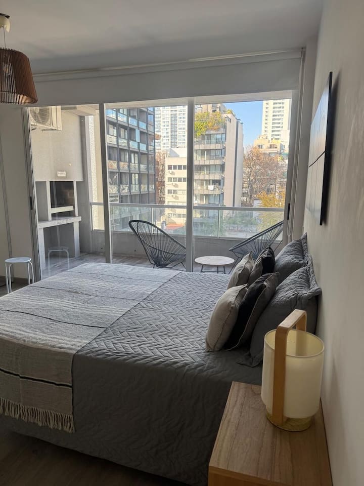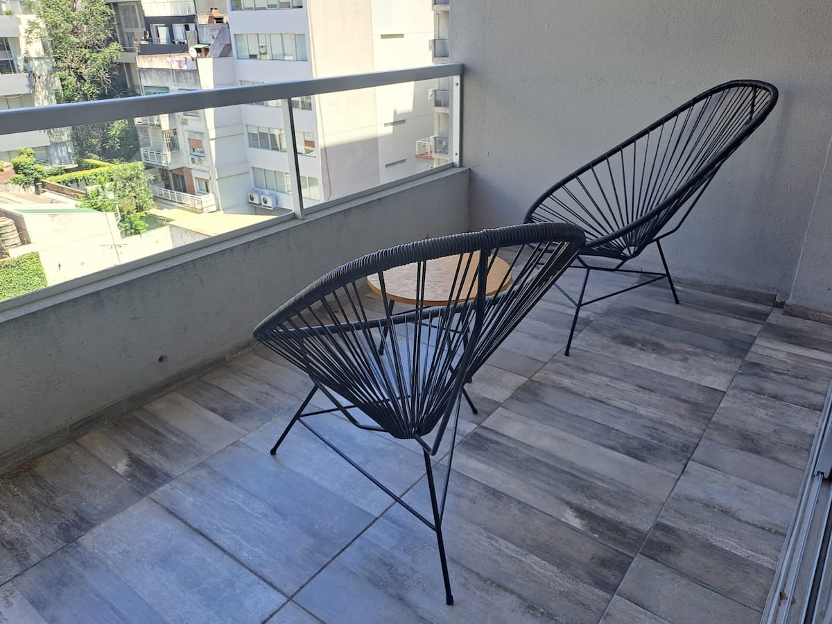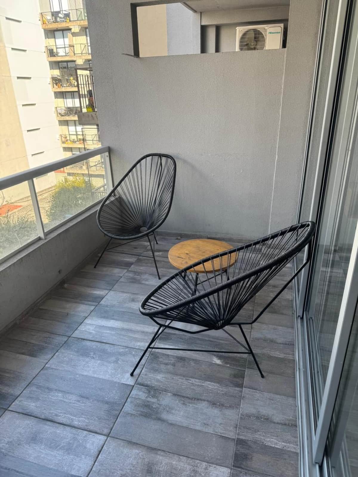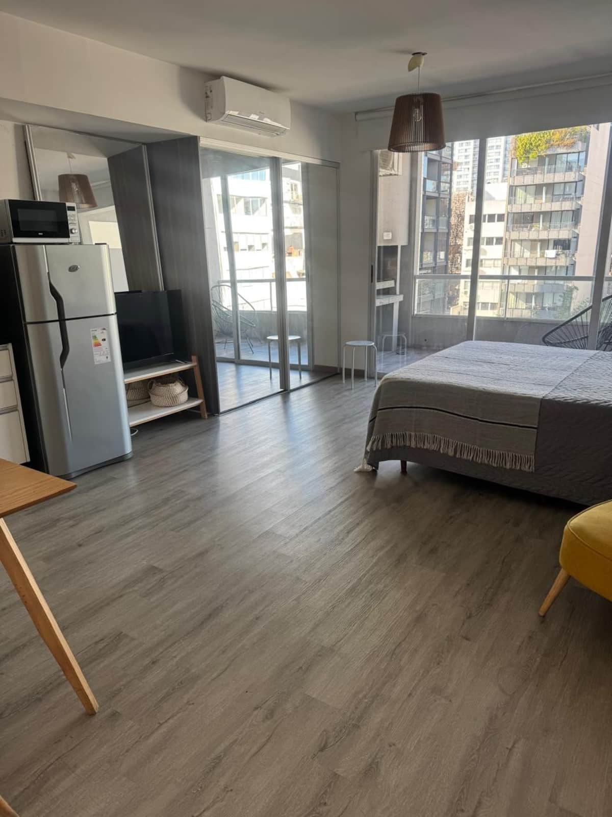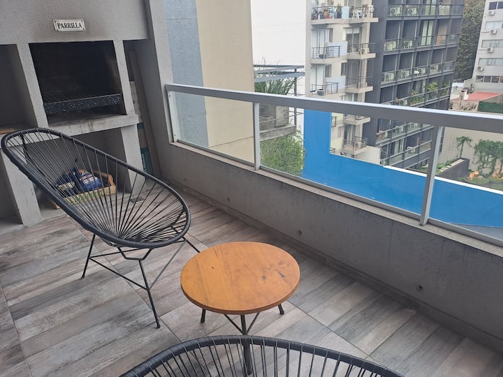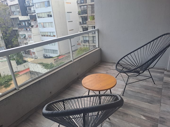 Departamento de 1 dormitorio en Palermo Hollywood, con balcón y parrilla. Cuenta con cama queen, WiFi, Smart TV, microondas y cocina completa. Incluye aire acondicionado con control remoto y balcón con mesa y dos sillas.
