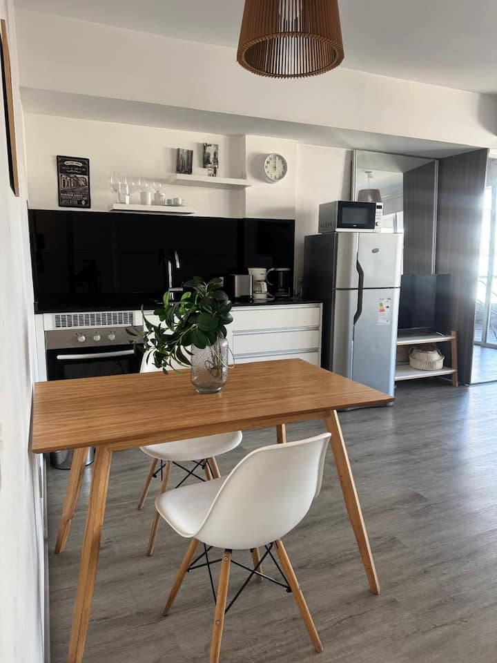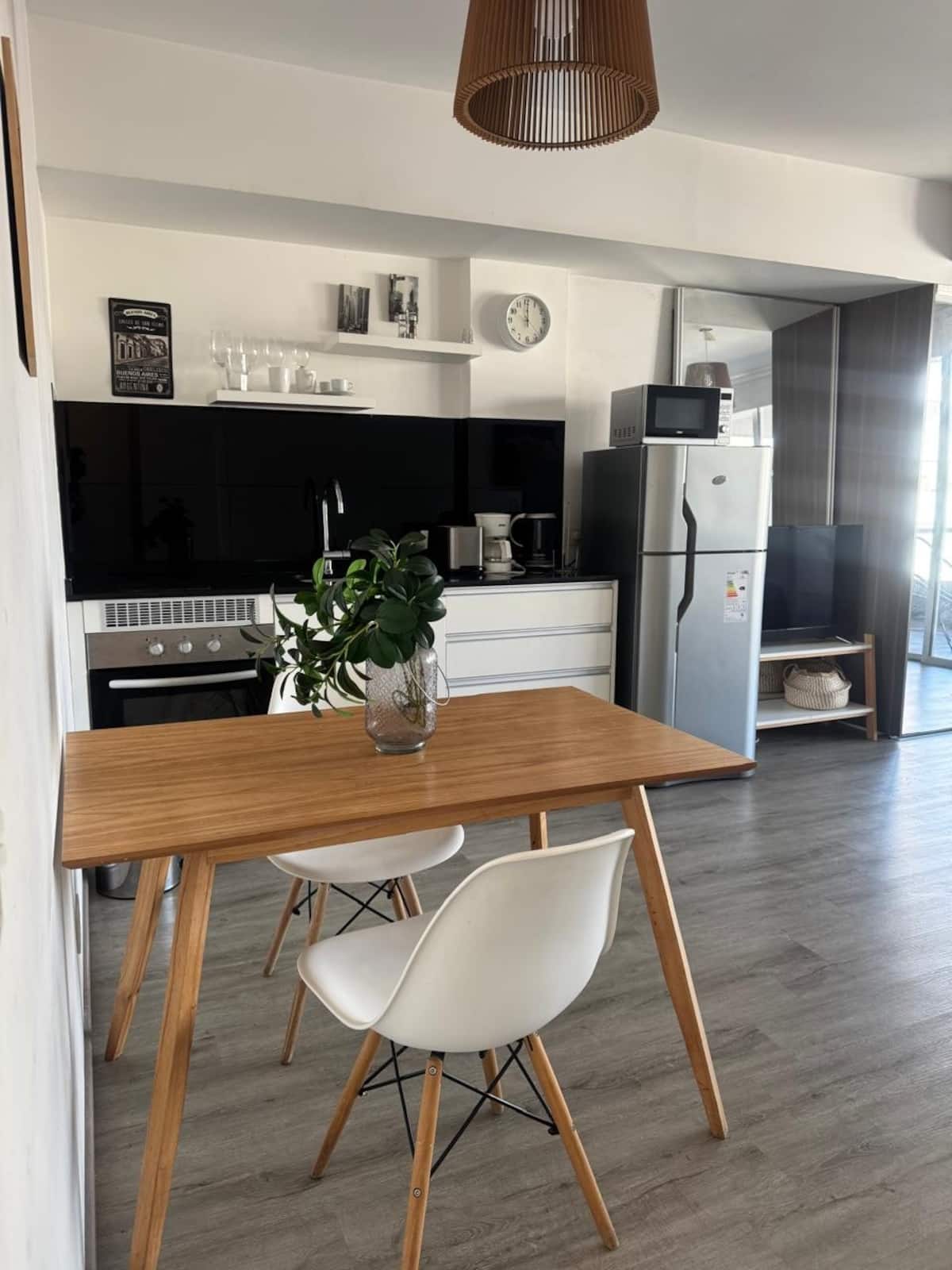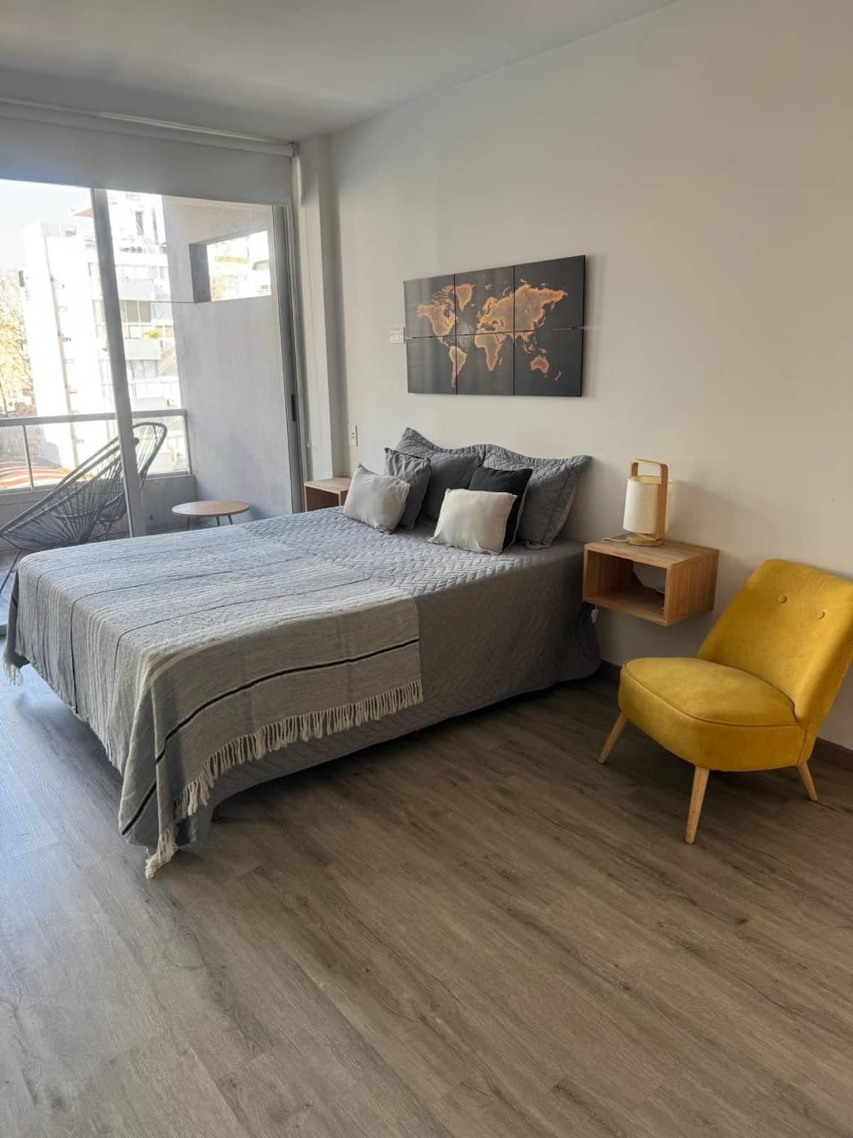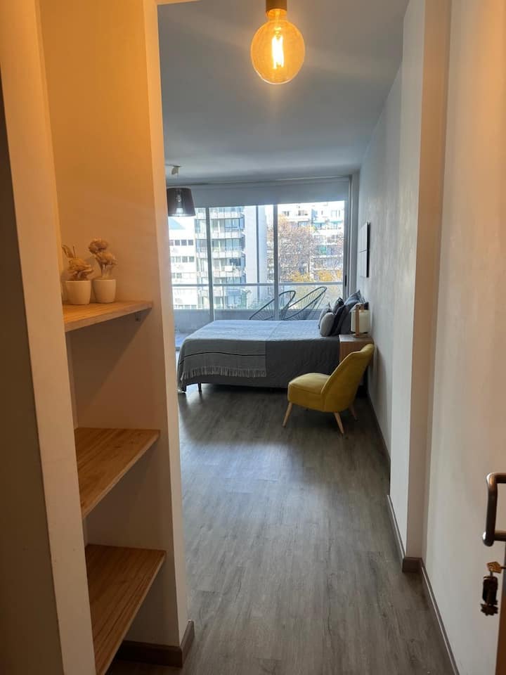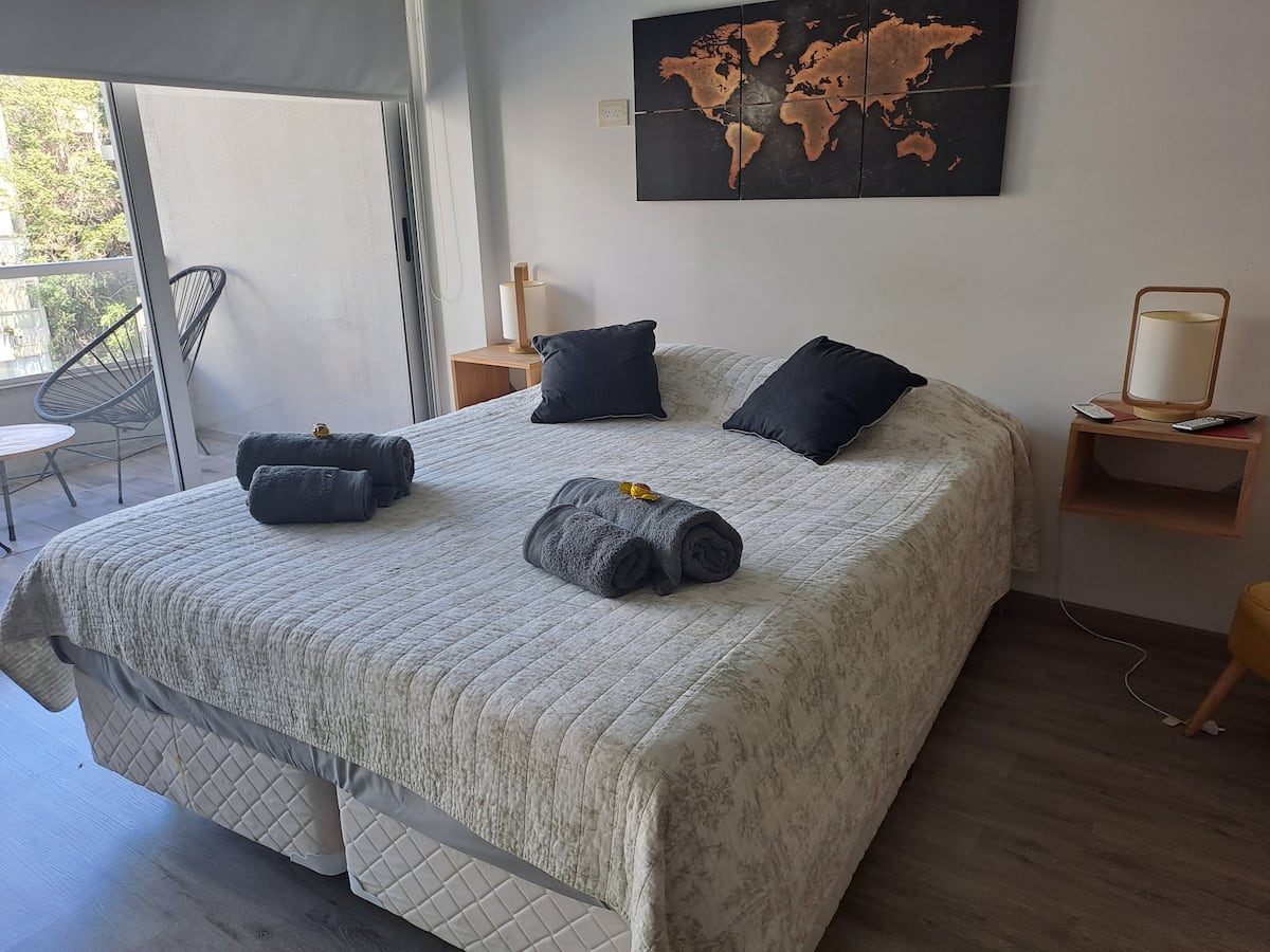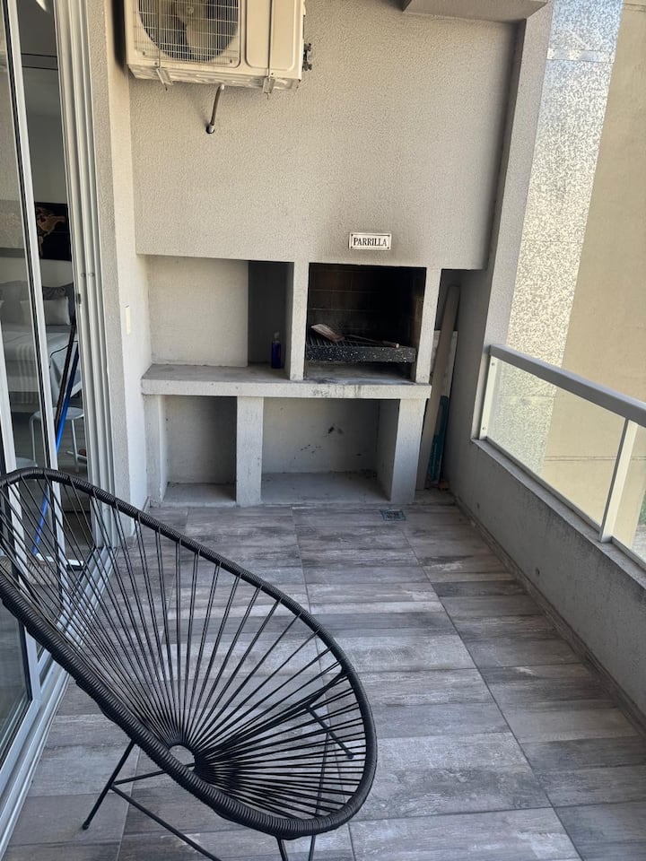Departamento de 1 dormitorio en Palermo Hollywood, con balcón y parrilla. Cuenta con cama queen, WiFi, Smart TV, microondas y cocina completa. Incluye aire acondicionado con control remoto y balcón con mesa y dos sillas.