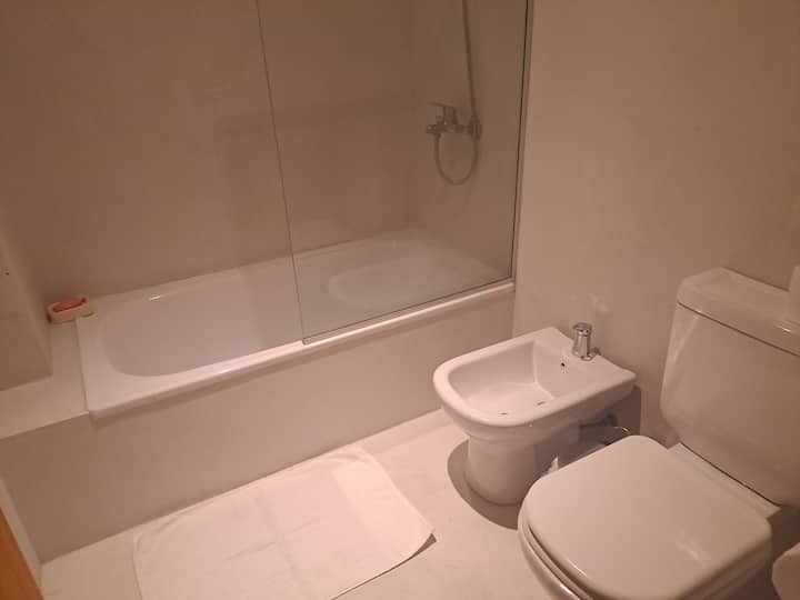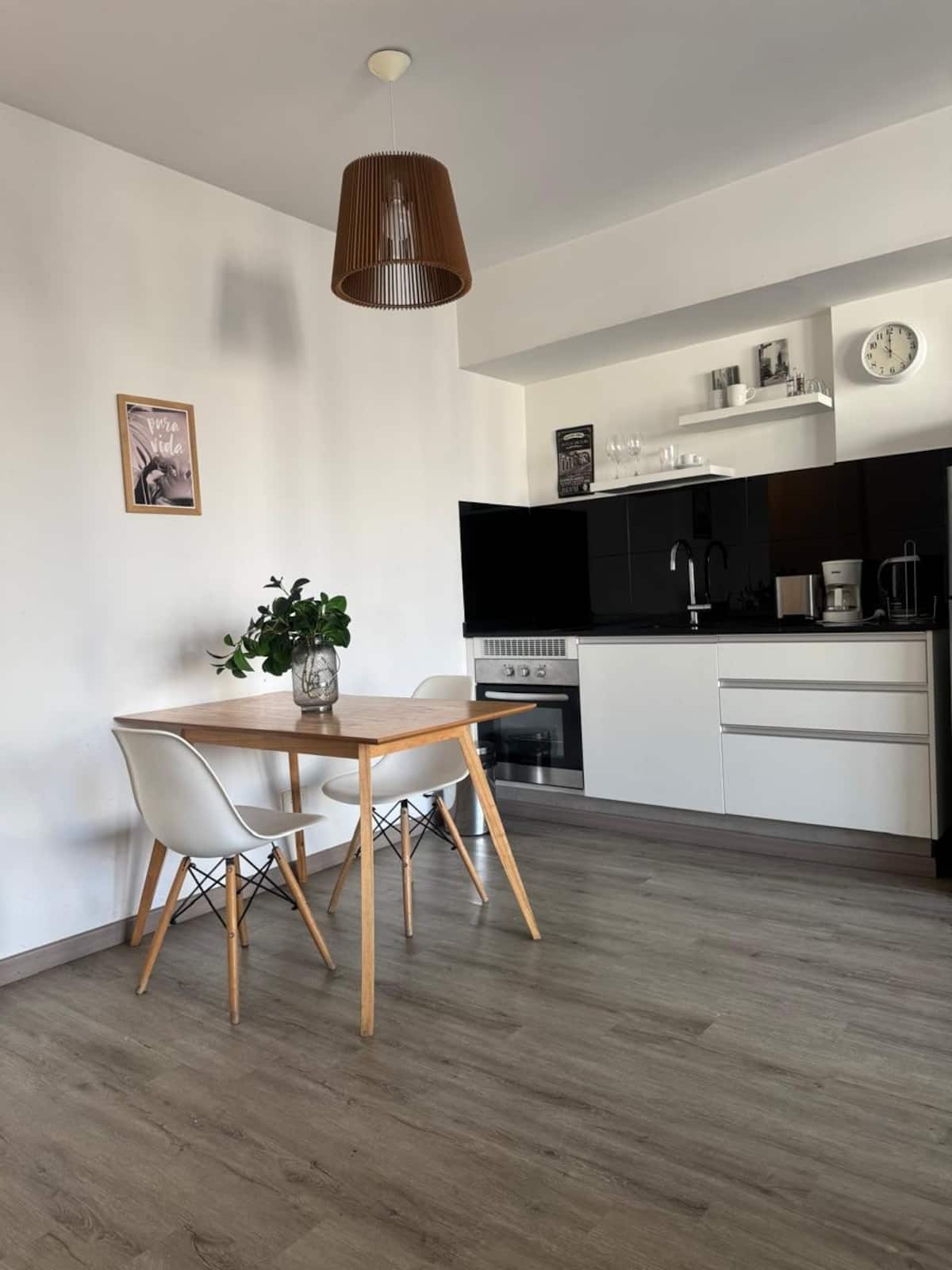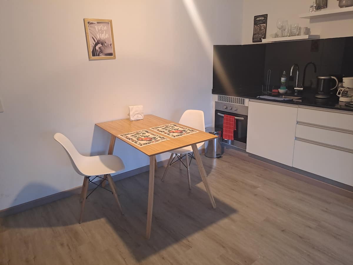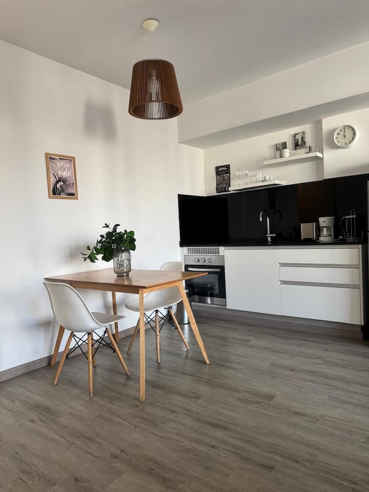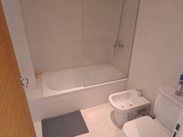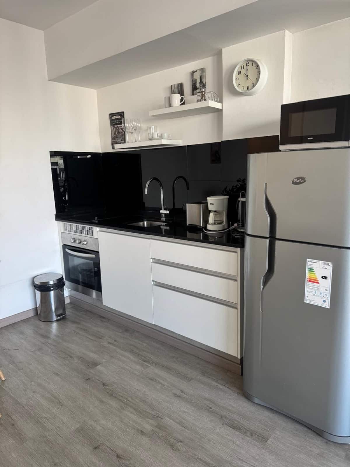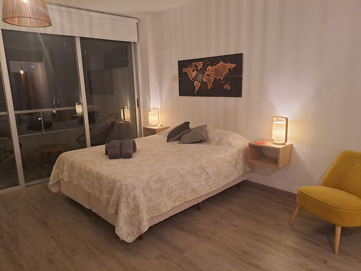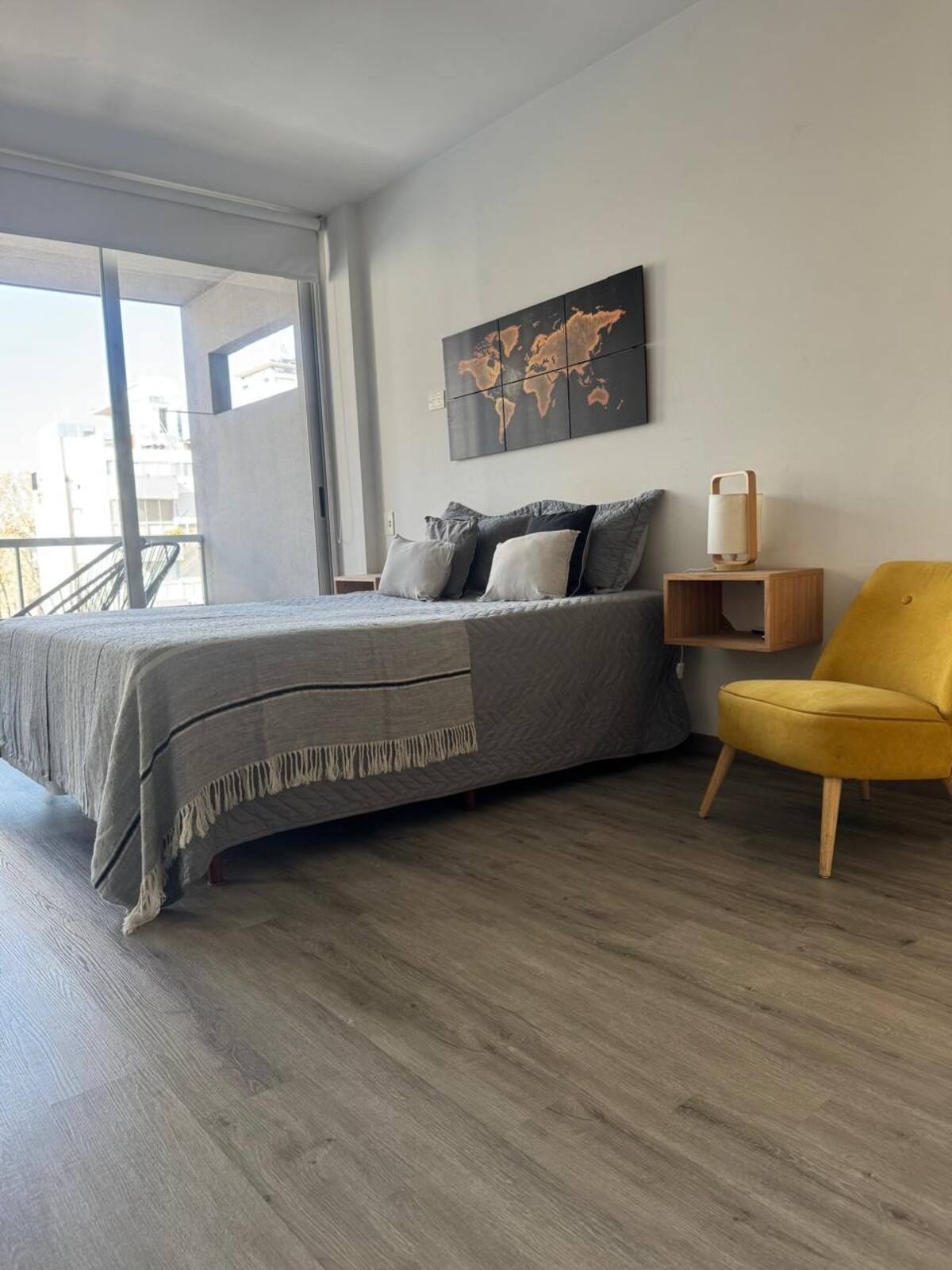 Departamento de 1 dormitorio en Palermo Hollywood, con balcón y parrilla. Cuenta con cama queen, WiFi, Smart TV, microondas y cocina completa. Incluye aire acondicionado con control remoto y balcón con mesa y dos sillas.
