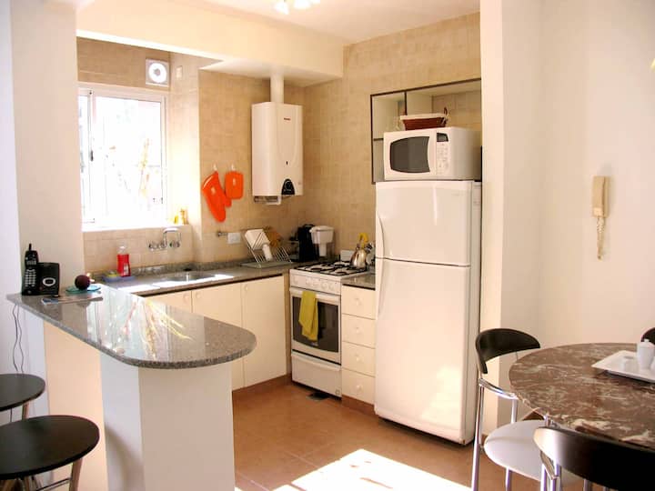 Departamento de 2 ambientes de 1 dormitorio y 4º piso en Palermo, en el área de Botánico, al contrafrente con salida a patio compartido. Se encuentra totalmente amoblado y equipado, con aire acondicionado en living y dormitorio. El living-comedor cuenta con sofá cama y mesa de trabajo; el dormitorio tiene cama de 1 plaza y ropero empotrado. La cocina está integrada y equipada con heladera y lavarropas; el baño es completo con ducha y bañera. El edificio tiene ascensores y seguridad en la calle l