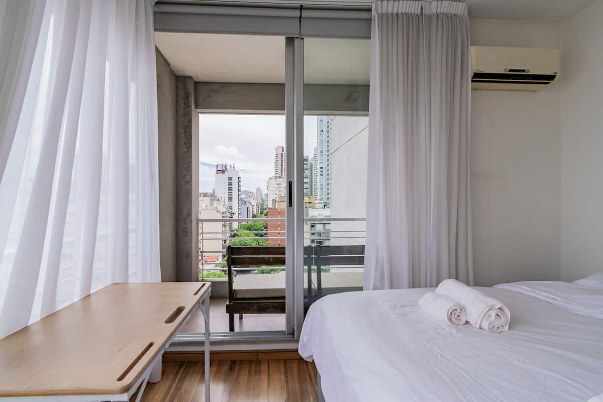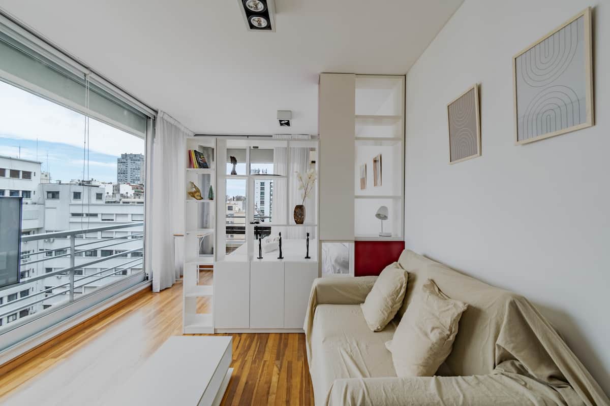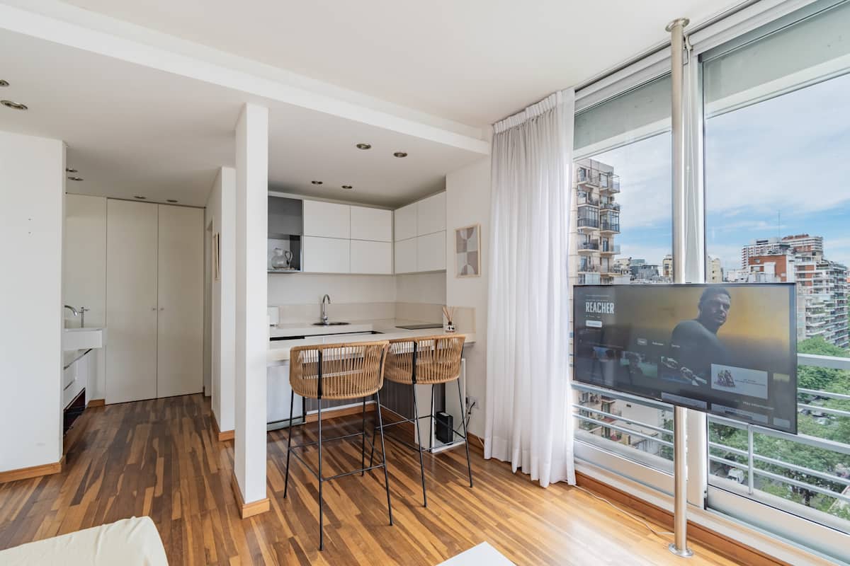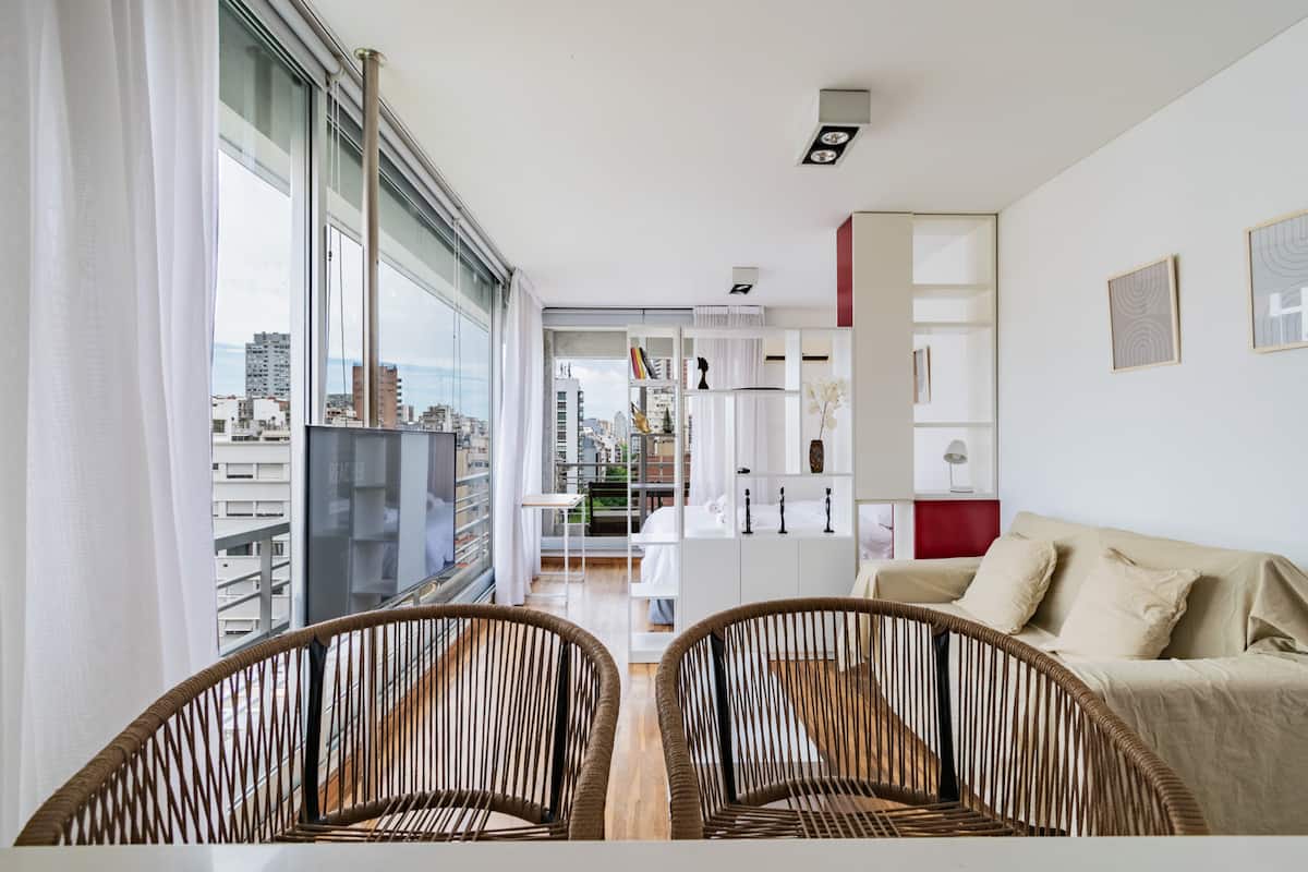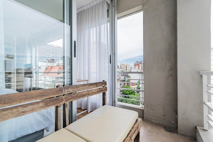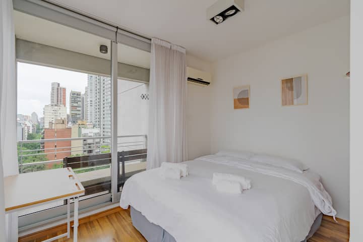 Departamento monoambiente en Palermo, con balcón y vista abierta. Cuenta con cama queen, sistema de blackout y ventanales. El espacio incluye cocina con utensilios, un sector con división para el dormitorio mediante una barra y baño. El alojamiento indica que la pileta funciona normalmente sólo en verano y que su disponibilidad debe verificarse antes de la estadía.