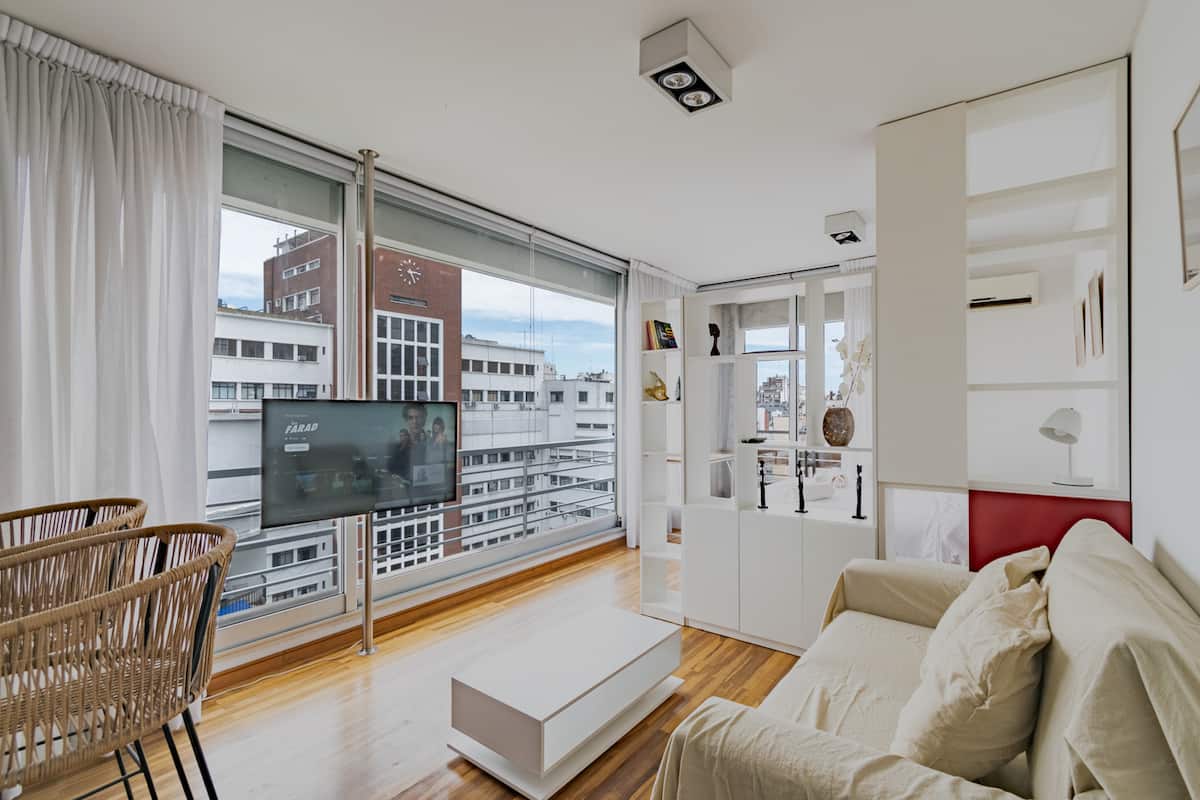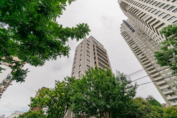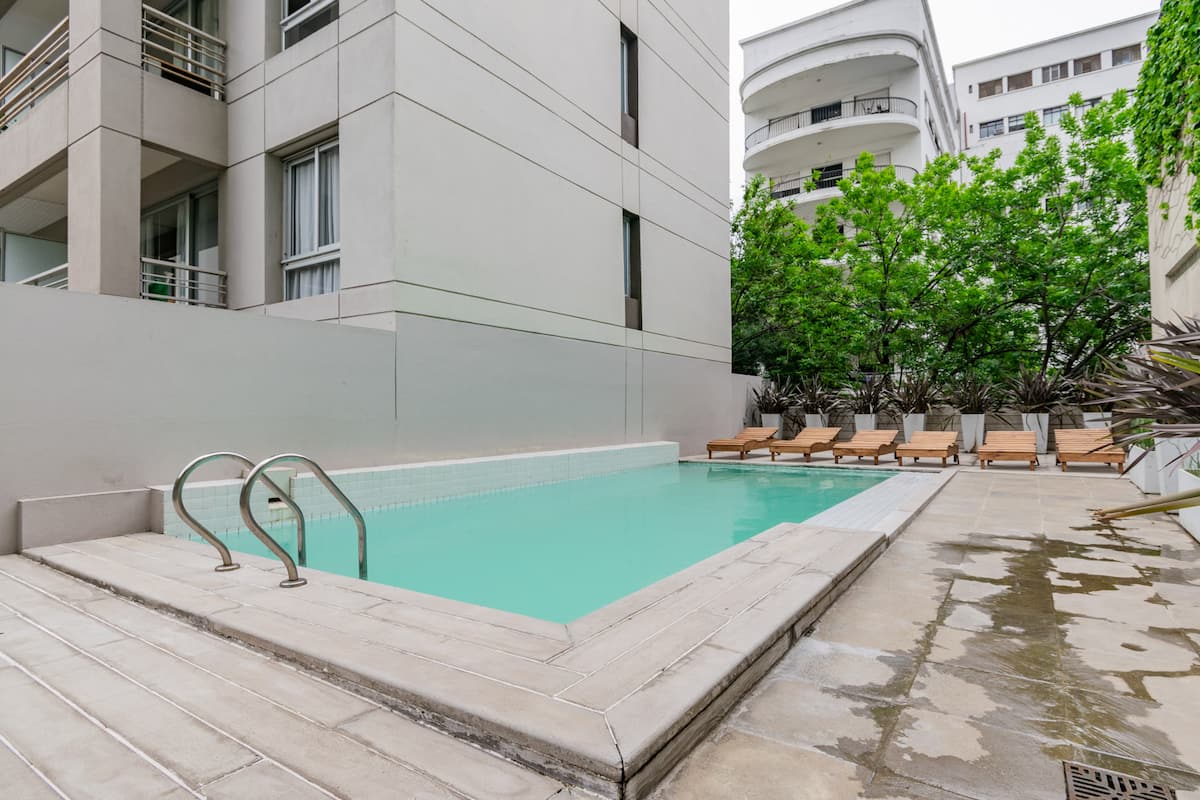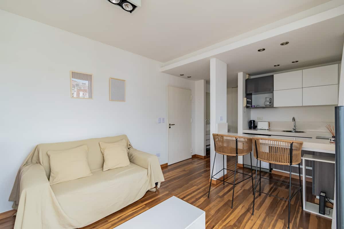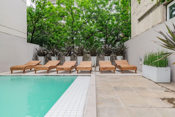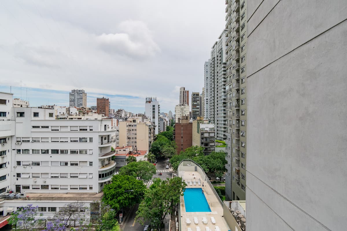 Departamento monoambiente en Palermo, con balcón y vista abierta. Cuenta con cama queen, sistema de blackout y ventanales. El espacio incluye cocina con utensilios, un sector con división para el dormitorio mediante una barra y baño. El alojamiento indica que la pileta funciona normalmente sólo en verano y que su disponibilidad debe verificarse antes de la estadía.