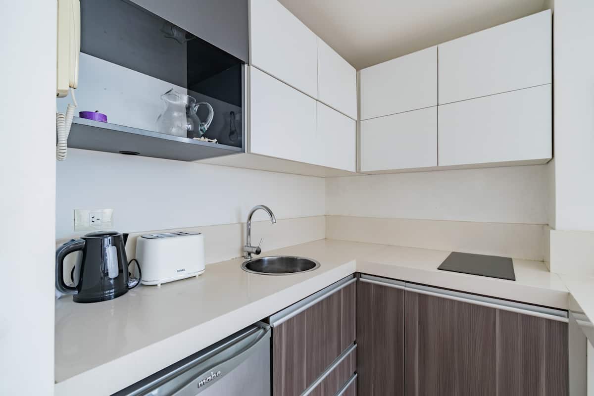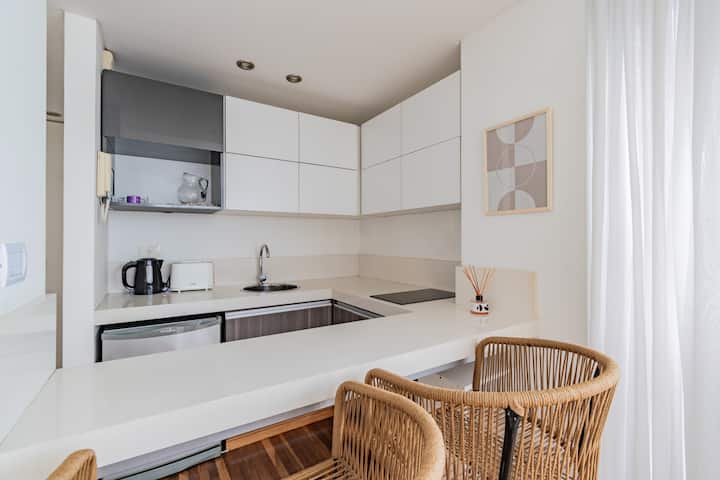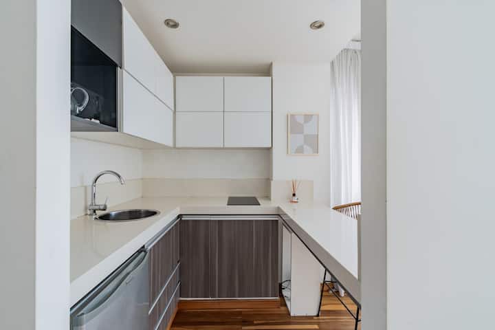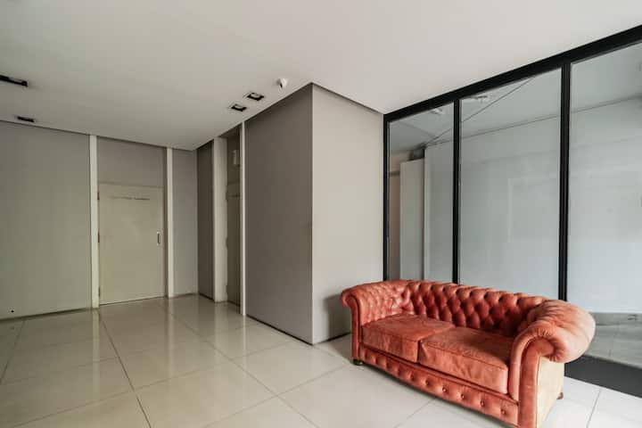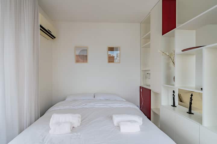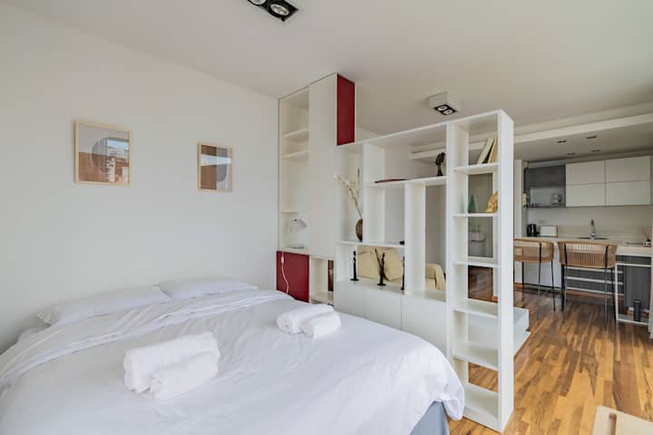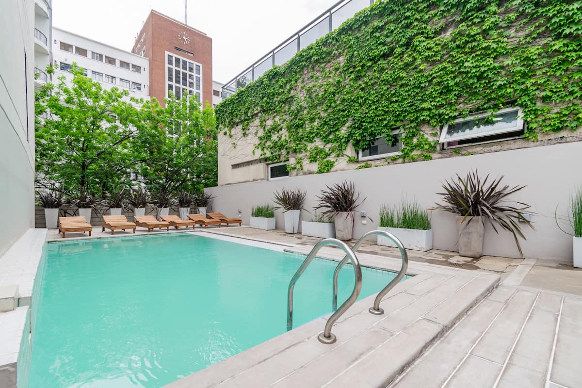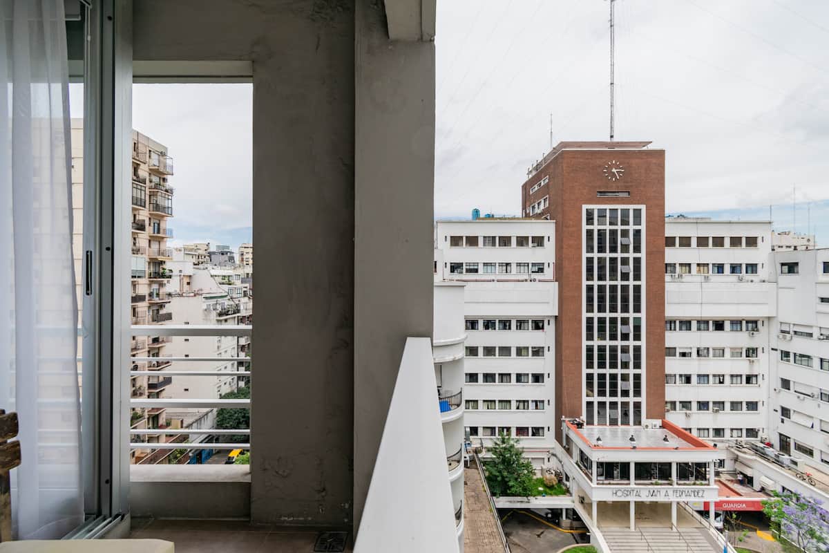 Departamento monoambiente en Palermo, con balcón y vista abierta. Cuenta con cama queen, sistema de blackout y ventanales. El espacio incluye cocina con utensilios, un sector con división para el dormitorio mediante una barra y baño. El alojamiento indica que la pileta funciona normalmente sólo en verano y que su disponibilidad debe verificarse antes de la estadía.