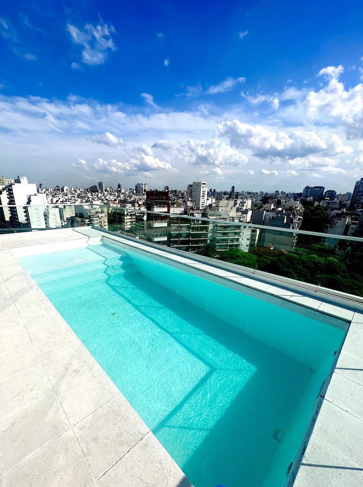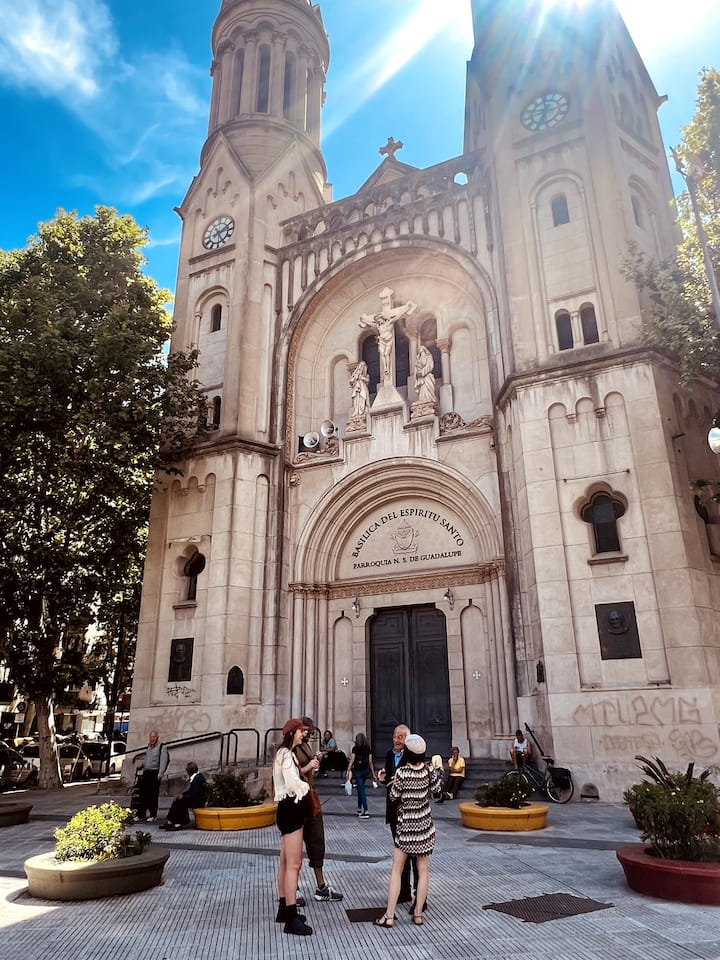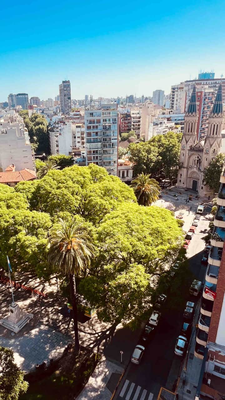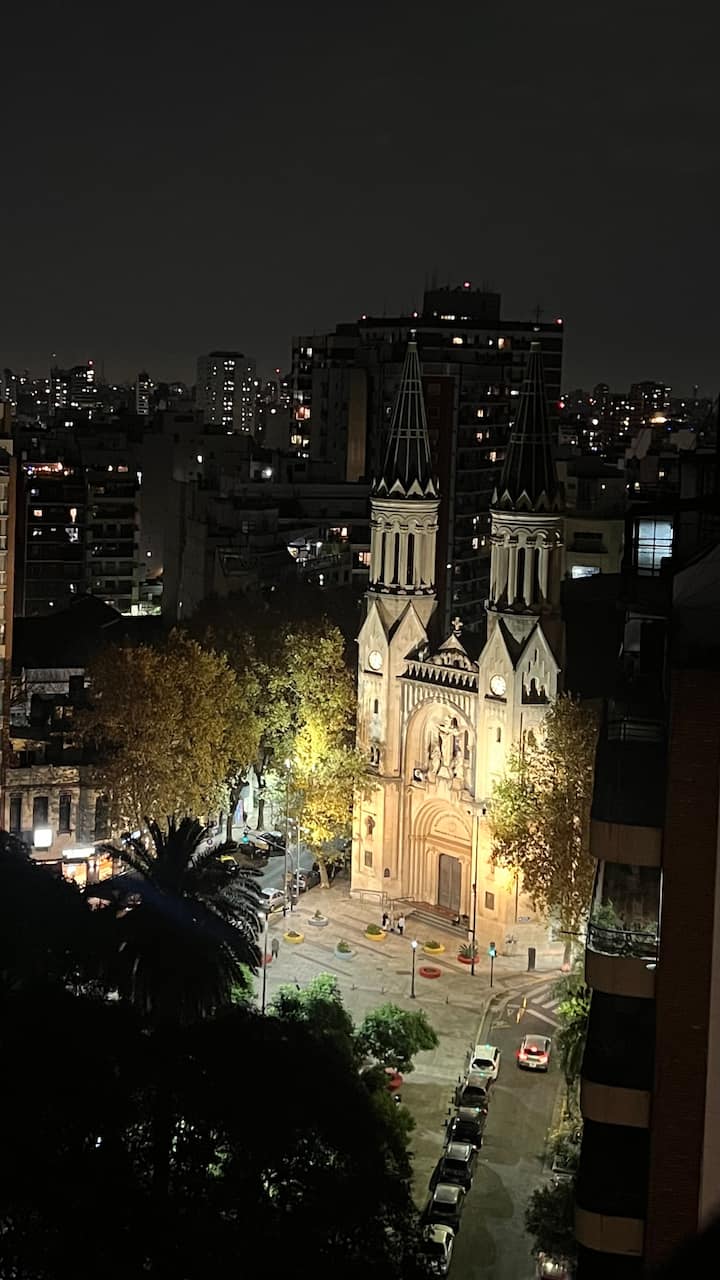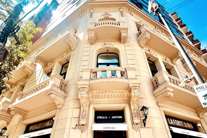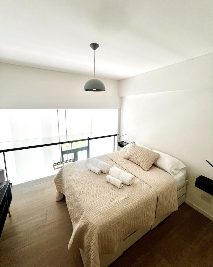 Departamento en edificio con frentes a parque y a una construcción histórica vecina. Se desarrolla en dos niveles; en el 1° piso hay cocina integrada al living con sofá cama de doble, smart TV y escritorio de trabajo, además de balcón al frente y baño de servicio. En el 2° piso se ubica el dormitorio con cama doble, TV y baño en suite. El edificio cuenta con gimnasio, pileta exterior y espacio con parrilla.