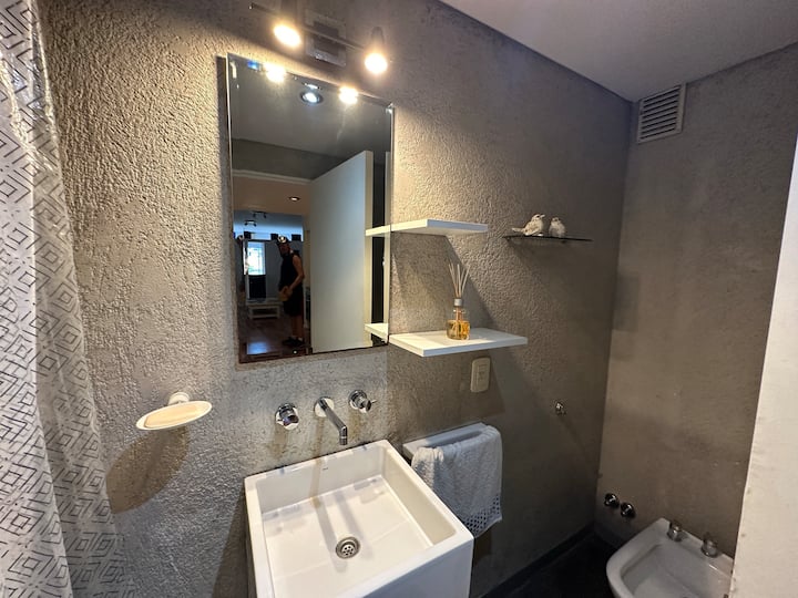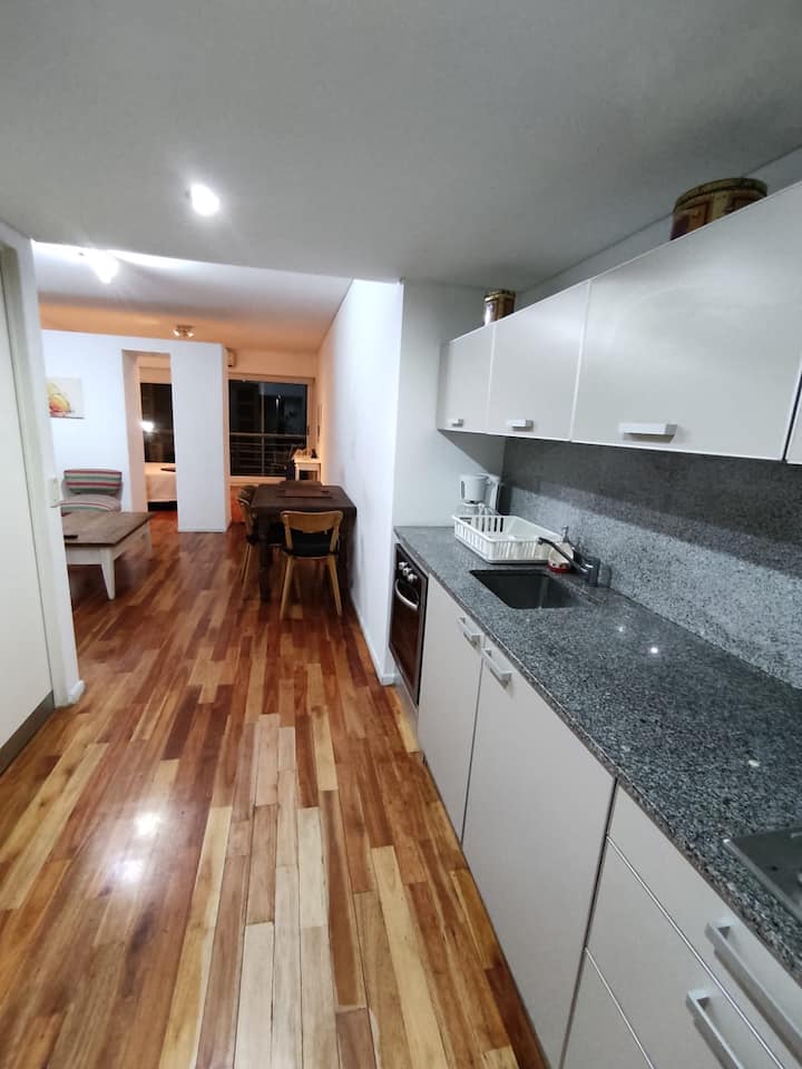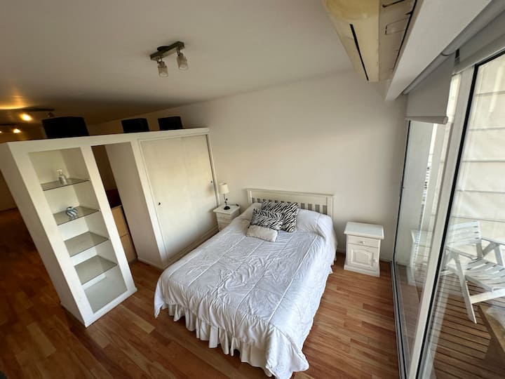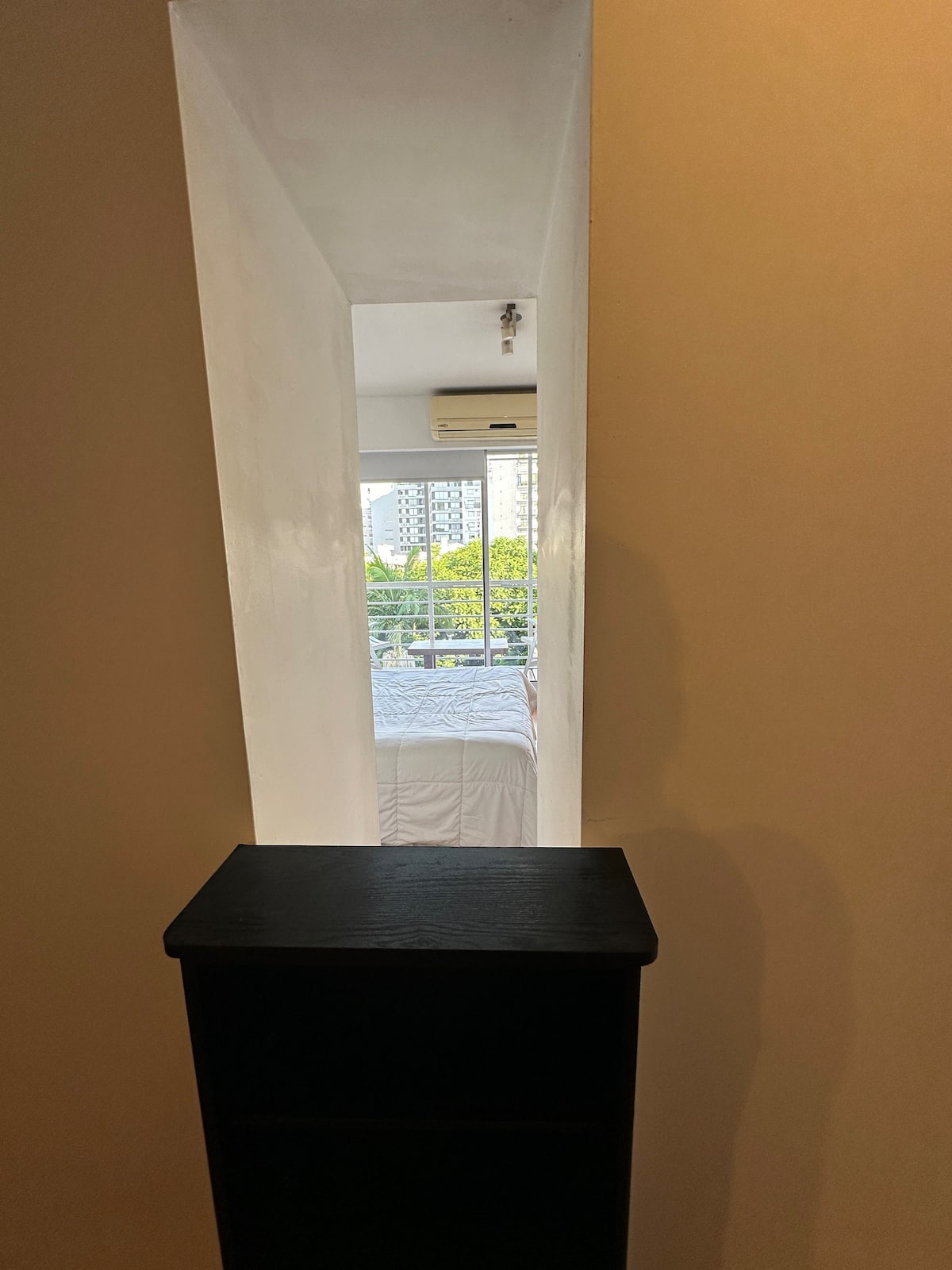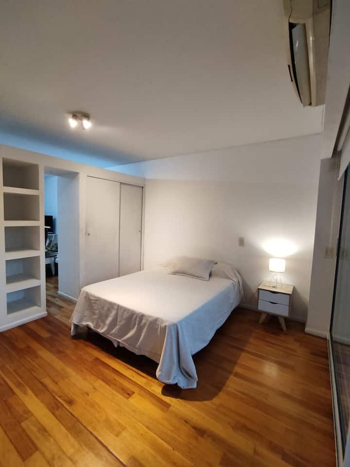 Departamento tipo estudio (Junior One-Bedroom) en Palermo Soho, con división que separa el ambiente dormitorio. Dispone de aire acondicionado y TV en la zona de estar. Tiene balcón con vista al contrafrente y a la pileta, con acceso desde el área de trabajo y el sector dormitorio. El edificio cuenta con pileta, sauna y espacio de trabajo; hay Wi-Fi y servicio de lavandería en el subsuelo.
