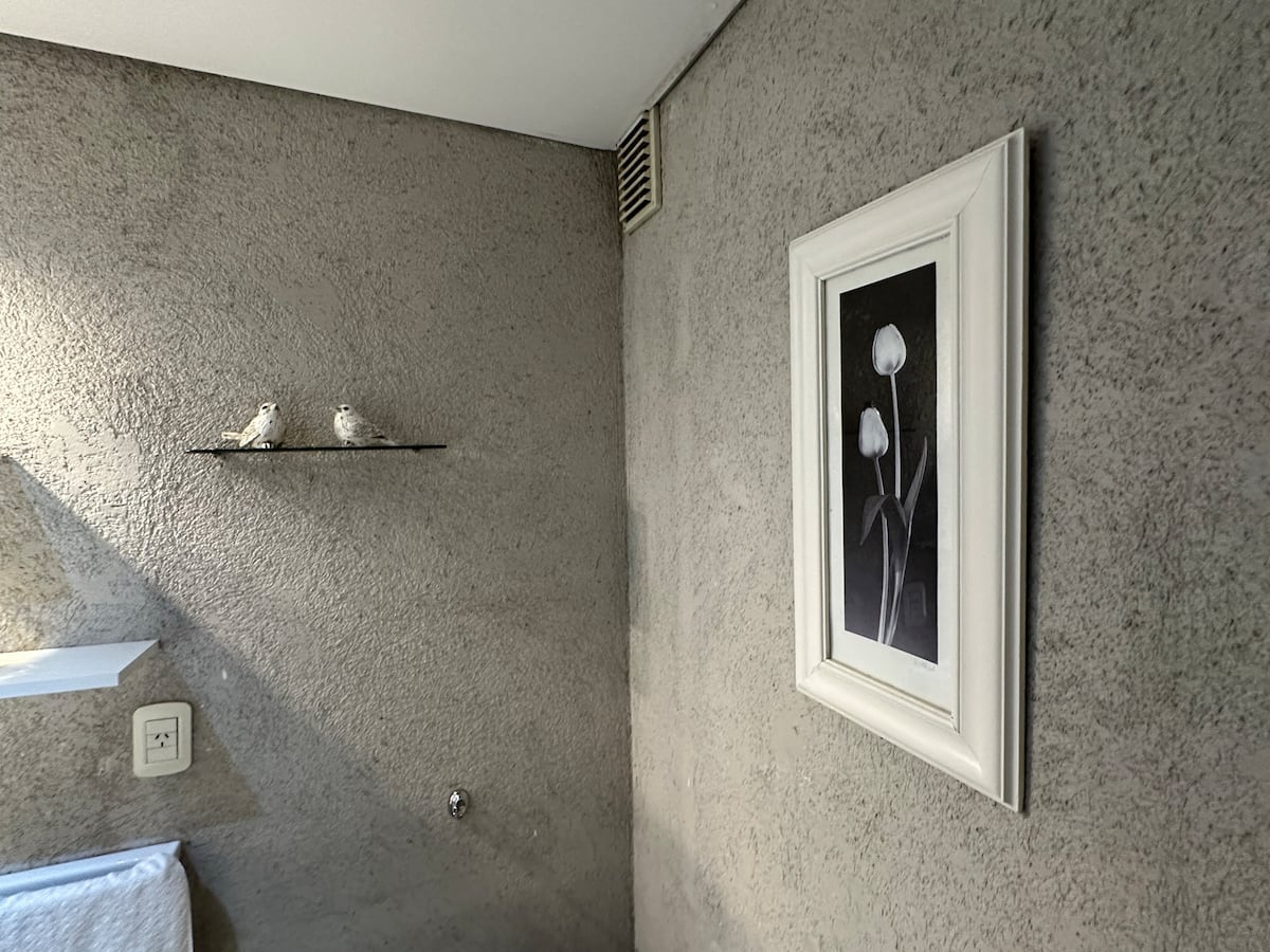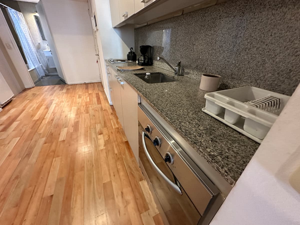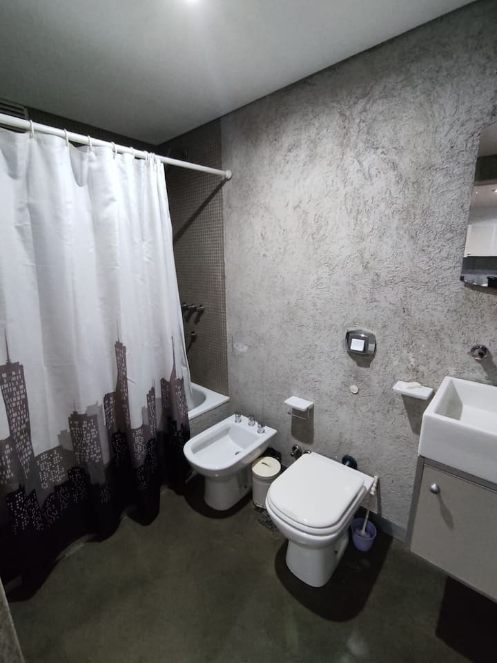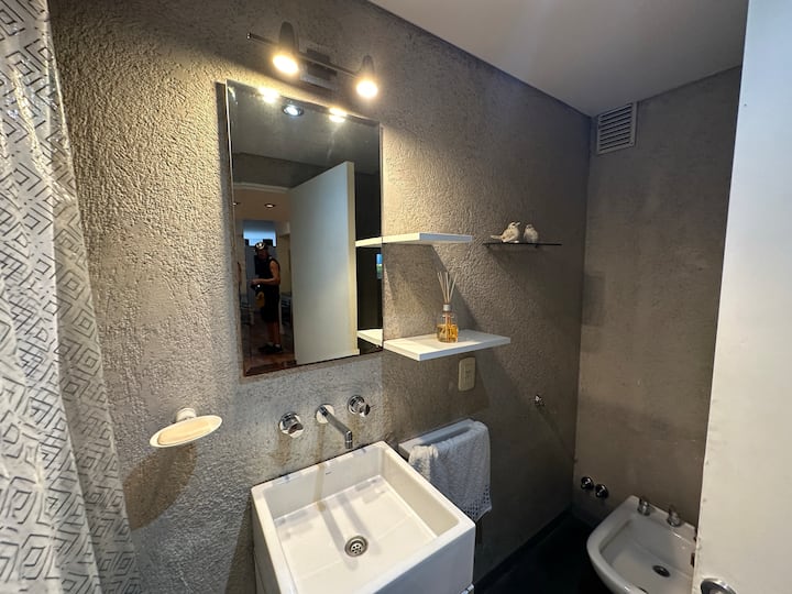 Departamento tipo estudio (Junior One-Bedroom) en Palermo Soho, con división que separa el ambiente dormitorio. Dispone de aire acondicionado y TV en la zona de estar. Tiene balcón con vista al contrafrente y a la pileta, con acceso desde el área de trabajo y el sector dormitorio. El edificio cuenta con pileta, sauna y espacio de trabajo; hay Wi-Fi y servicio de lavandería en el subsuelo.