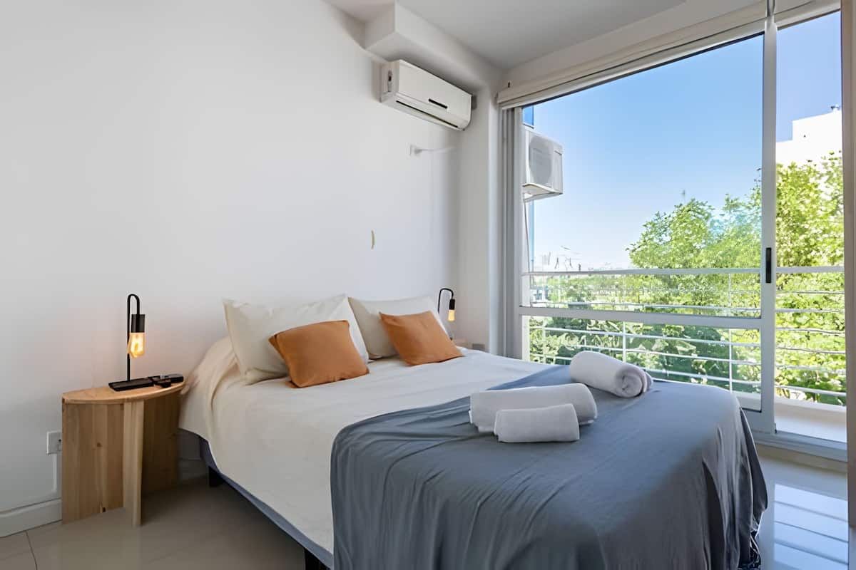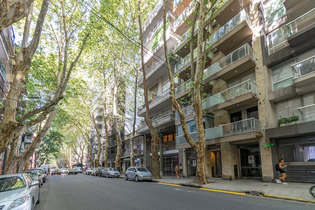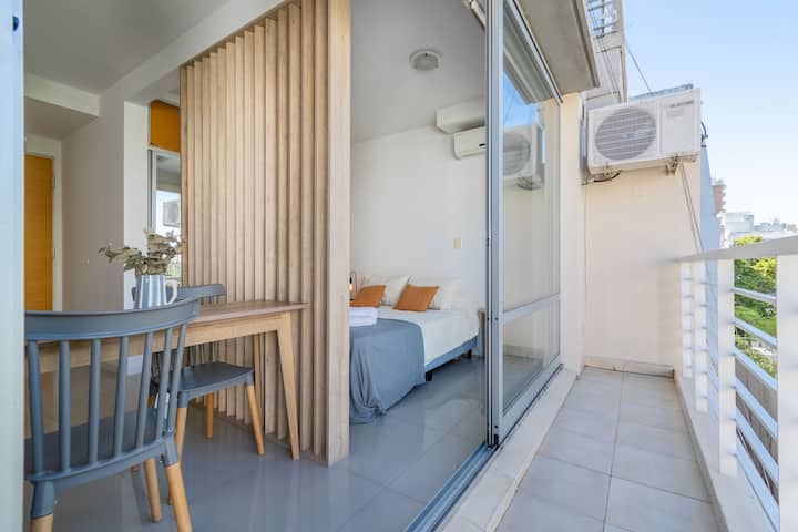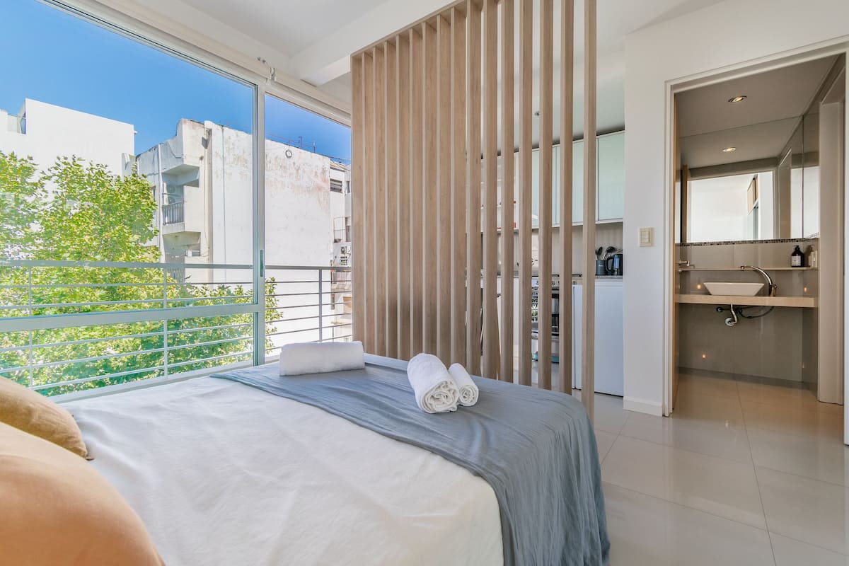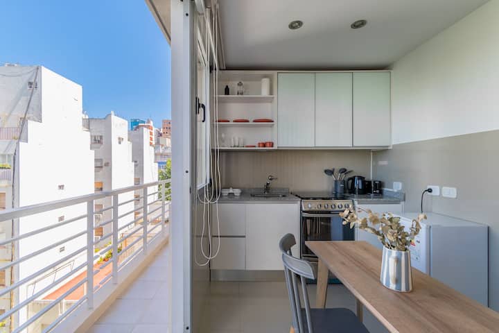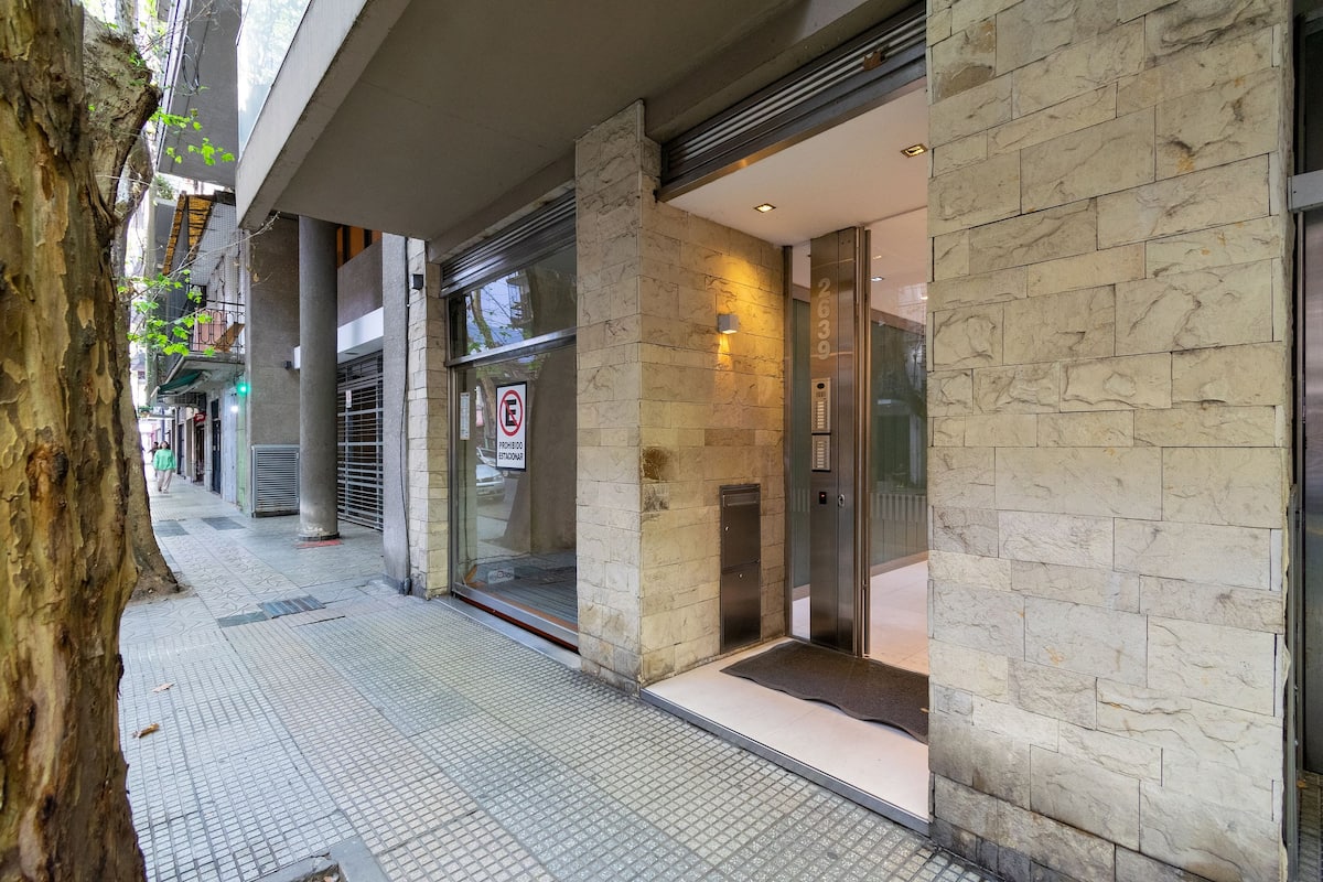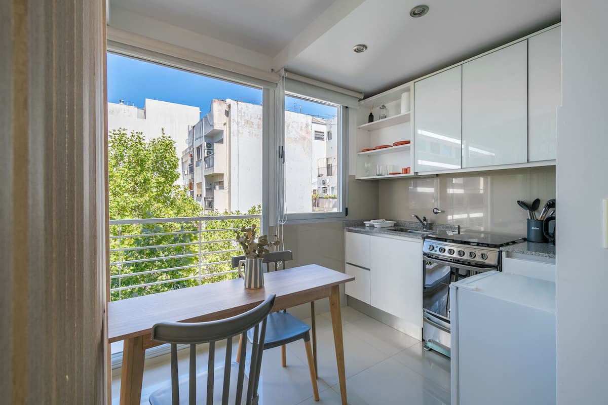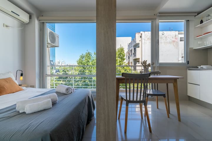 Monoambiente en Palermo, en el contrafrente o pulmón de manzana, al que se describe con balcón y vista verde. Totalmente equipado e incluye Wi‑Fi de 500 Mbps, Smart TV y aire acondicionado. La cocina cuenta con heladera bajo mesada, horno, microondas, pava eléctrica, tostadora y vajilla. El edificio tiene pileta (de diciembre a marzo), parrilla y zona de lavandería con lavarropas y secarropas, con acceso incluido en la estadía.