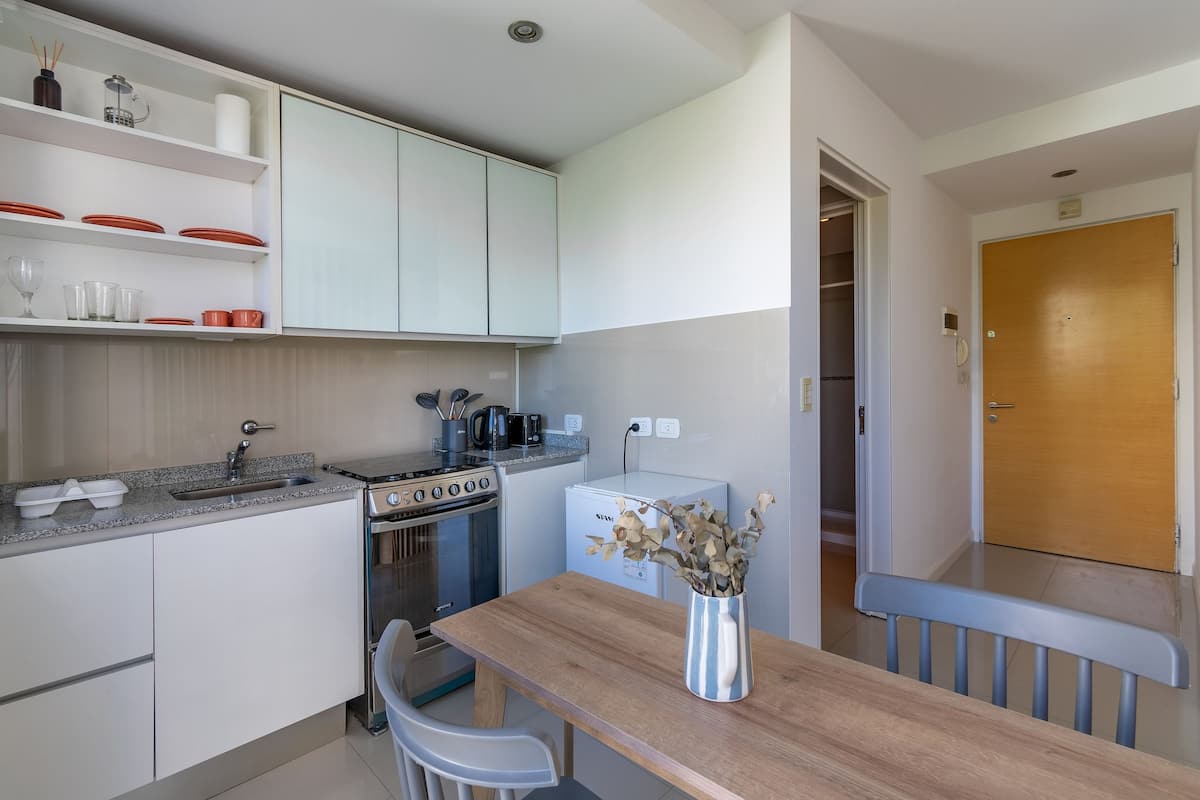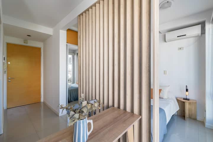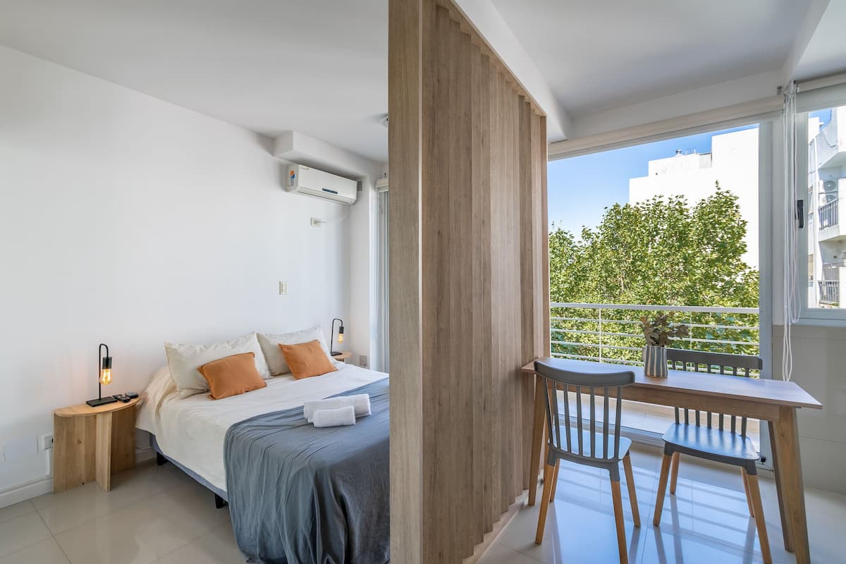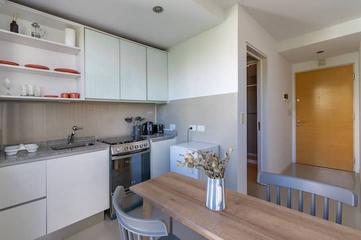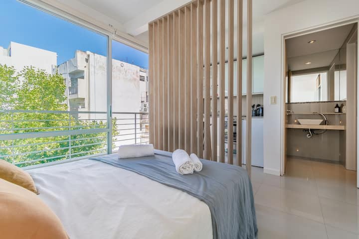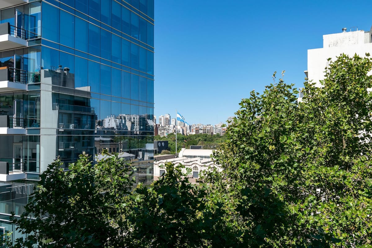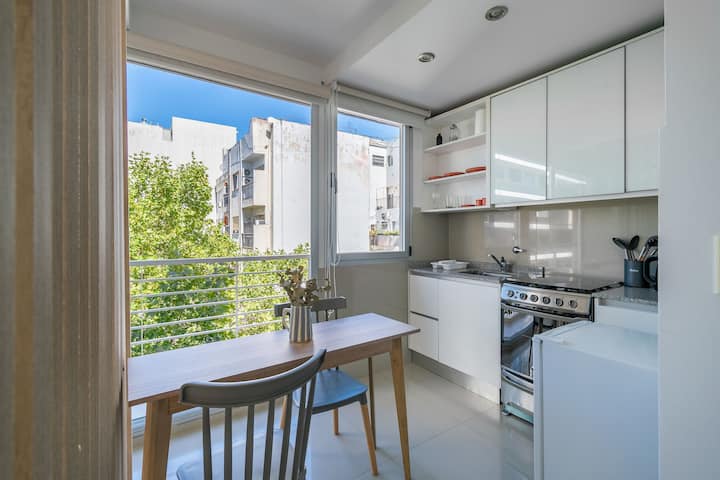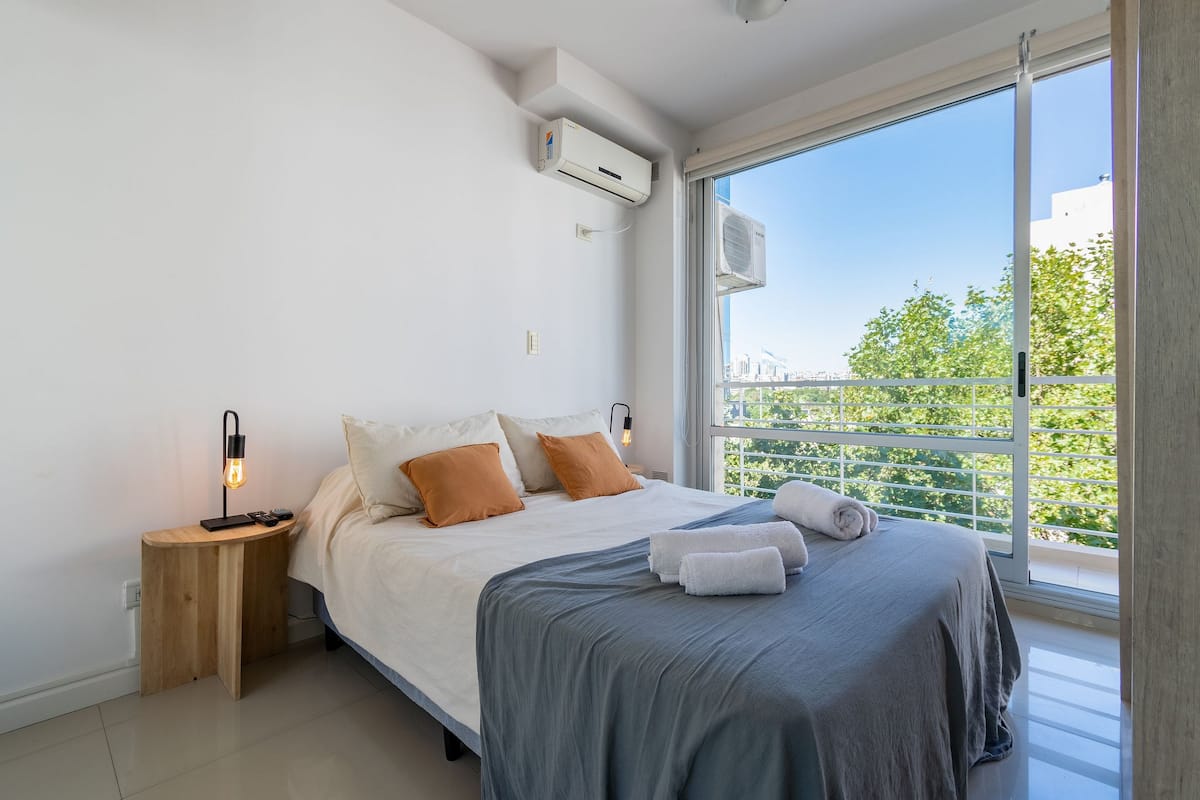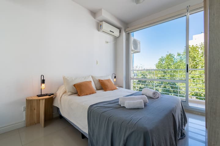 Monoambiente en Palermo, en el contrafrente o pulmón de manzana, al que se describe con balcón y vista verde. Totalmente equipado e incluye Wi‑Fi de 500 Mbps, Smart TV y aire acondicionado. La cocina cuenta con heladera bajo mesada, horno, microondas, pava eléctrica, tostadora y vajilla. El edificio tiene pileta (de diciembre a marzo), parrilla y zona de lavandería con lavarropas y secarropas, con acceso incluido en la estadía.