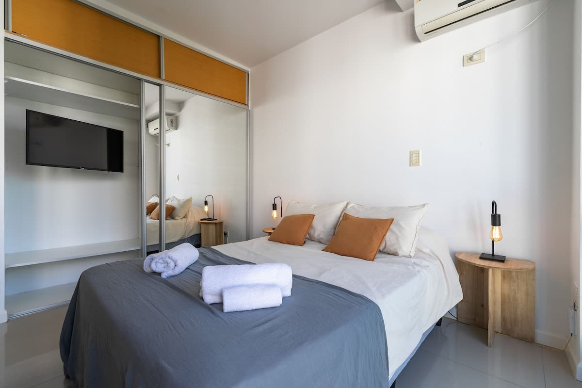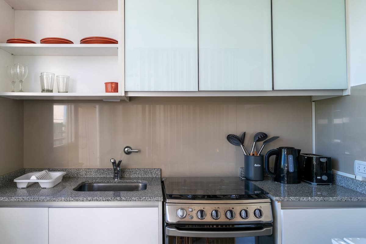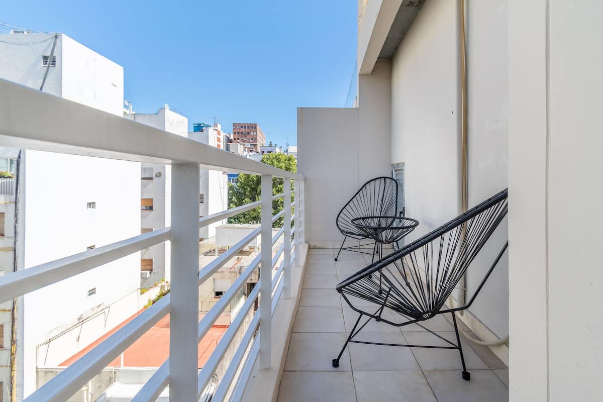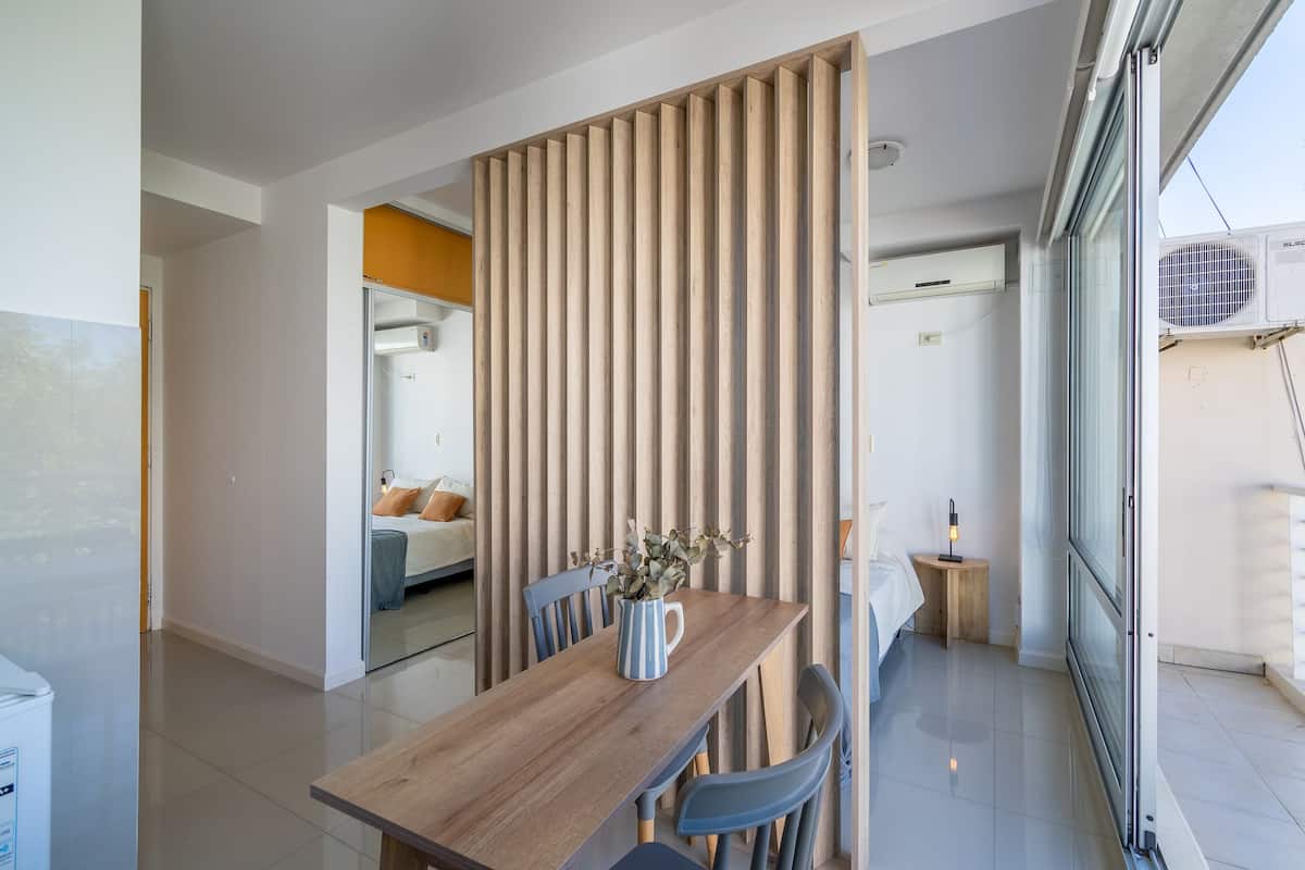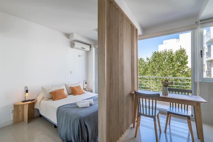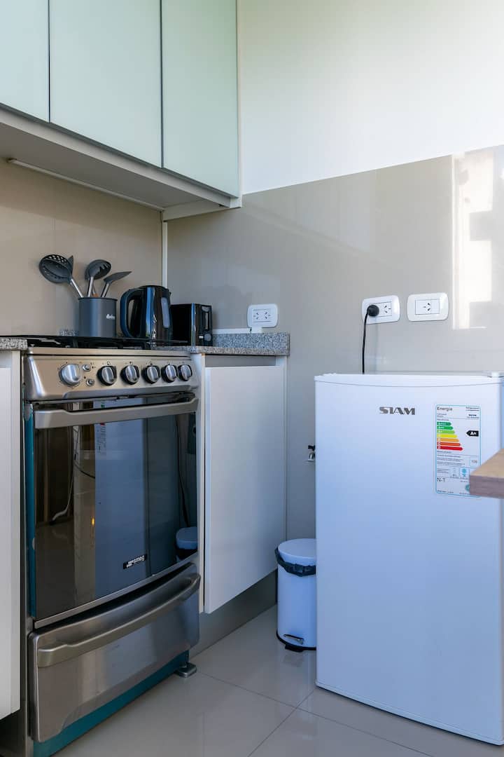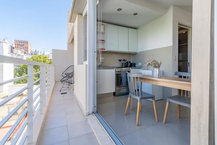 Monoambiente en Palermo, en el contrafrente o pulmón de manzana, al que se describe con balcón y vista verde. Totalmente equipado e incluye Wi‑Fi de 500 Mbps, Smart TV y aire acondicionado. La cocina cuenta con heladera bajo mesada, horno, microondas, pava eléctrica, tostadora y vajilla. El edificio tiene pileta (de diciembre a marzo), parrilla y zona de lavandería con lavarropas y secarropas, con acceso incluido en la estadía.