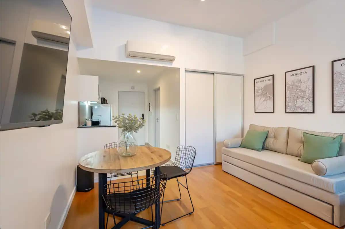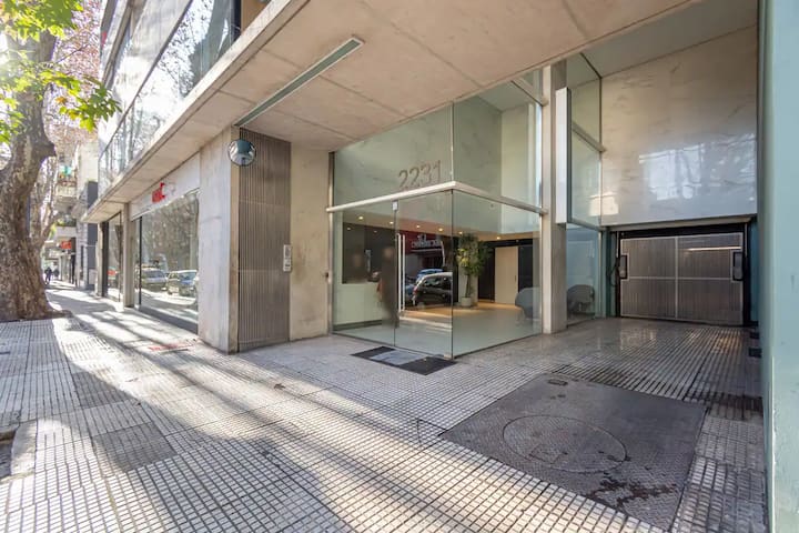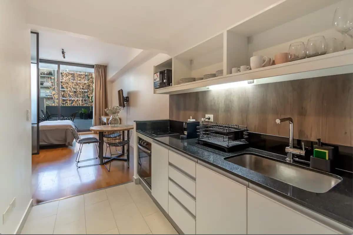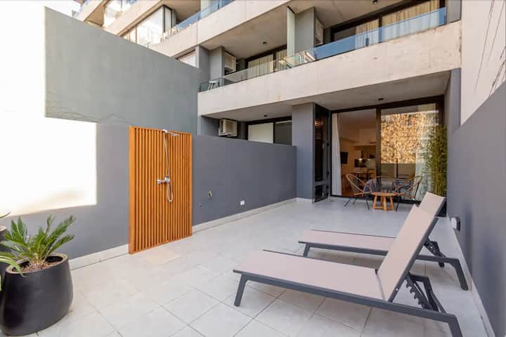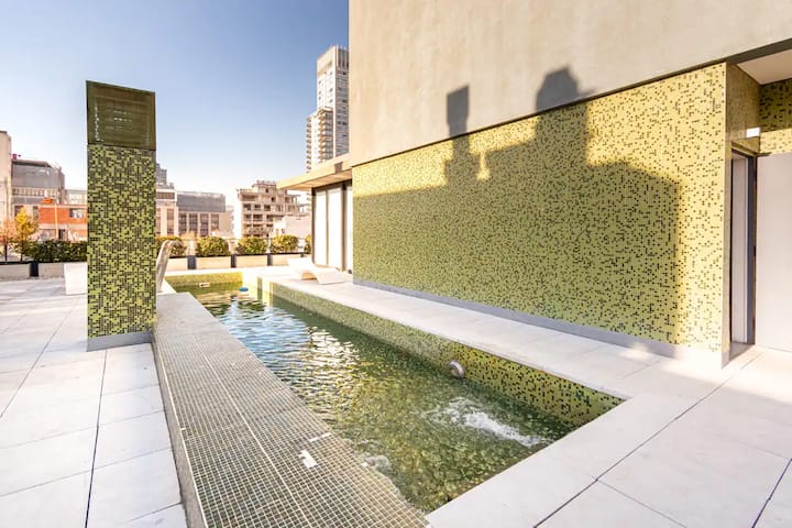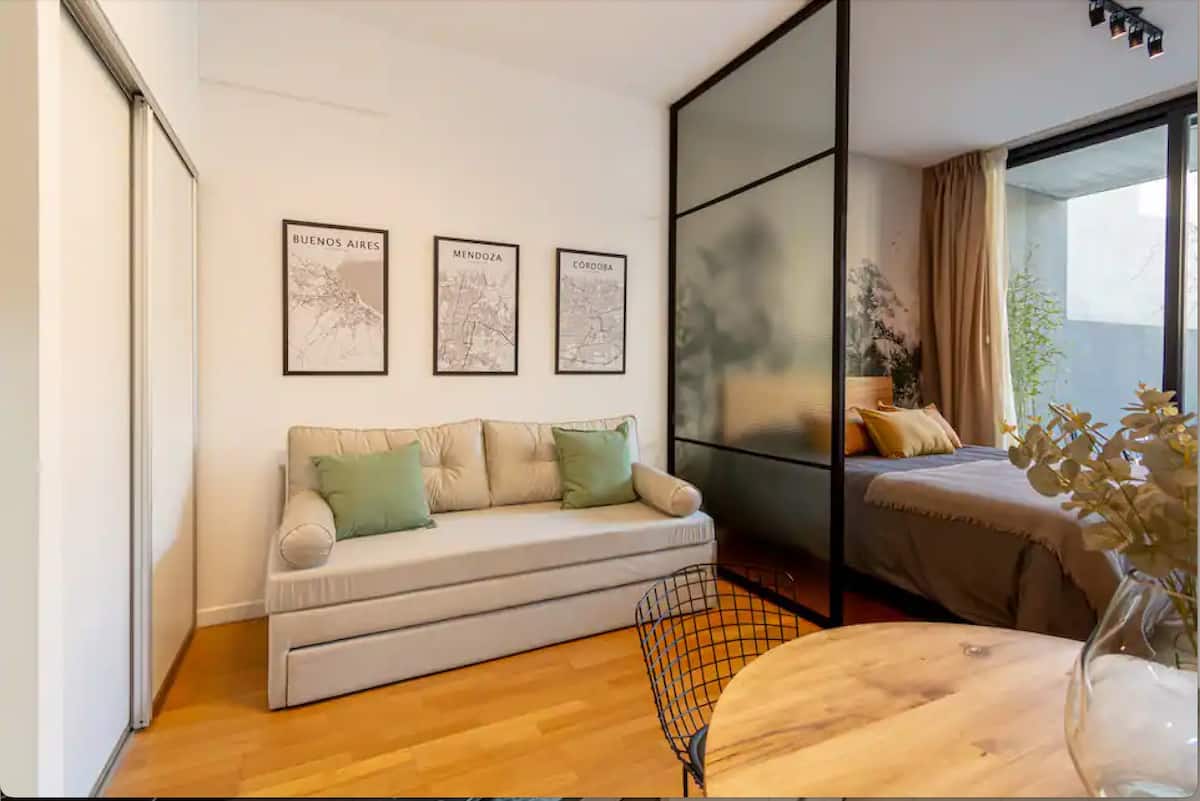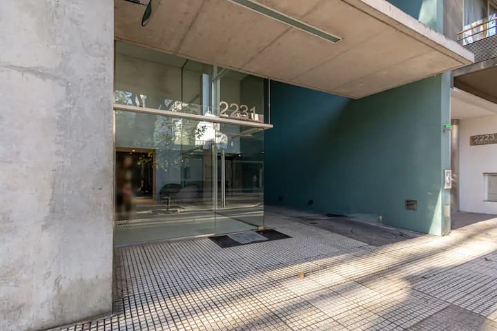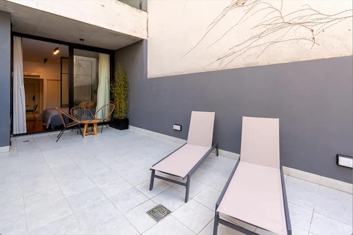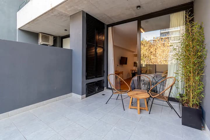 Monoambiente de 1 ambiente en Palermo, totalmente equipado. Cuenta con ventana amplia y patio privado con ducha. El edificio dispone de piscina, sauna, jacuzzi y gimnasio, con personal de seguridad 24 horas. Está a pocos bloques de Plaza Italia y La Rural, y a 3 cuadras del subte. No incluye plancha. Tiene cama plegable en sofá para un tercer huésped. No se permite el uso de la parrilla.