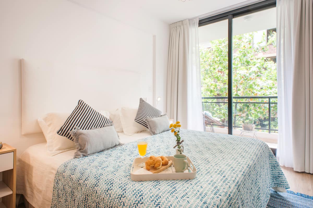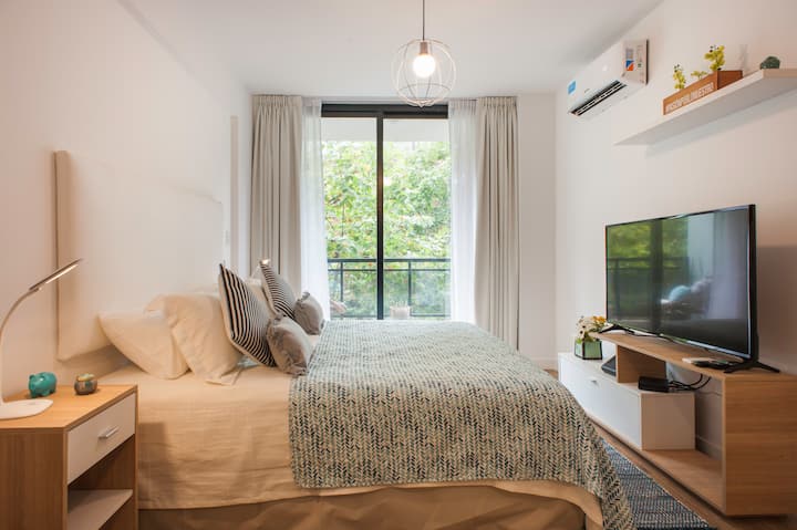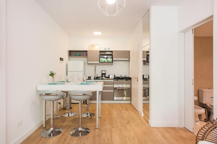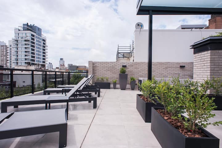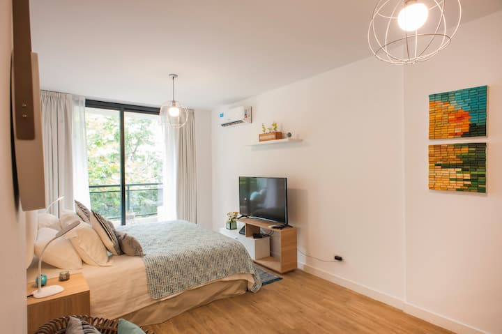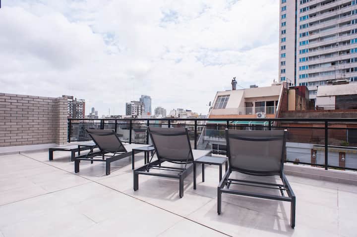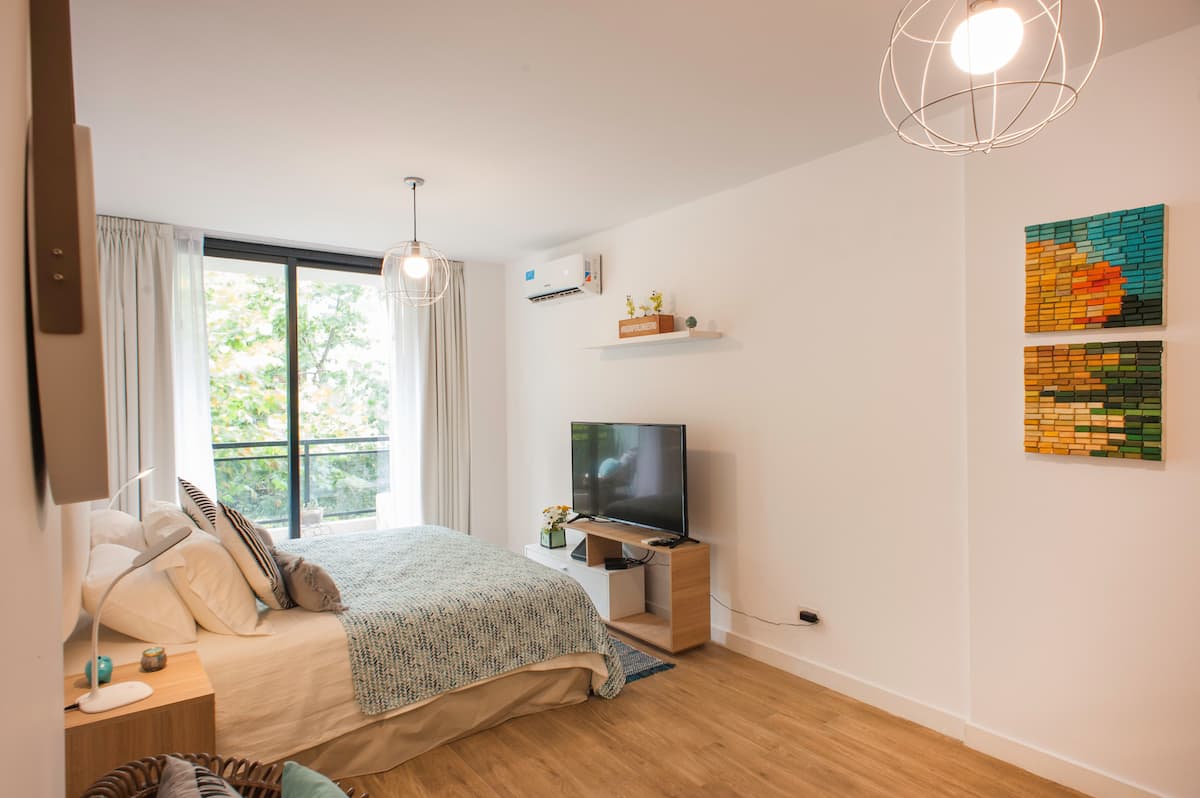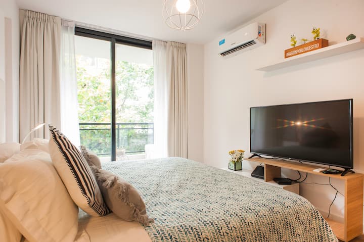 Departamento tipo estudio en Palermo Soho, Palermo. Cuenta con cocina completa, Wi‑Fi de 1000 MB y Smart TV de 50 pulgadas. El acceso al departamento es con código y ofrece self check-in en forma presencial o autónoma, según disponibilidad. El edificio tiene solárium y laundry; la parrilla está disponible solo para estadías de más de 29 días. Parking opcional sujeto a disponibilidad, solo para autos.