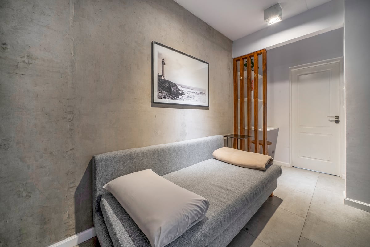 Departamento de 1 dormitorio en Palermo Polo. El dormitorio cuenta con cama, y el living tiene sofá cama. La cocina está equipada y el baño es moderno. En el piso superior hay una terraza y en la planta baja se encuentran las instalaciones de lavandería; ambas áreas comparten una terraza. La publicación menciona acceso a comercios, gimnasios y estacionamientos en la zona.