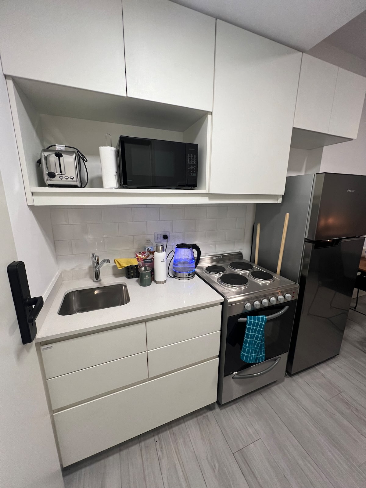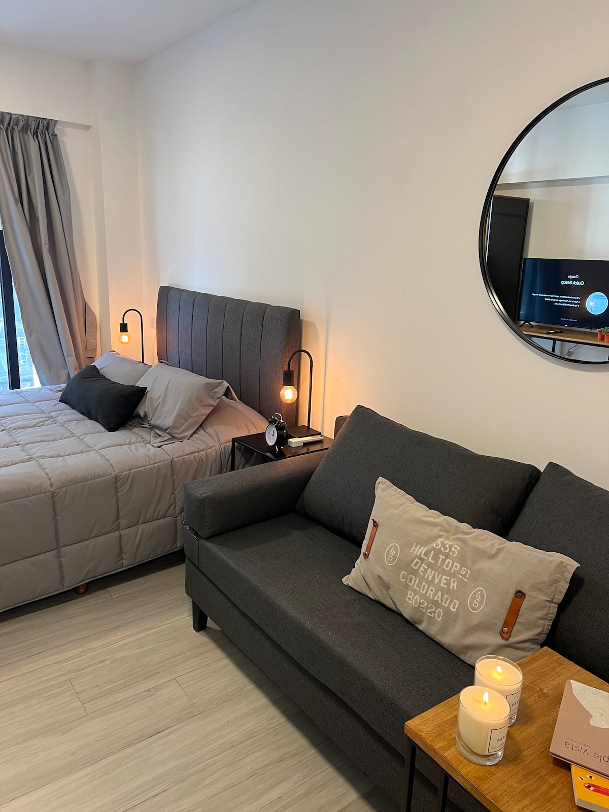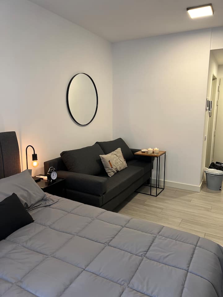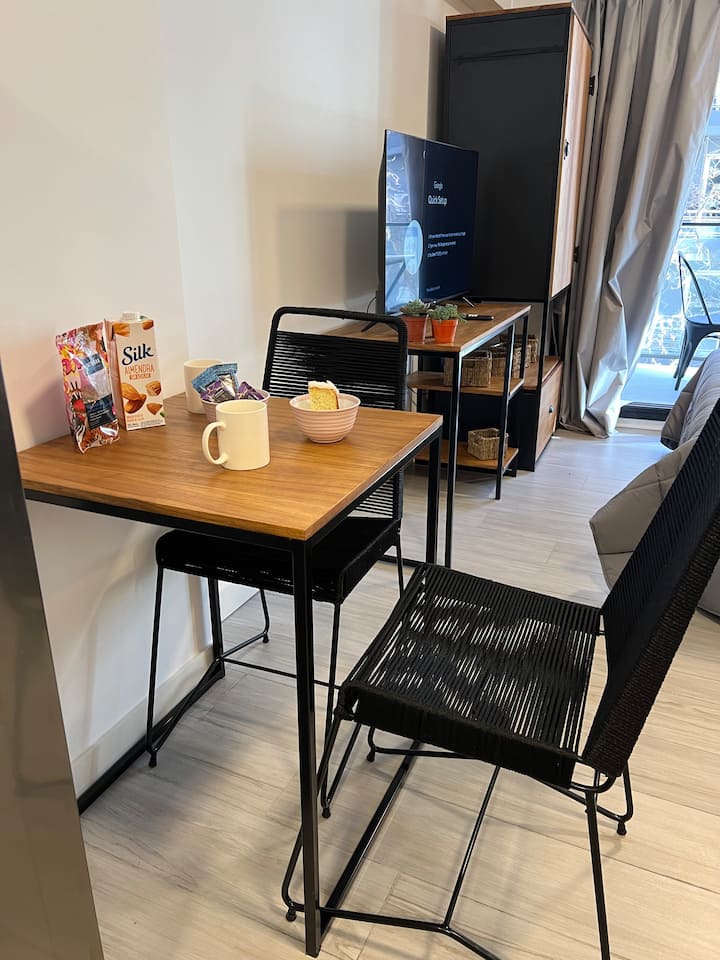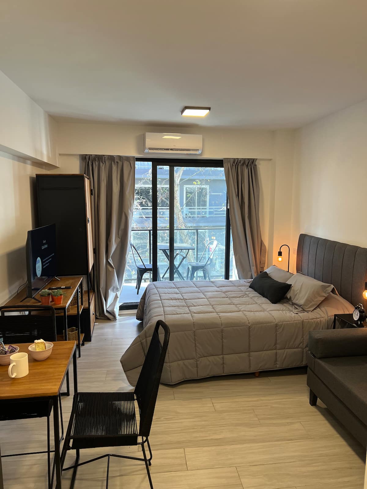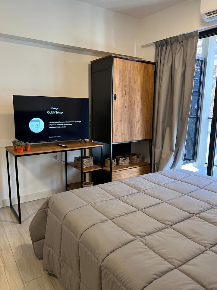 Monoambiente a estrenar en Palermo Soho, con equipamiento nuevo. Incluye sábanas, toallas y artículos de cocina, pava eléctrica, tostadora, microondas y TV LED de 42 pulgadas, con cama doble y sofá cama. El edificio cuenta con internet, coworking, jacuzzi, laundry y gimnasio, y seguridad con totem.