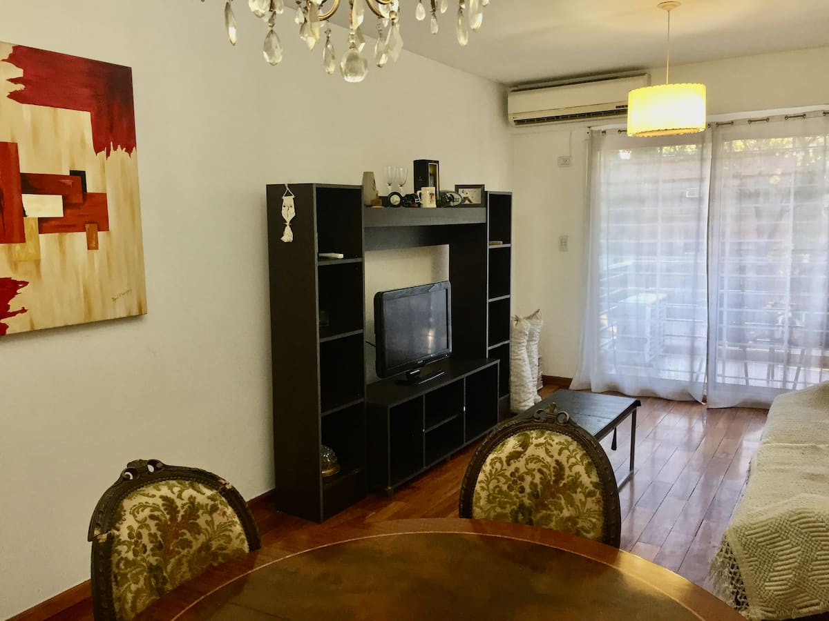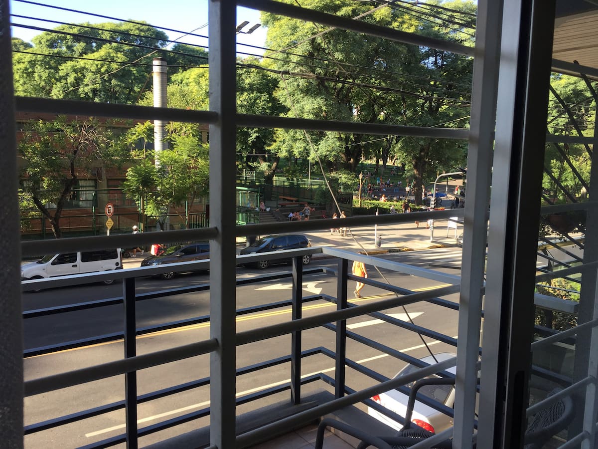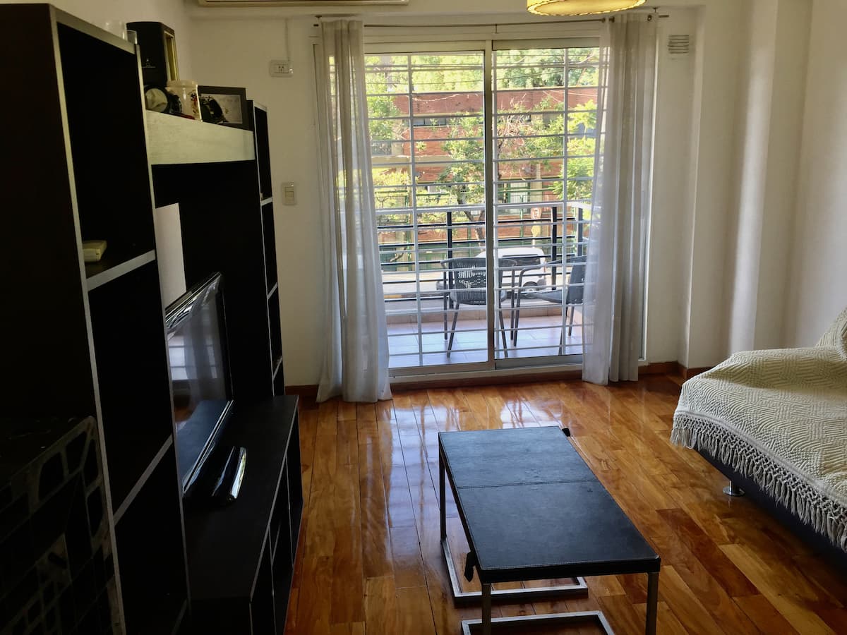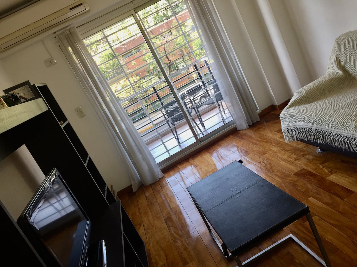 Departamento de 2 ambientes con 1 dormitorio, en un edificio moderno, en 1er piso. Da al frente con vista al Parque Chacabuco y cuenta con balcón en el estar; cocina completa y mesa con desayunador. Incluye TV de 32" con Chromecast e internet. El dormitorio tiene cama queen, placard y ventana al contrafrente. El ingreso está previsto de 9 a 19.