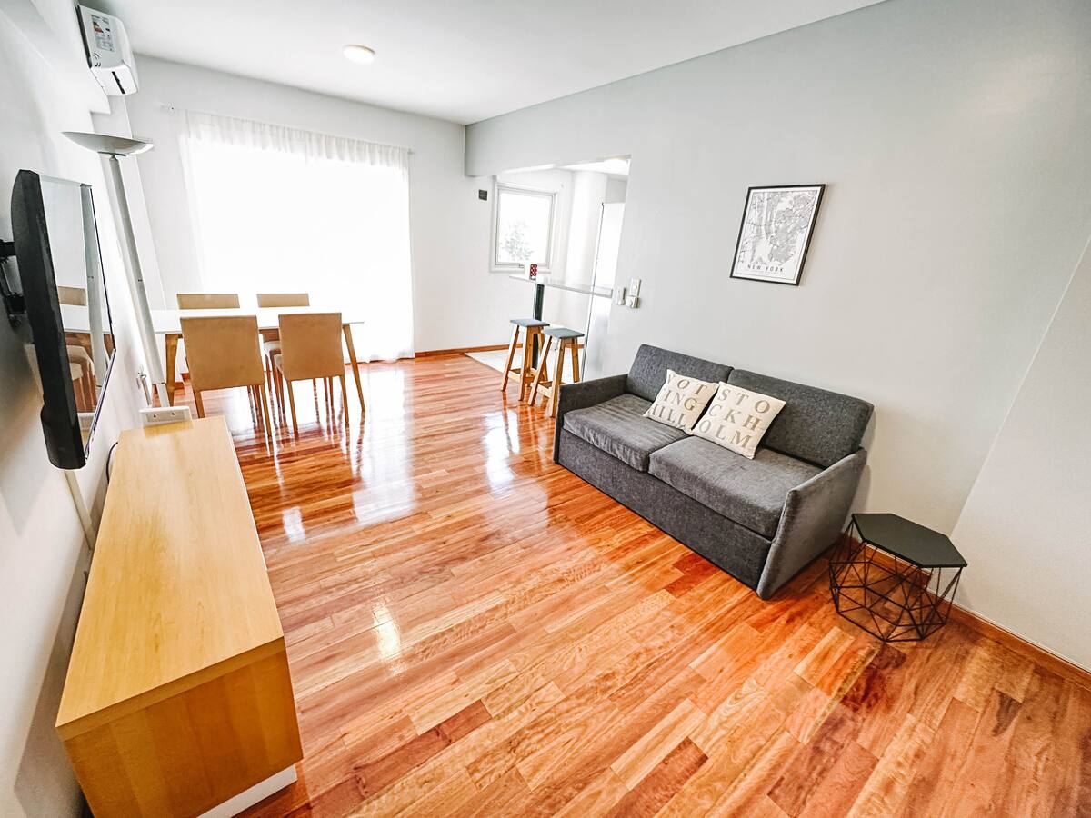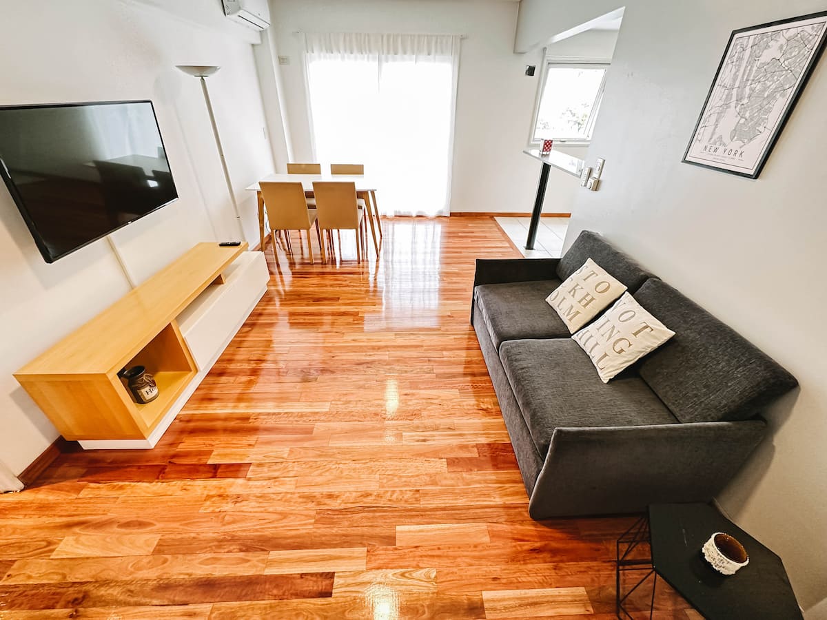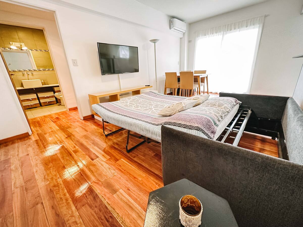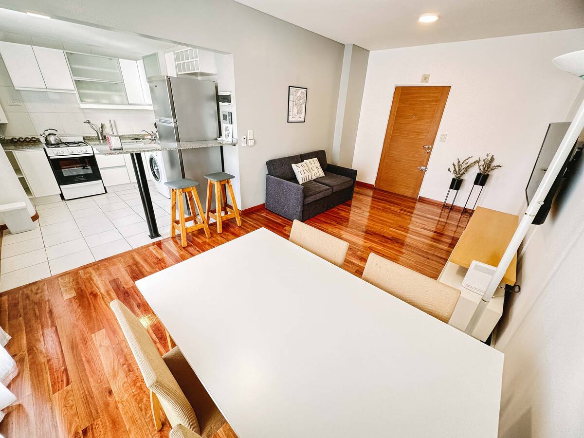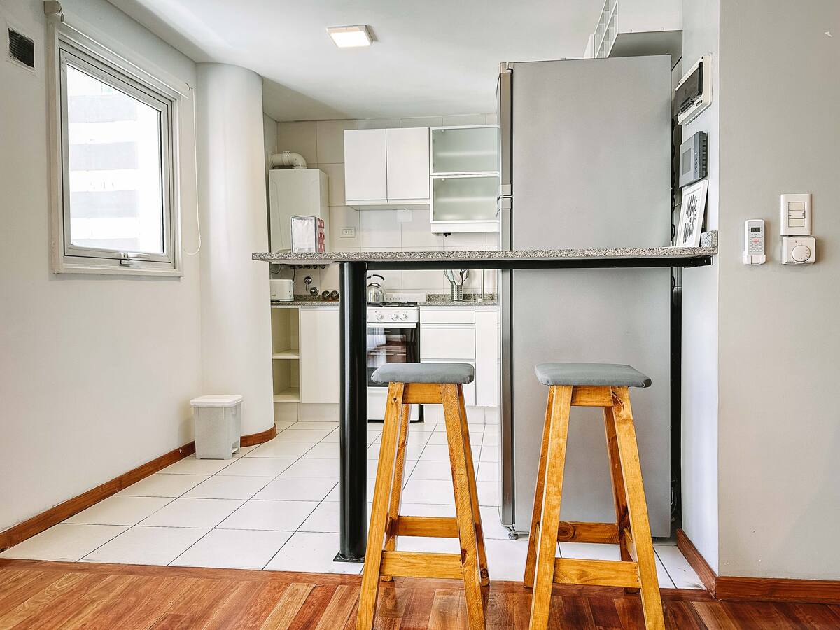 Departamento de 2 ambientes en Parque Chacabuco con acceso por ascensor. El living da a un balcón y cuenta con ventana al exterior; incluye sofá que puede transformarse en cama de 2 plazas y mesa para 4 personas. Tiene cocina semintegrada con barra y equipamiento completo de vajilla, electrodomésticos y elementos de limpieza. El dormitorio dispone de cama doble, placard con puertas espejadas hasta el piso, Smart TV y escritorio; el baño es completo con bañera. Todos los ambientes dan al exterior