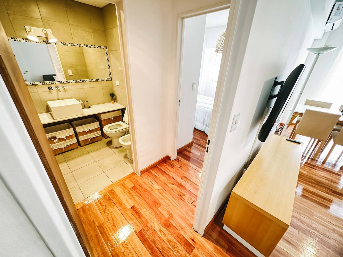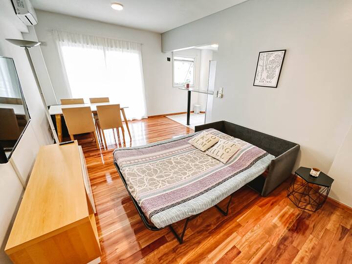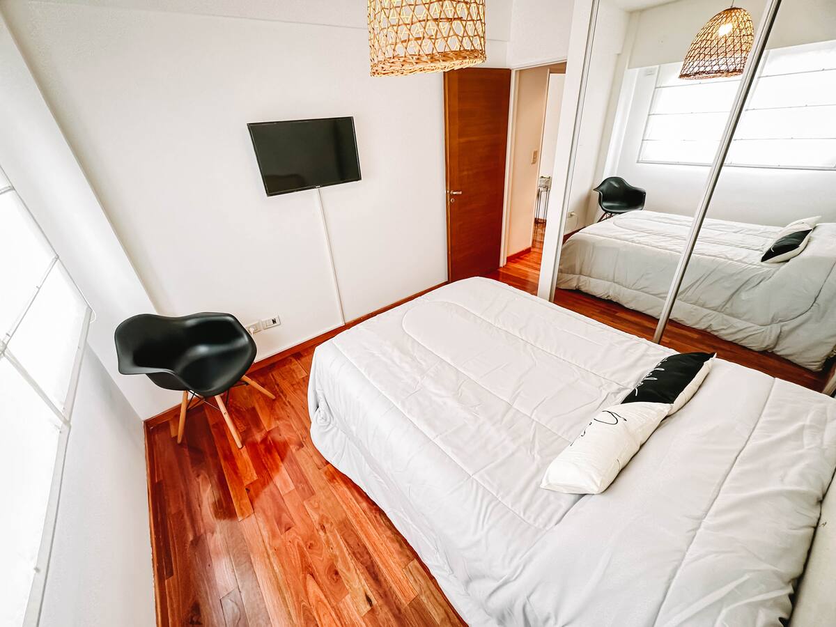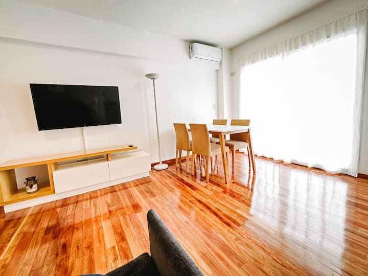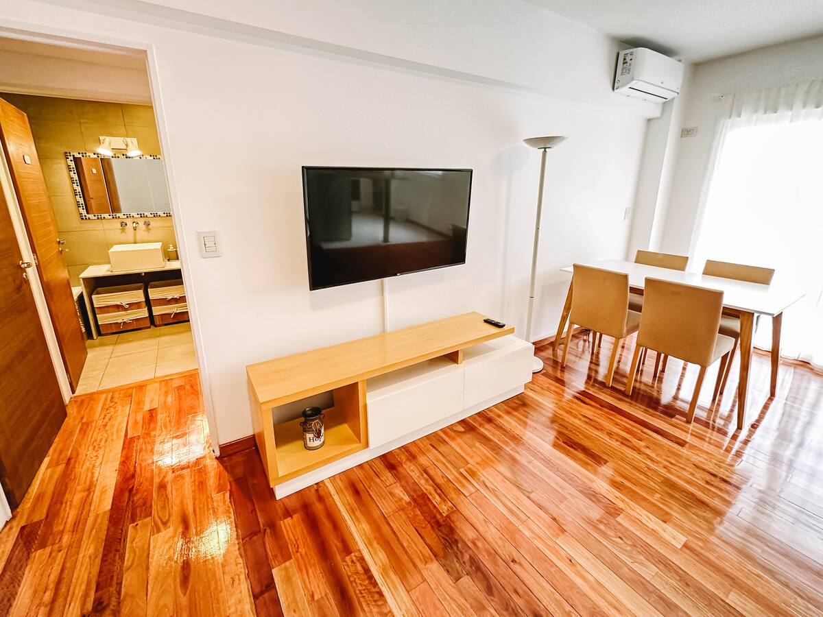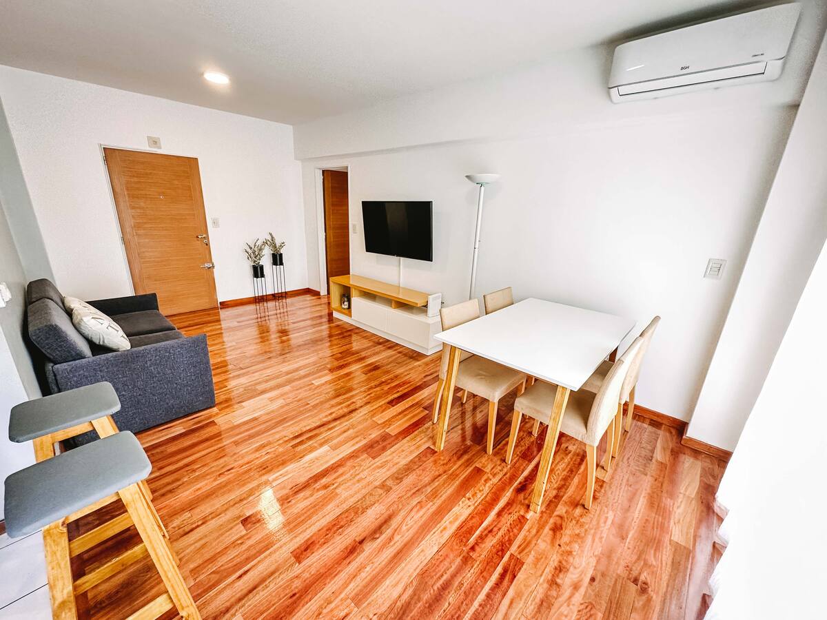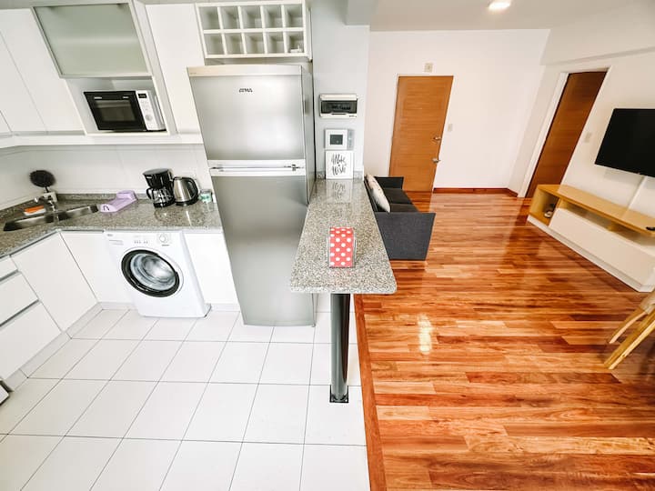 Departamento de 2 ambientes en Parque Chacabuco con acceso por ascensor. El living da a un balcón y cuenta con ventana al exterior; incluye sofá que puede transformarse en cama de 2 plazas y mesa para 4 personas. Tiene cocina semintegrada con barra y equipamiento completo de vajilla, electrodomésticos y elementos de limpieza. El dormitorio dispone de cama doble, placard con puertas espejadas hasta el piso, Smart TV y escritorio; el baño es completo con bañera. Todos los ambientes dan al exterior