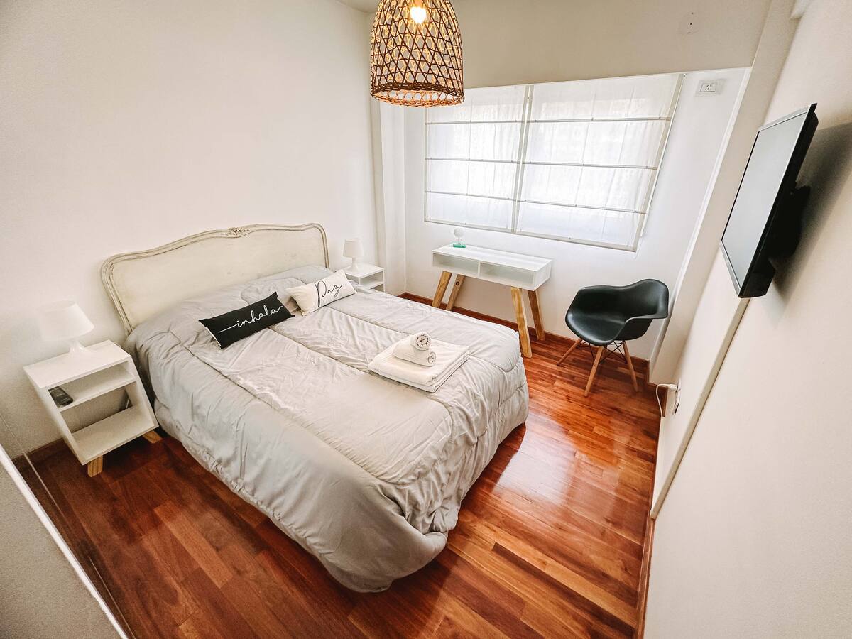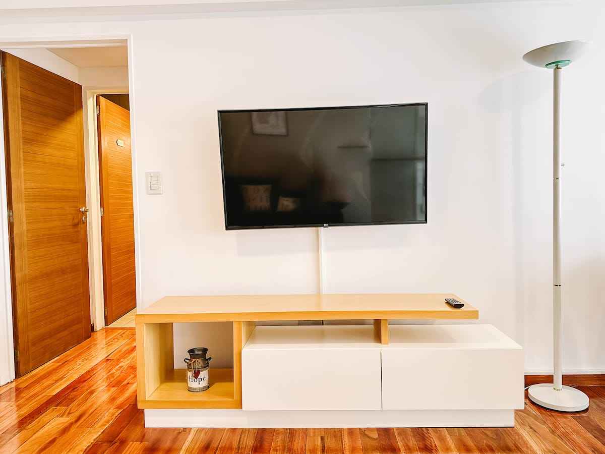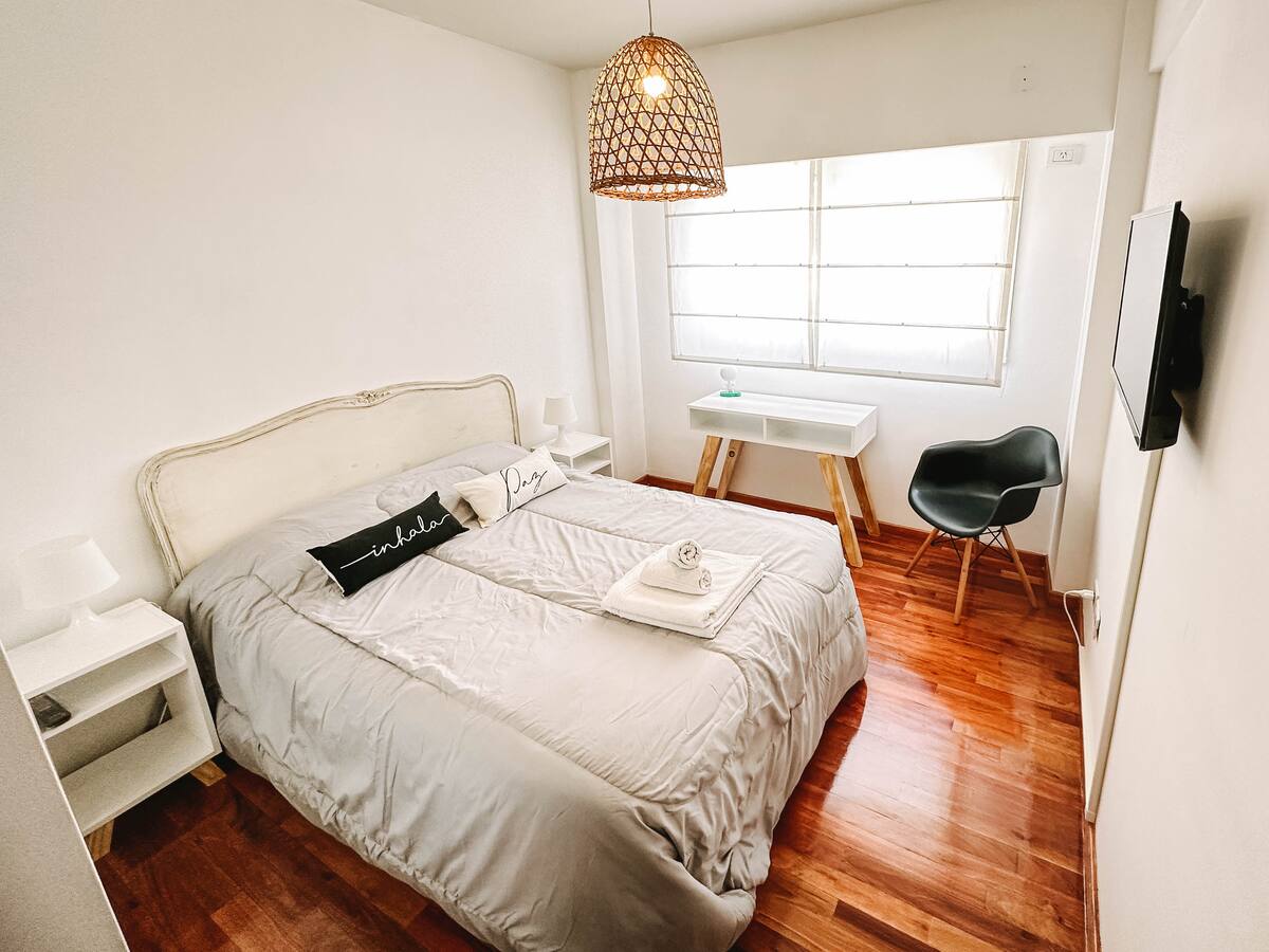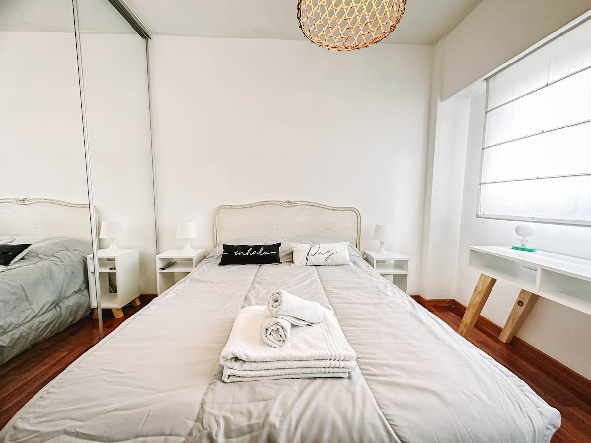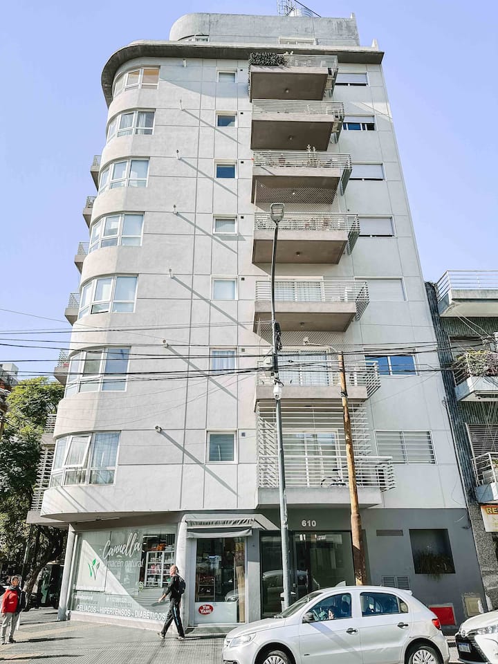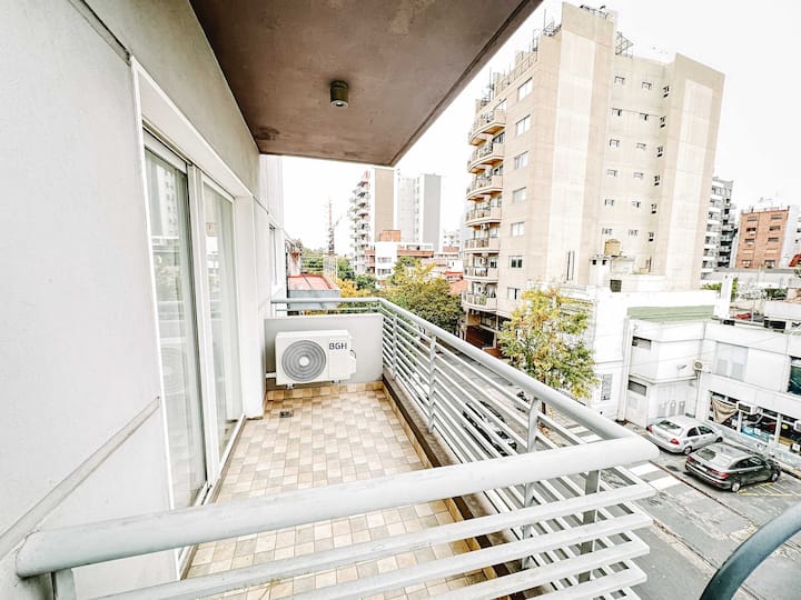 Departamento de 2 ambientes en Parque Chacabuco con acceso por ascensor. El living da a un balcón y cuenta con ventana al exterior; incluye sofá que puede transformarse en cama de 2 plazas y mesa para 4 personas. Tiene cocina semintegrada con barra y equipamiento completo de vajilla, electrodomésticos y elementos de limpieza. El dormitorio dispone de cama doble, placard con puertas espejadas hasta el piso, Smart TV y escritorio; el baño es completo con bañera. Todos los ambientes dan al exterior