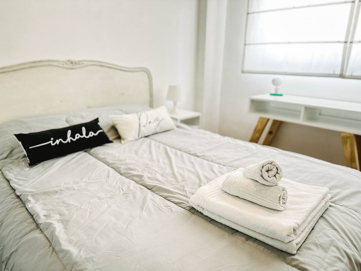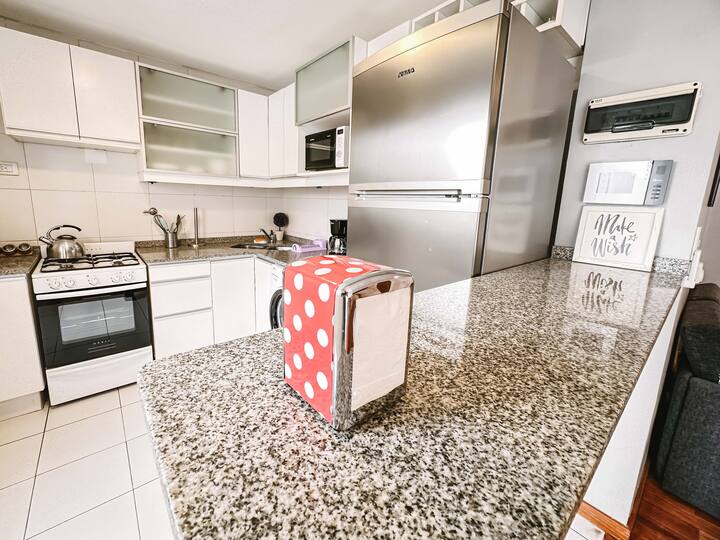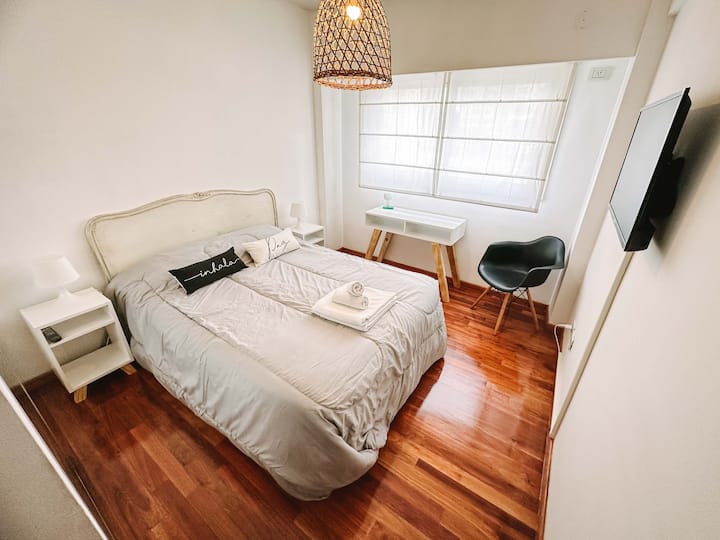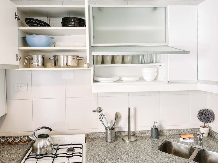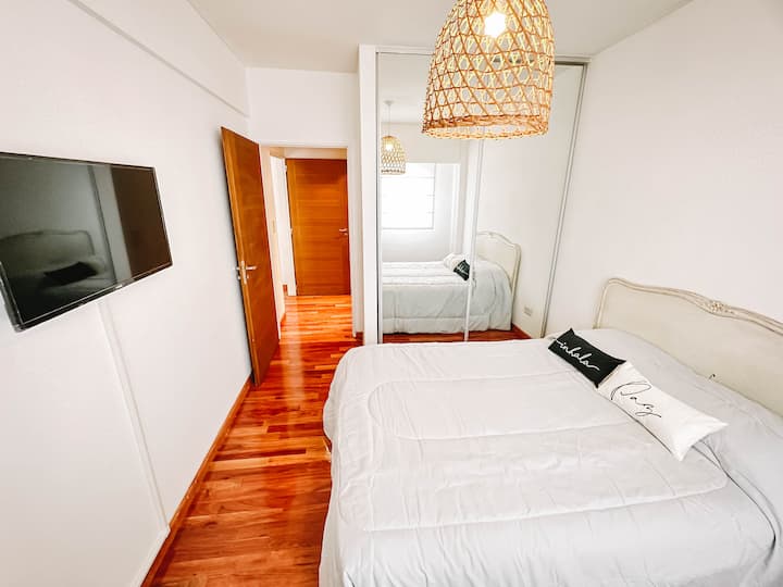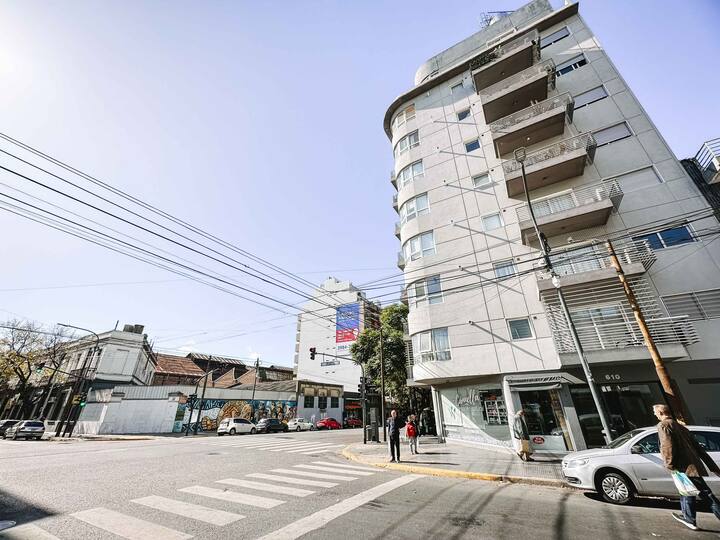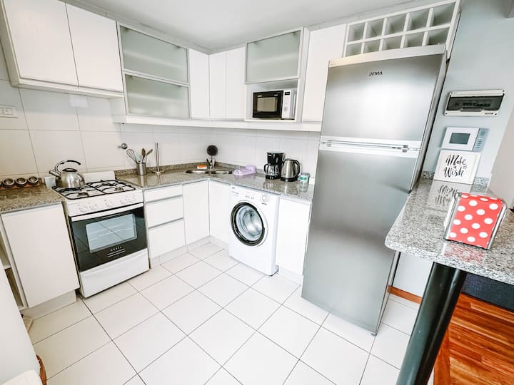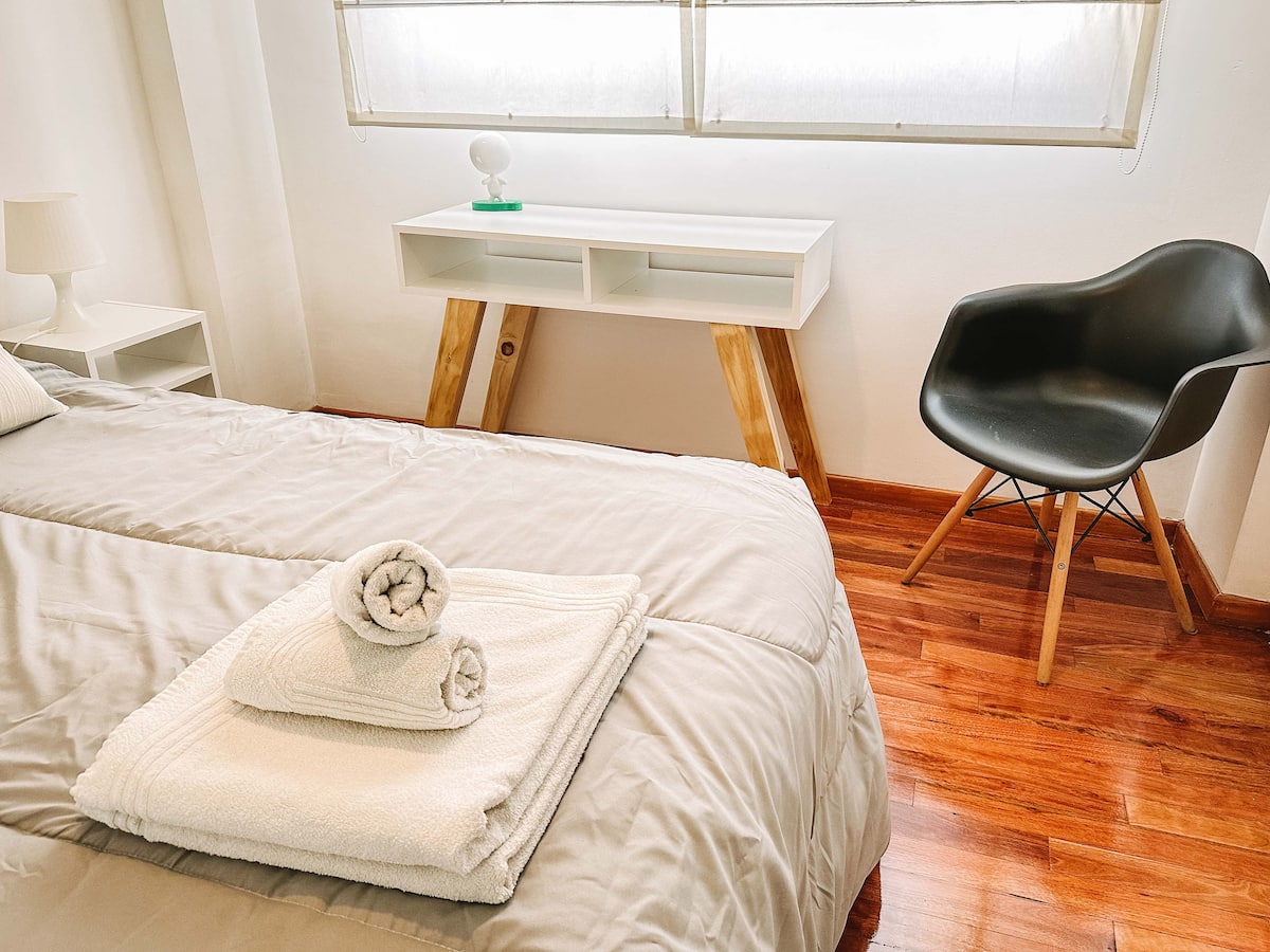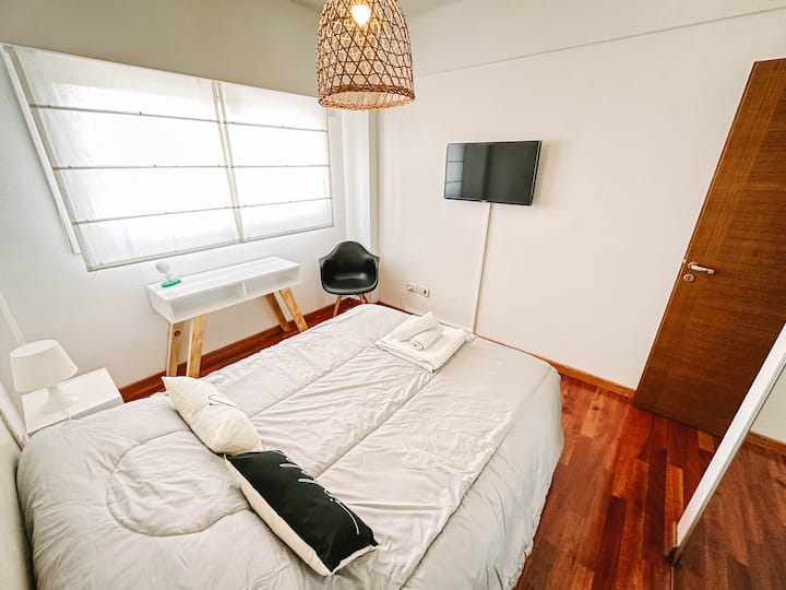 Departamento de 2 ambientes en Parque Chacabuco con acceso por ascensor. El living da a un balcón y cuenta con ventana al exterior; incluye sofá que puede transformarse en cama de 2 plazas y mesa para 4 personas. Tiene cocina semintegrada con barra y equipamiento completo de vajilla, electrodomésticos y elementos de limpieza. El dormitorio dispone de cama doble, placard con puertas espejadas hasta el piso, Smart TV y escritorio; el baño es completo con bañera. Todos los ambientes dan al exterior