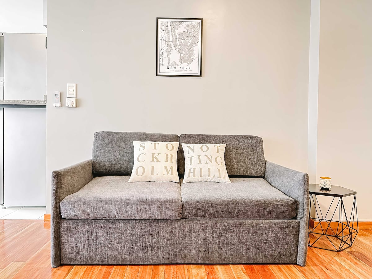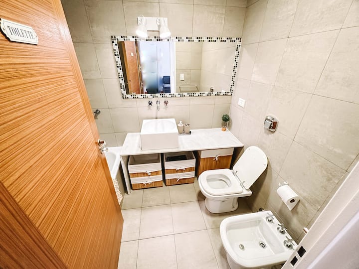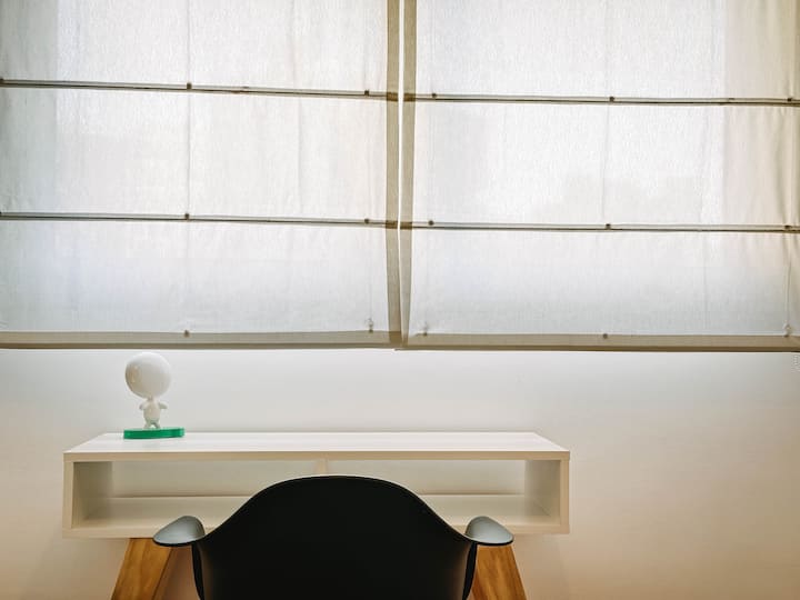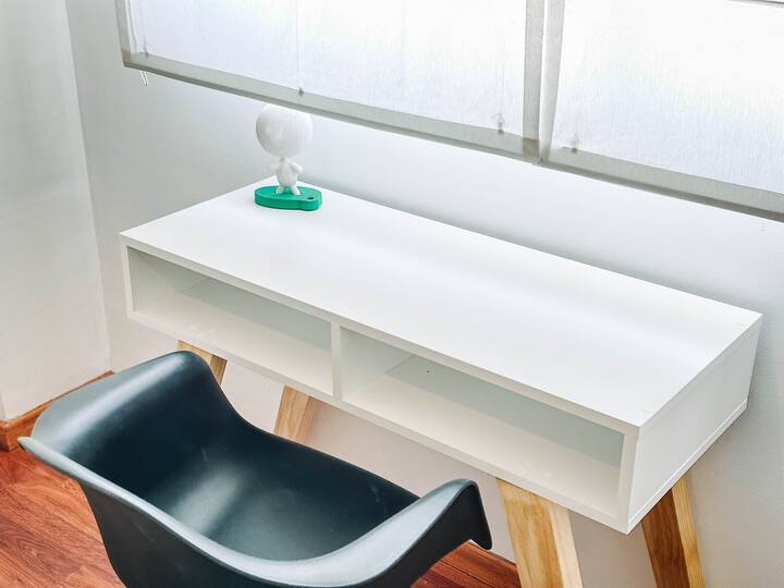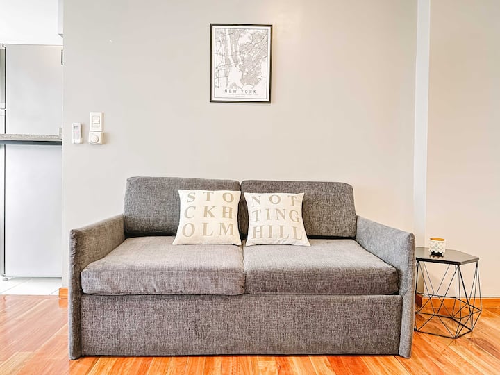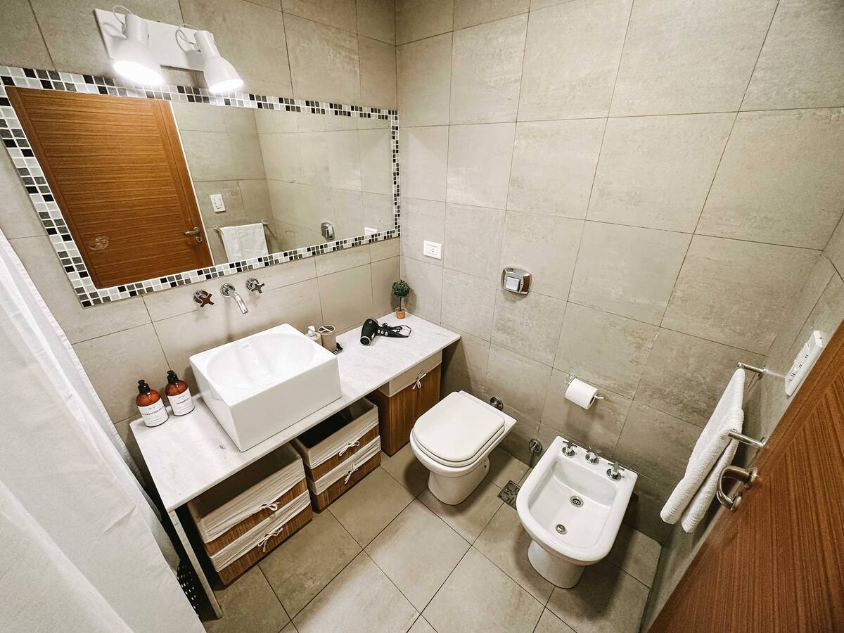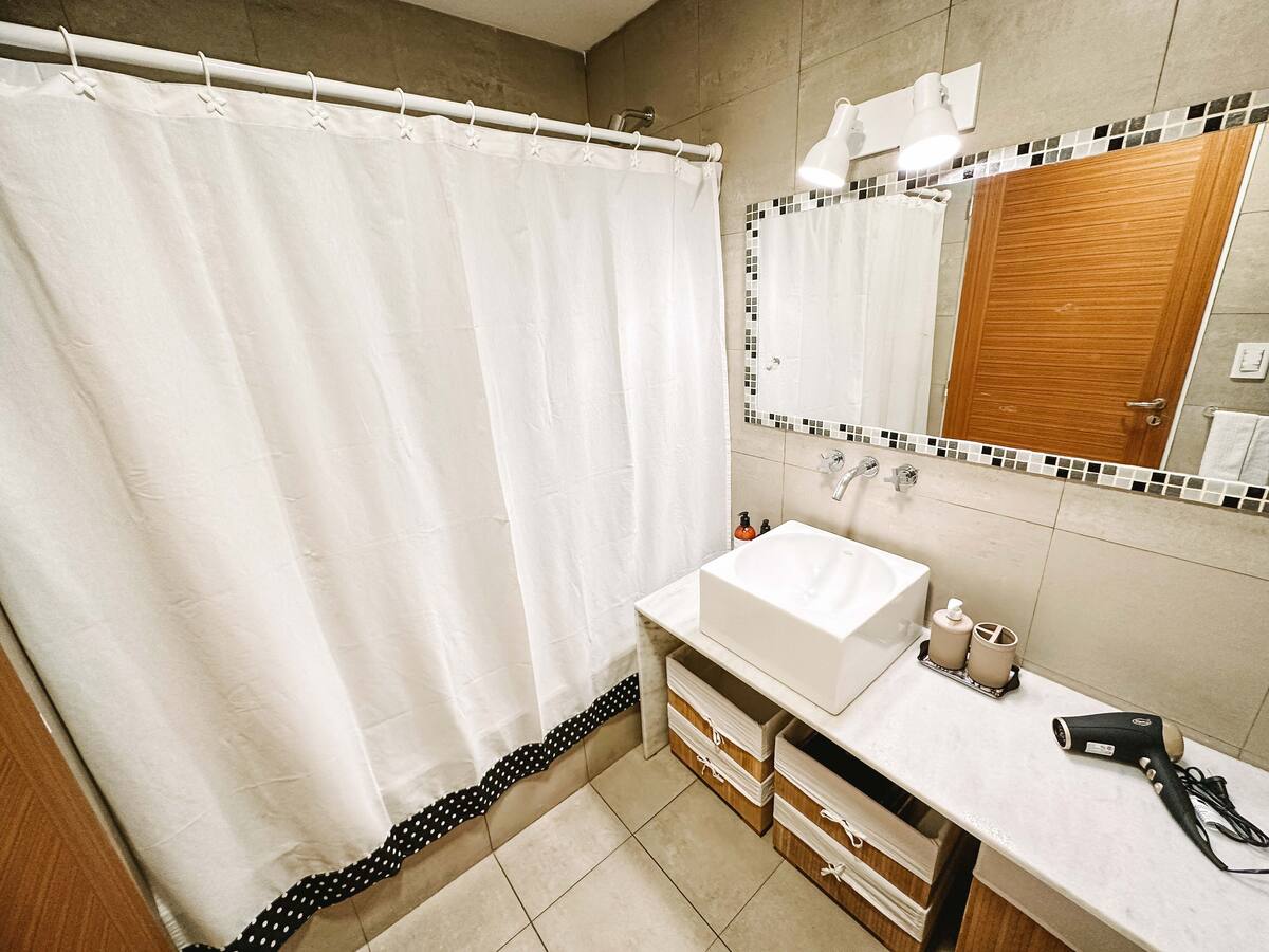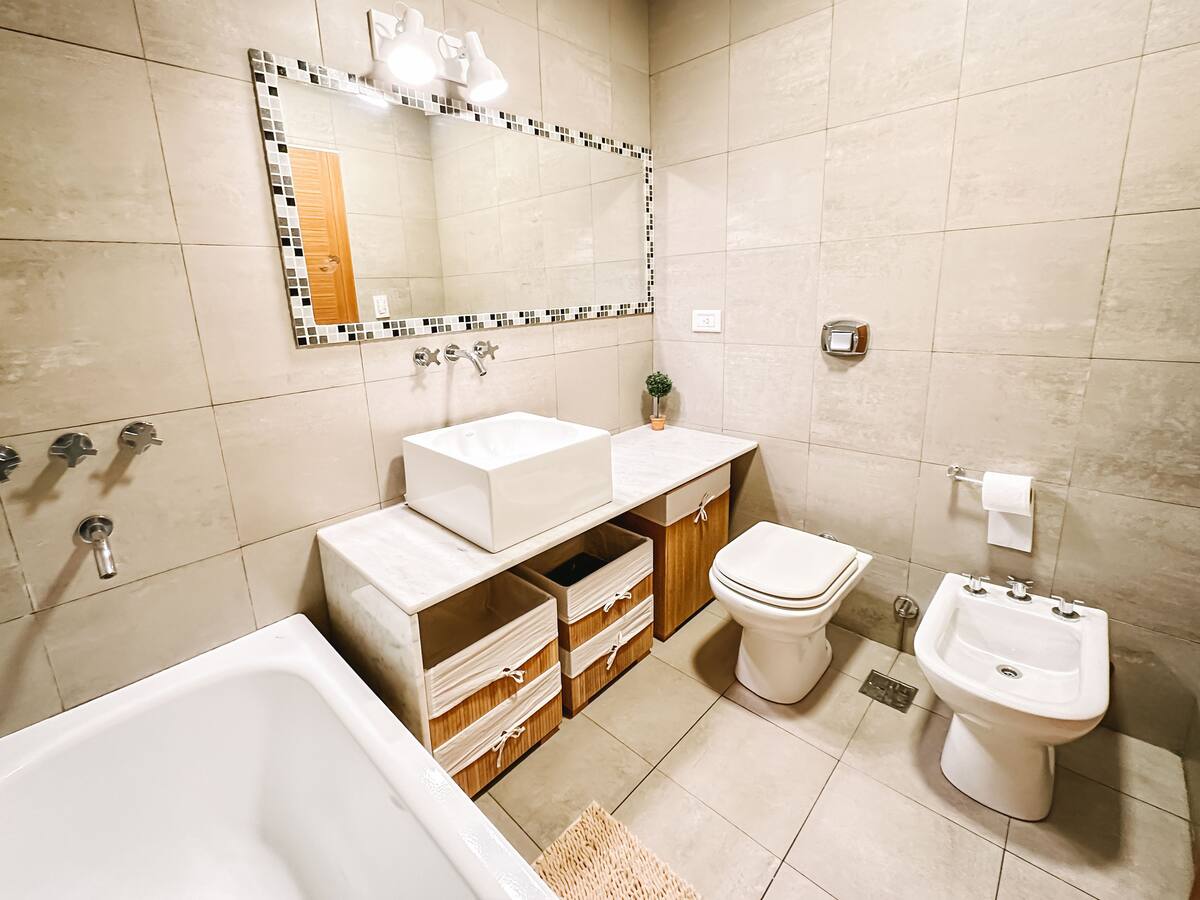 Departamento de 2 ambientes en Parque Chacabuco con acceso por ascensor. El living da a un balcón y cuenta con ventana al exterior; incluye sofá que puede transformarse en cama de 2 plazas y mesa para 4 personas. Tiene cocina semintegrada con barra y equipamiento completo de vajilla, electrodomésticos y elementos de limpieza. El dormitorio dispone de cama doble, placard con puertas espejadas hasta el piso, Smart TV y escritorio; el baño es completo con bañera. Todos los ambientes dan al exterior