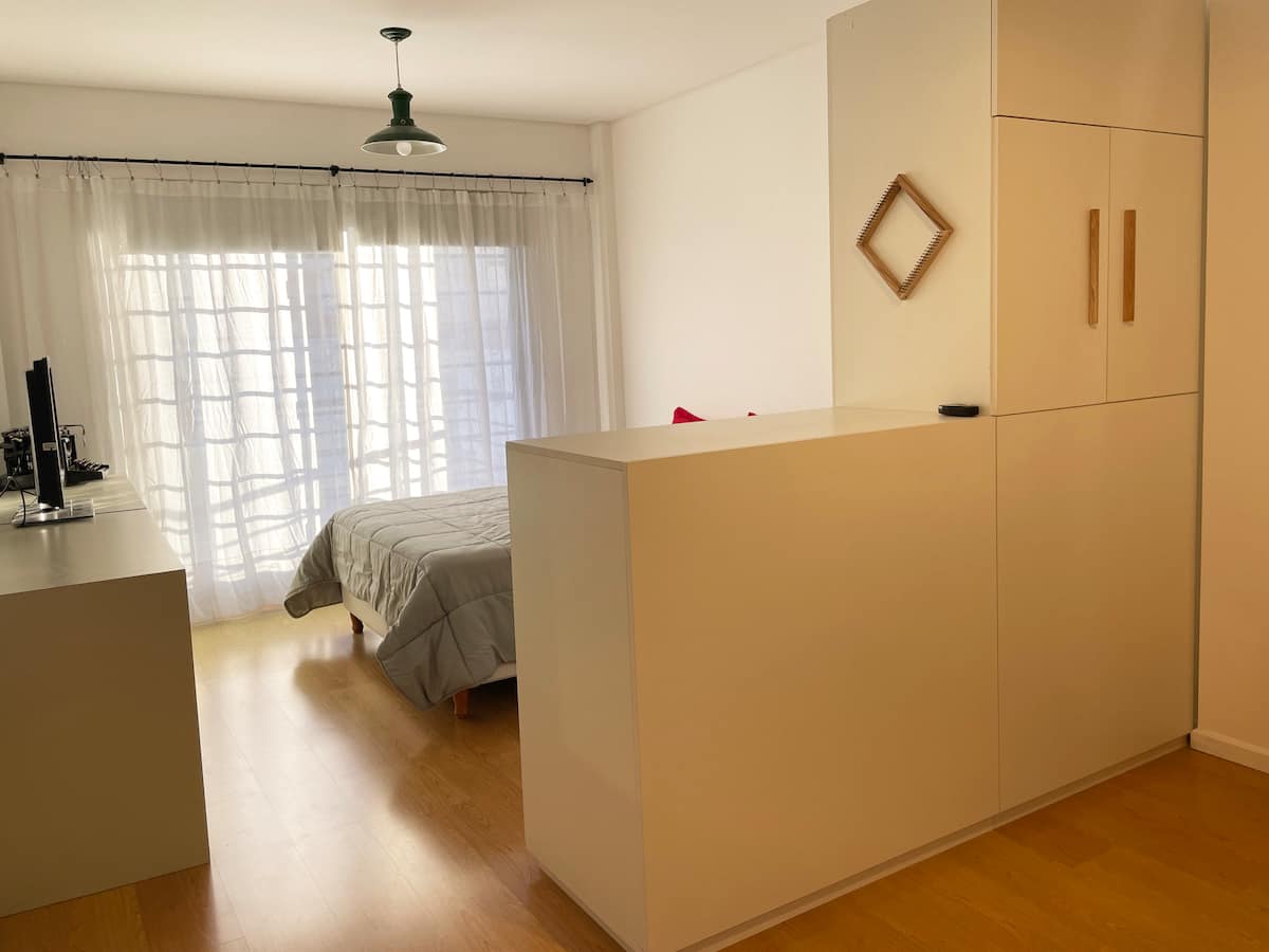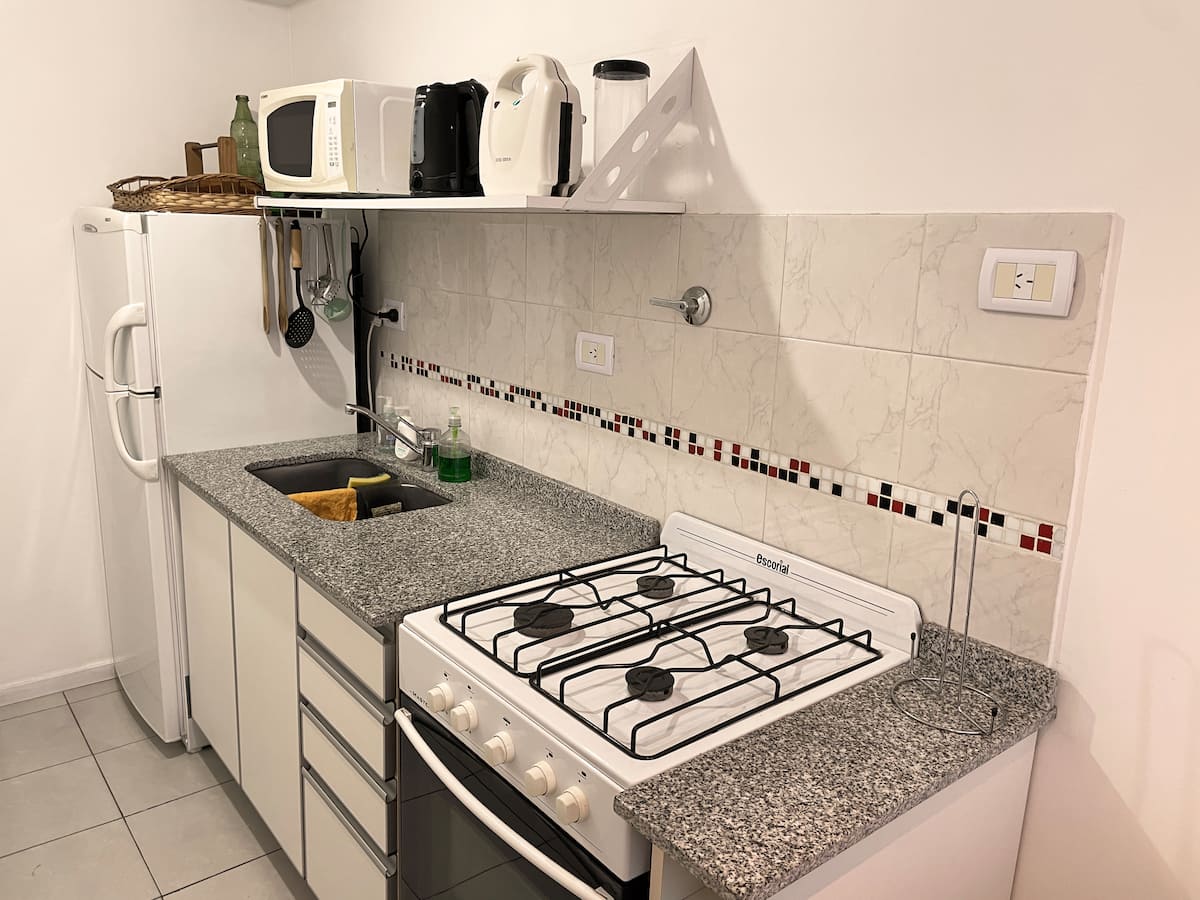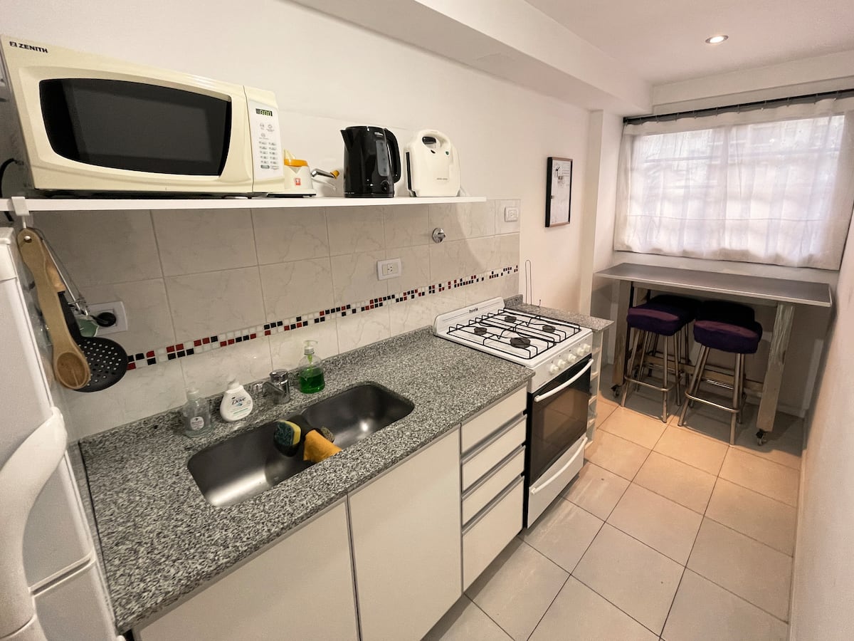 Monoambiente en Parque Chacabuco con cocina separada. Se ubica en un edificio con ascensor; tiene balcón con vista abierta. Cuenta con cama Queen, área de trabajo, aire acondicionado frío/calor, Smart TV y Wi‑Fi 1000 megabyte. La cocina está equipada con heladera con freezer, microondas, cocina con horno, pava eléctrica y tostadora, además de baño completo con toallas y papel higiénico. Se encuentra a 3 cuadras de la línea E de subte y a 8 cuadras de Av. Rivadavia. El Parque Chacabuco queda a 2