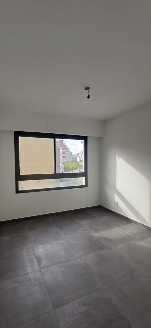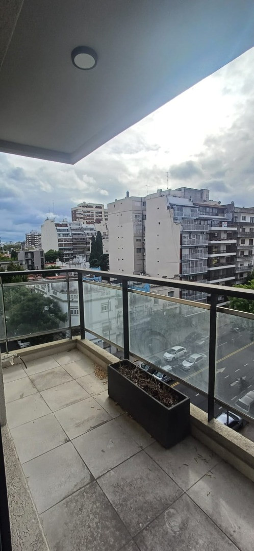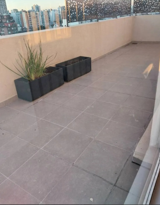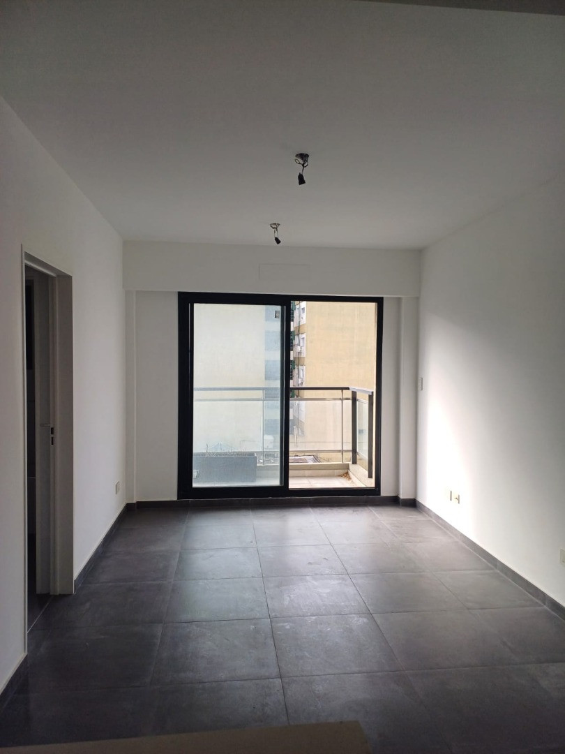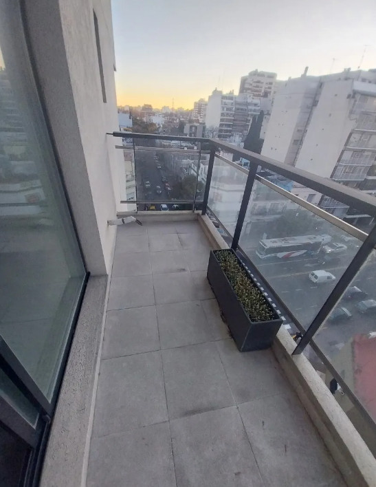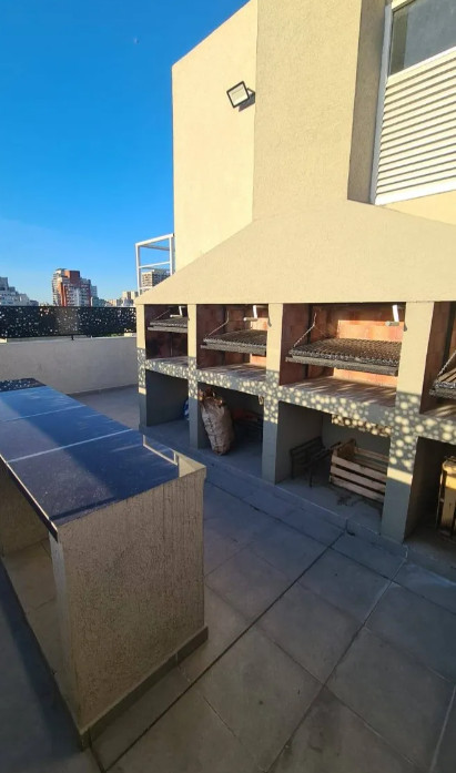 Departamento de 2 ambientes en Parque Chacabuco con balcón aterrazado al frente. Cocina con alacenas, bajo mesada y barra desayunadora, living comedor con puertas ventana de aluminio anodizado y salida al balcón, y baño completo. Dormitorio con placard de puertas corredizas y ventana de aluminio anodizado. El edificio tiene terraza de uso común con parrillas.