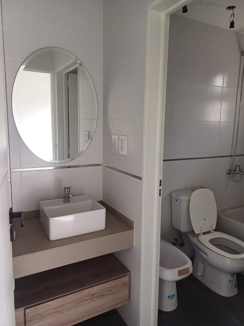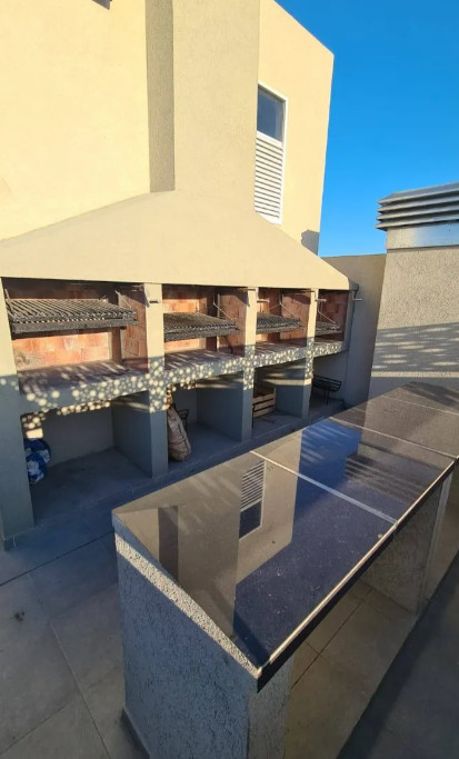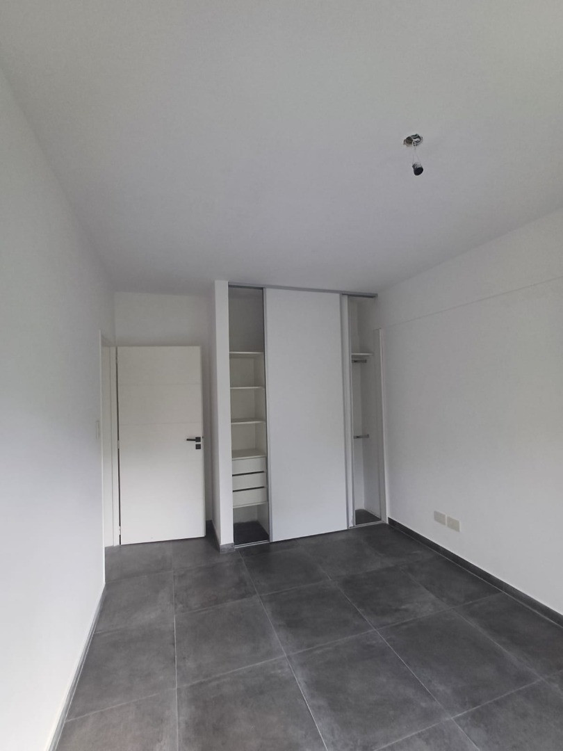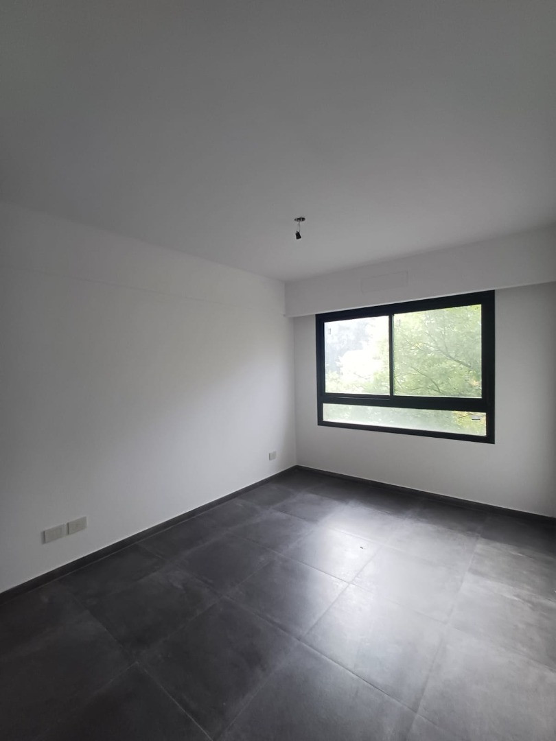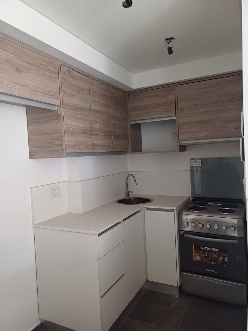 Departamento de 2 ambientes en Parque Chacabuco con balcón aterrazado al frente. Cocina con alacenas, bajo mesada y barra desayunadora, living comedor con puertas ventana de aluminio anodizado y salida al balcón, y baño completo. Dormitorio con placard de puertas corredizas y ventana de aluminio anodizado. El edificio tiene terraza de uso común con parrillas.