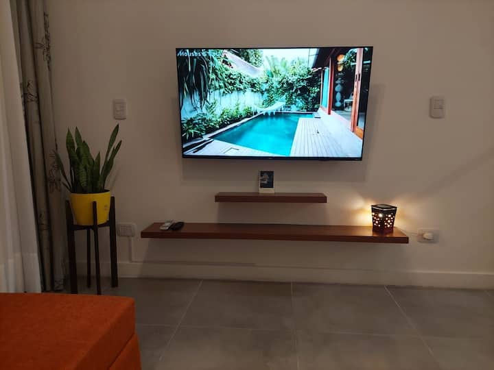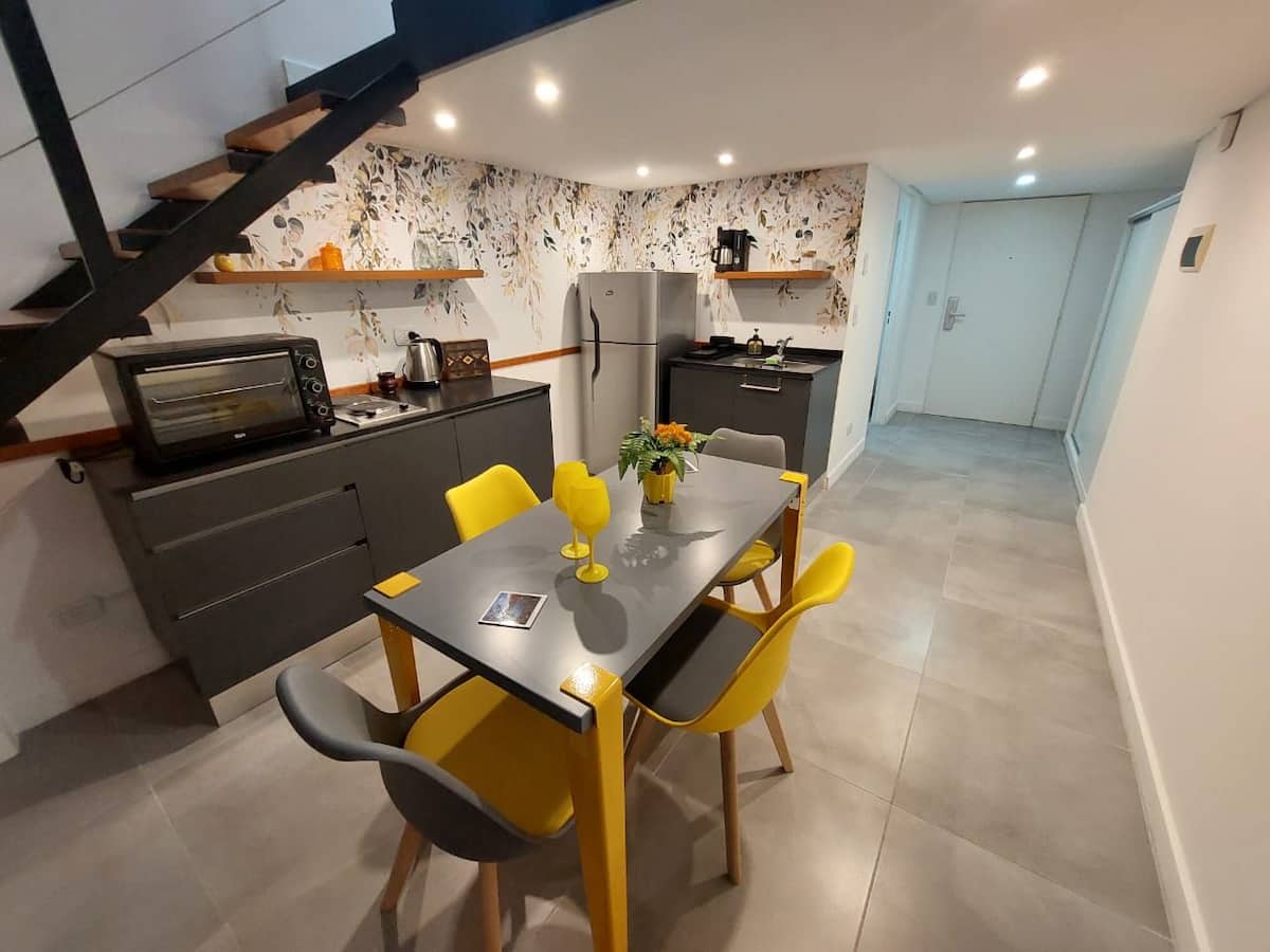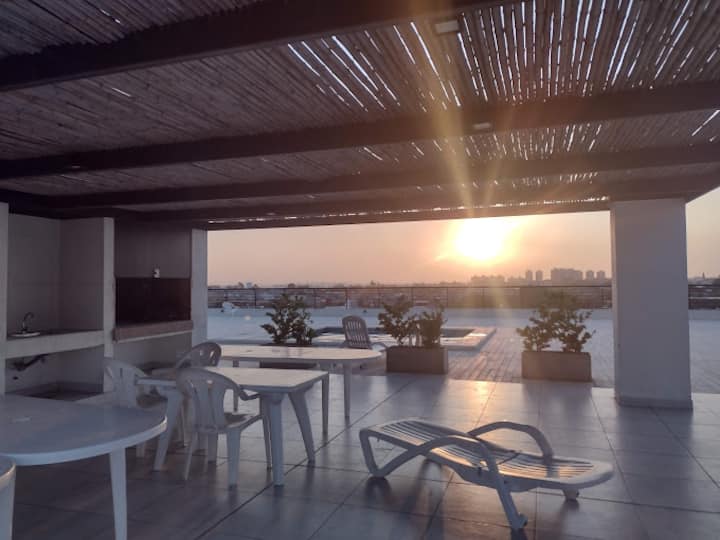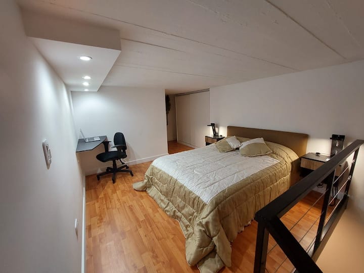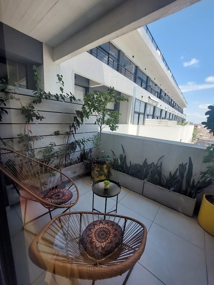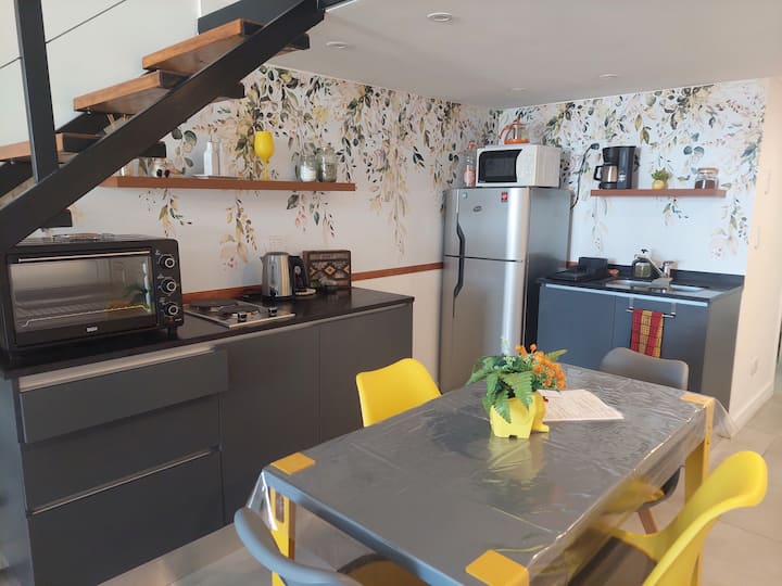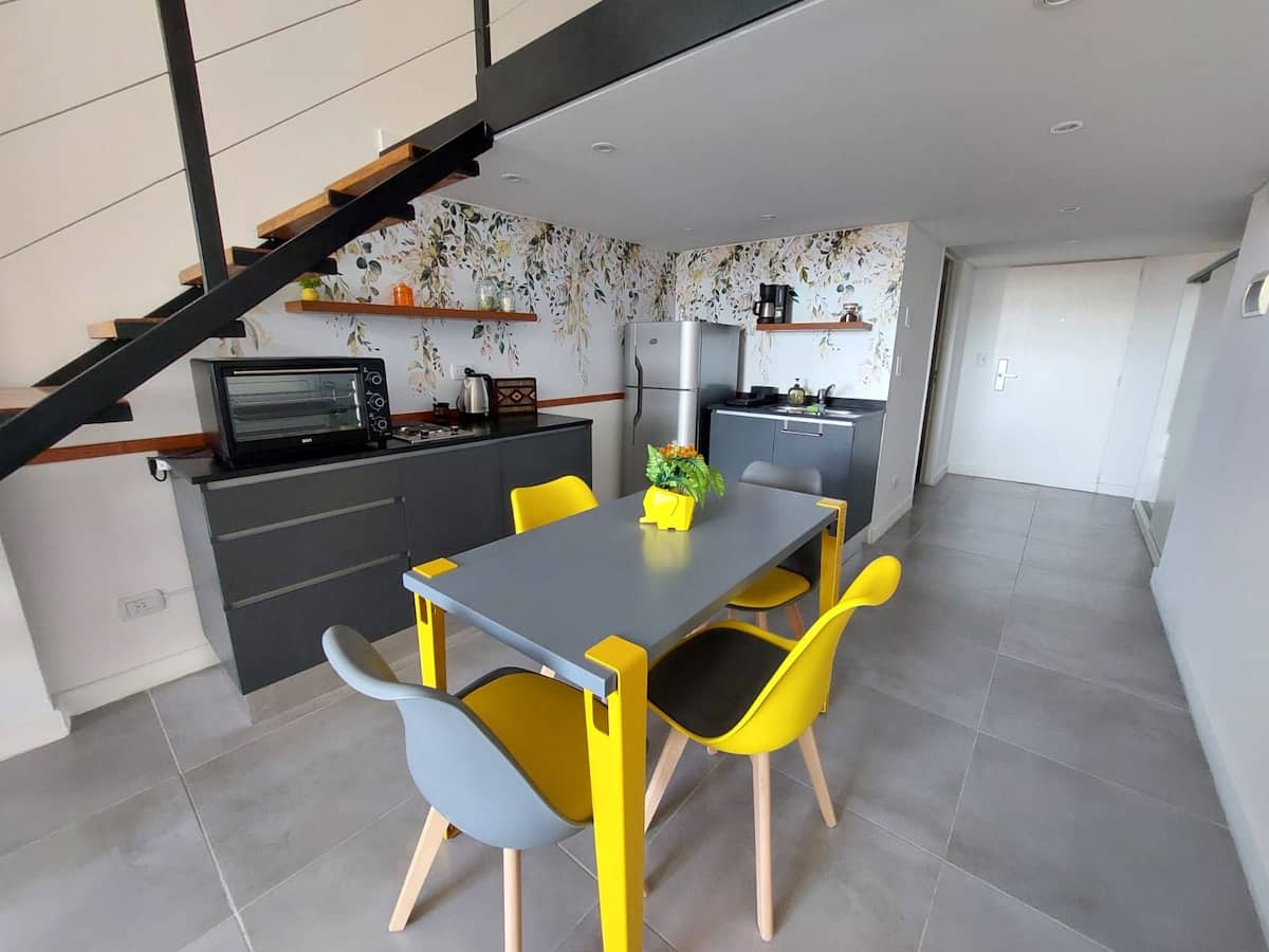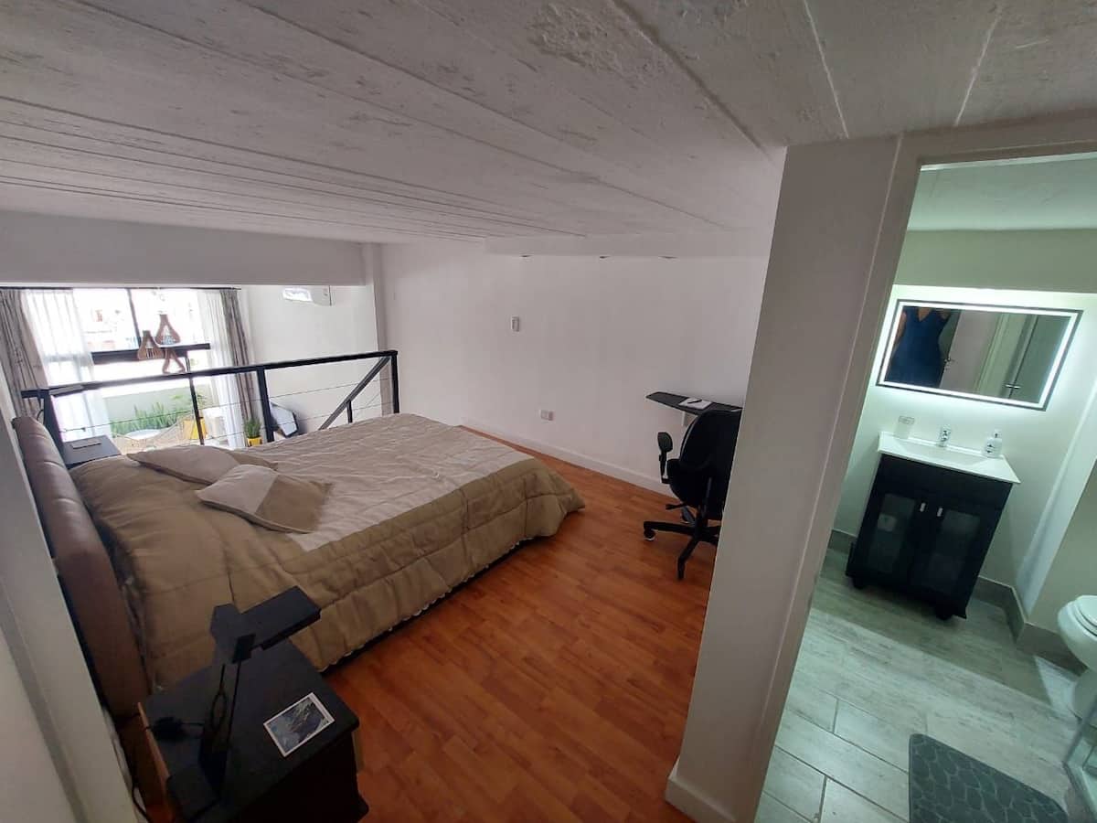 Departamento en 2 niveles con 1 dormitorio y 2 baños completos. En la planta alta cuenta con dormitorio con cama doble y baño privado, y un sector de oficina con escritorio y silla ergonómica. En la planta baja hay living con TV de 50", cocina completa (heladera con freezer, cocina eléctrica con horno, microondas y pava eléctrica) y balcón privado con mesa y sillones. Incluye conexión WiFi, aire acondicionado con uso durante todo el año, seguridad 24 horas, grupo electrógeno y espacios de cowork