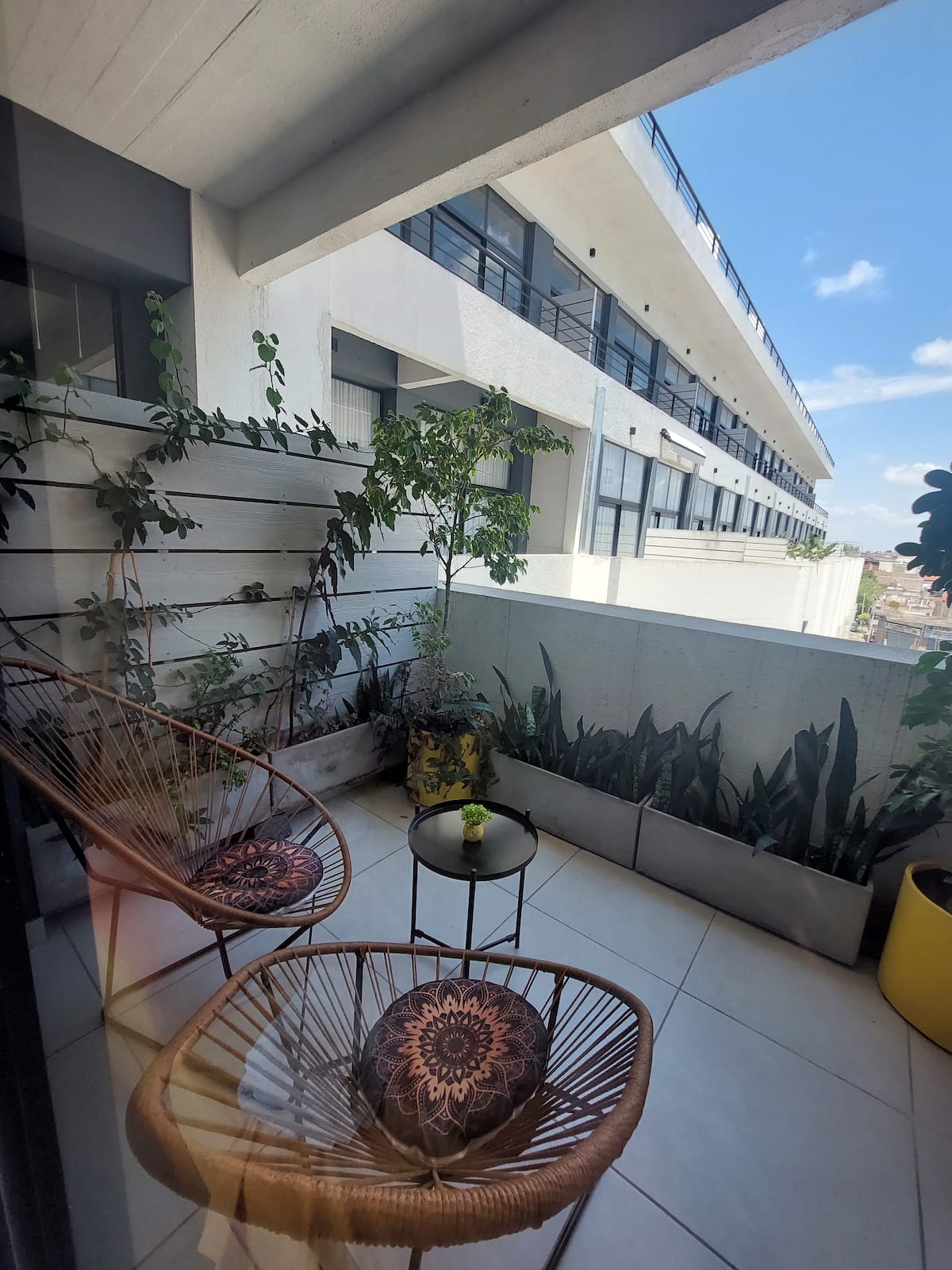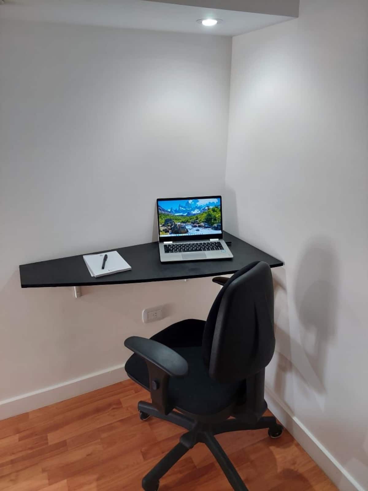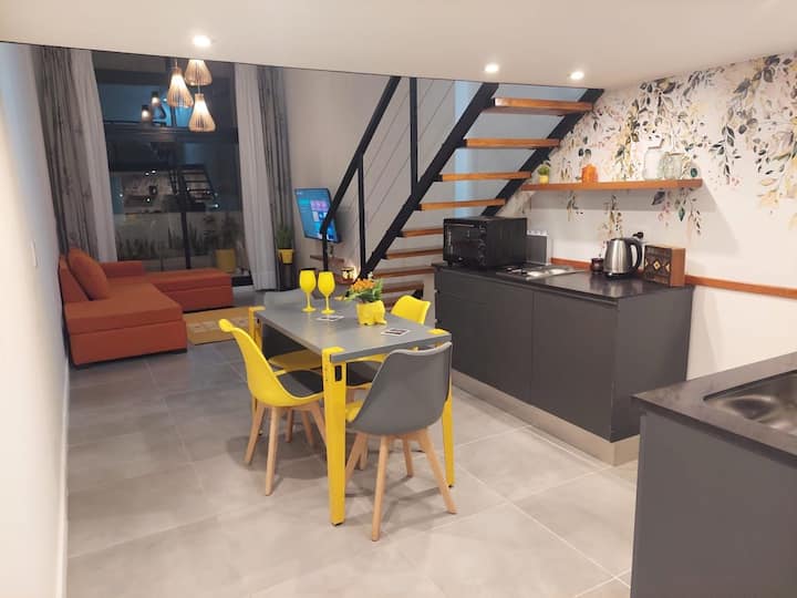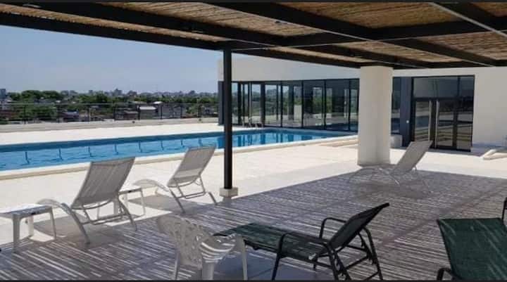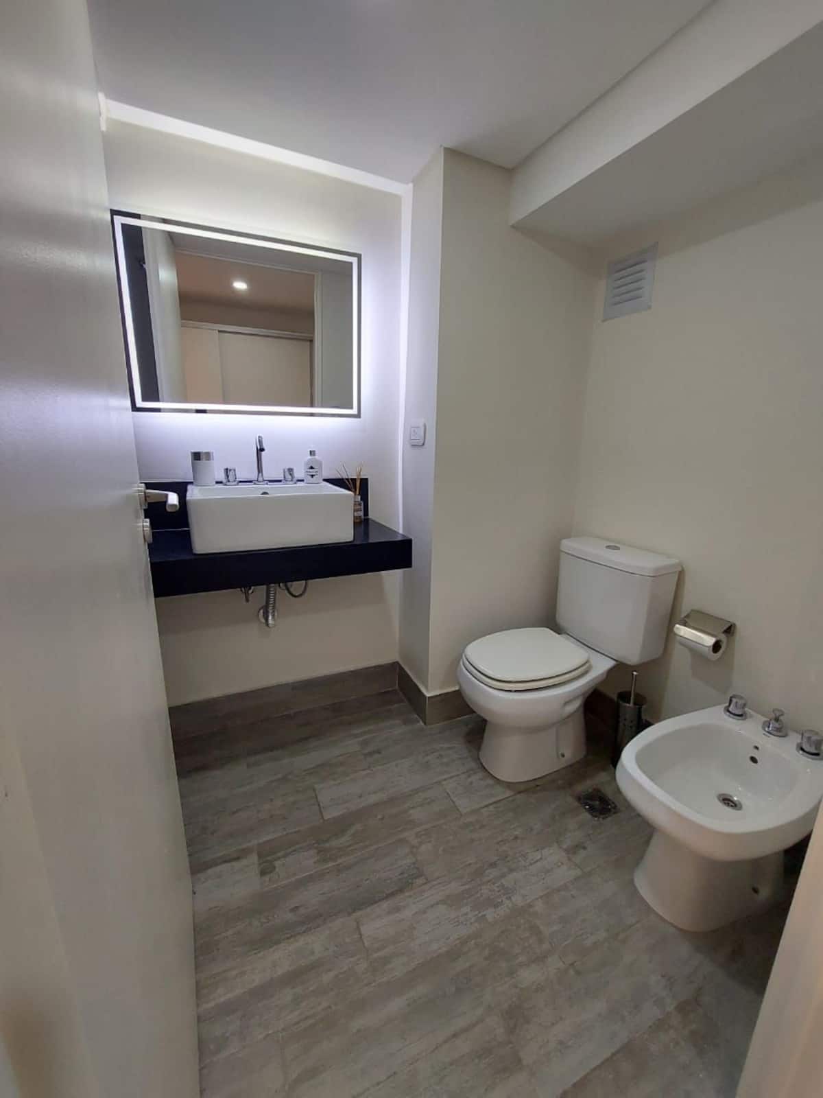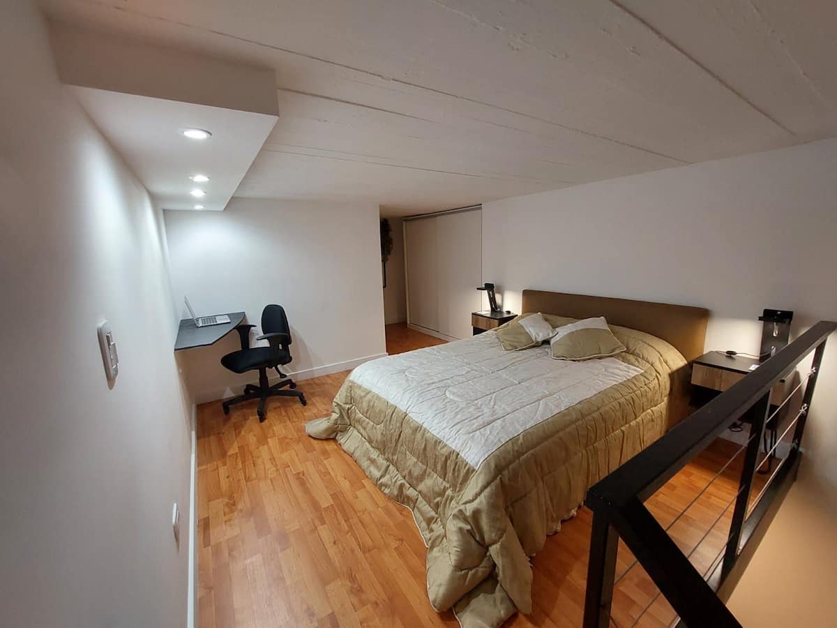 Departamento en 2 niveles con 1 dormitorio y 2 baños completos. En la planta alta cuenta con dormitorio con cama doble y baño privado, y un sector de oficina con escritorio y silla ergonómica. En la planta baja hay living con TV de 50", cocina completa (heladera con freezer, cocina eléctrica con horno, microondas y pava eléctrica) y balcón privado con mesa y sillones. Incluye conexión WiFi, aire acondicionado con uso durante todo el año, seguridad 24 horas, grupo electrógeno y espacios de cowork