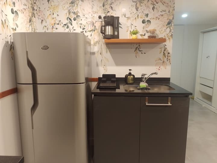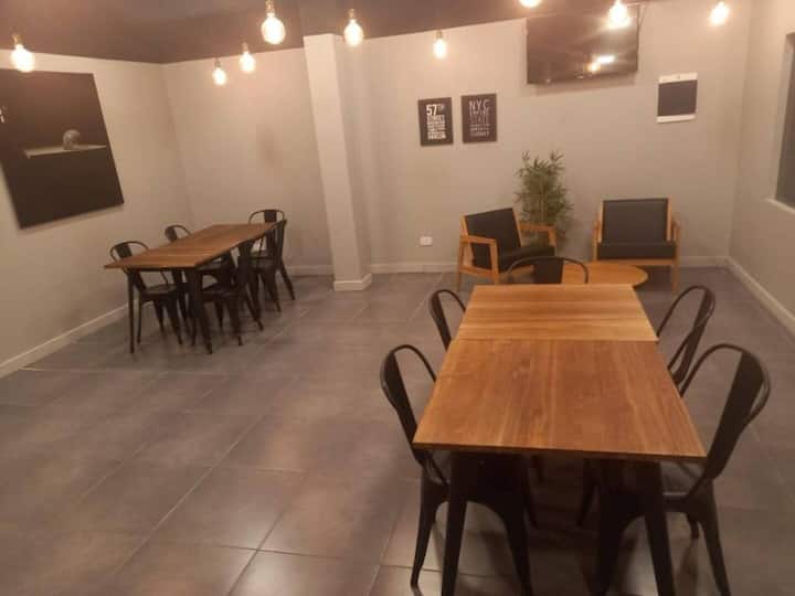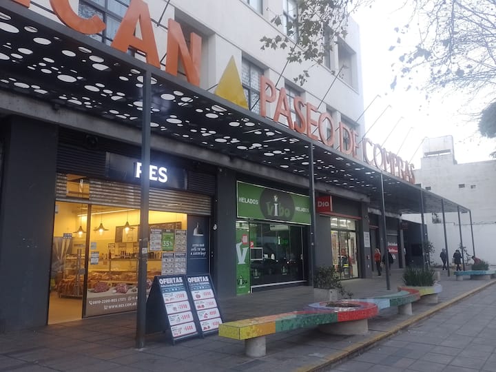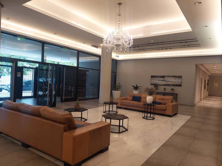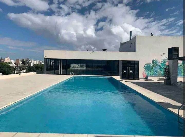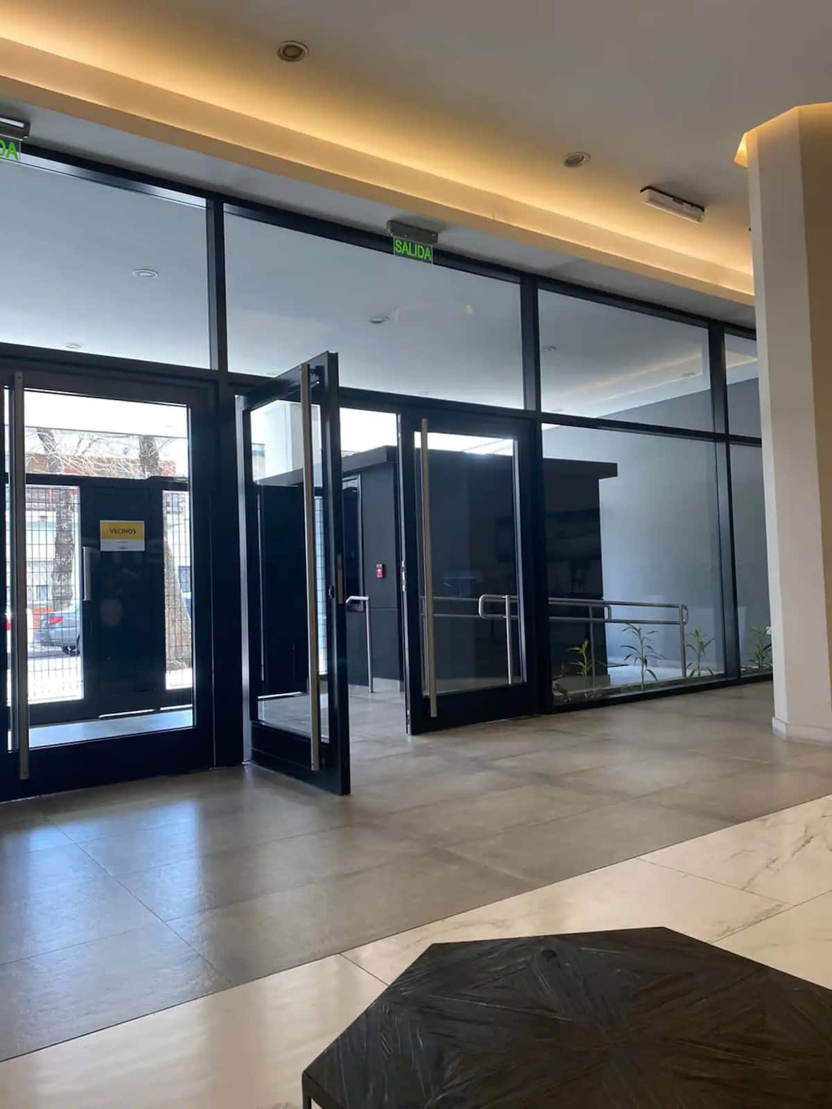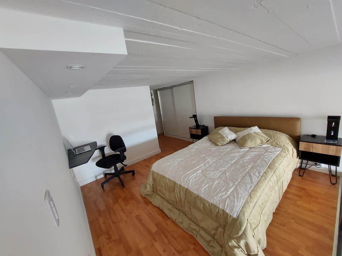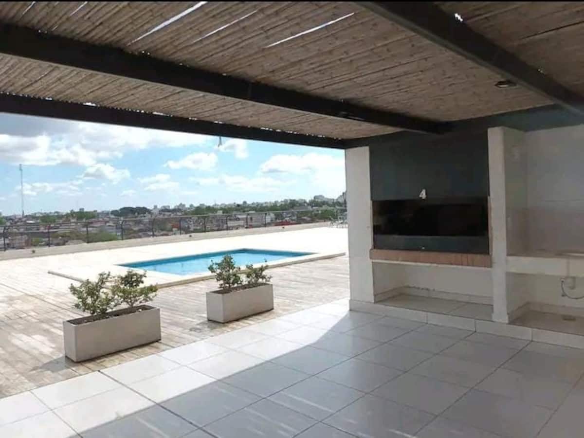 Departamento en 2 niveles con 1 dormitorio y 2 baños completos. En la planta alta cuenta con dormitorio con cama doble y baño privado, y un sector de oficina con escritorio y silla ergonómica. En la planta baja hay living con TV de 50", cocina completa (heladera con freezer, cocina eléctrica con horno, microondas y pava eléctrica) y balcón privado con mesa y sillones. Incluye conexión WiFi, aire acondicionado con uso durante todo el año, seguridad 24 horas, grupo electrógeno y espacios de cowork