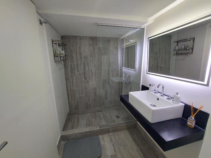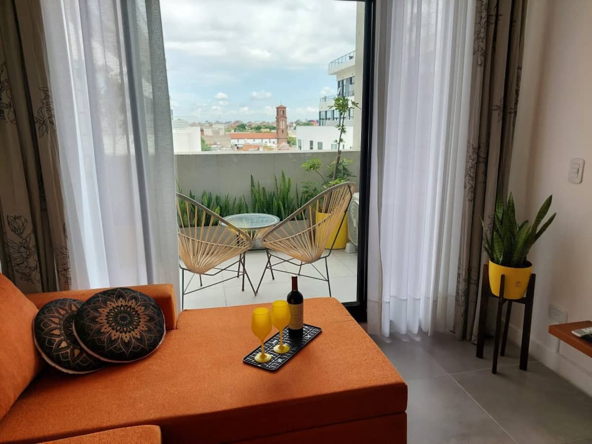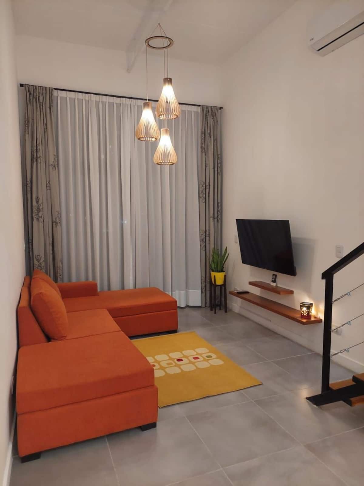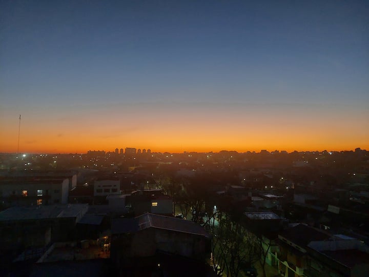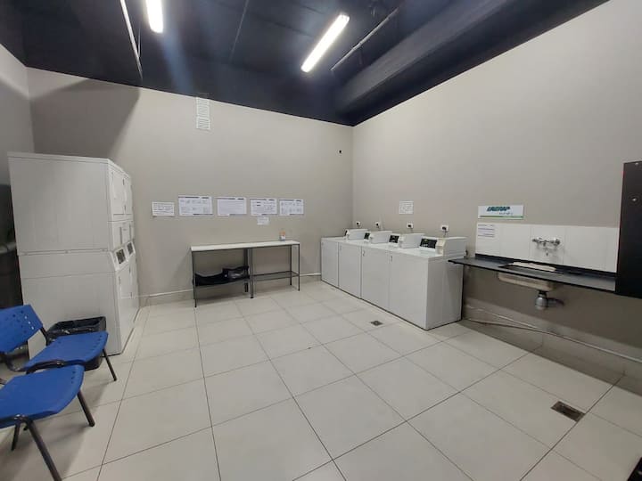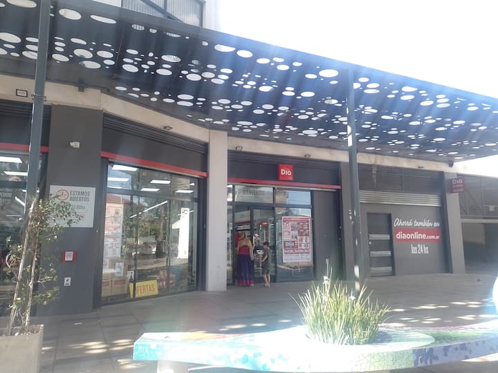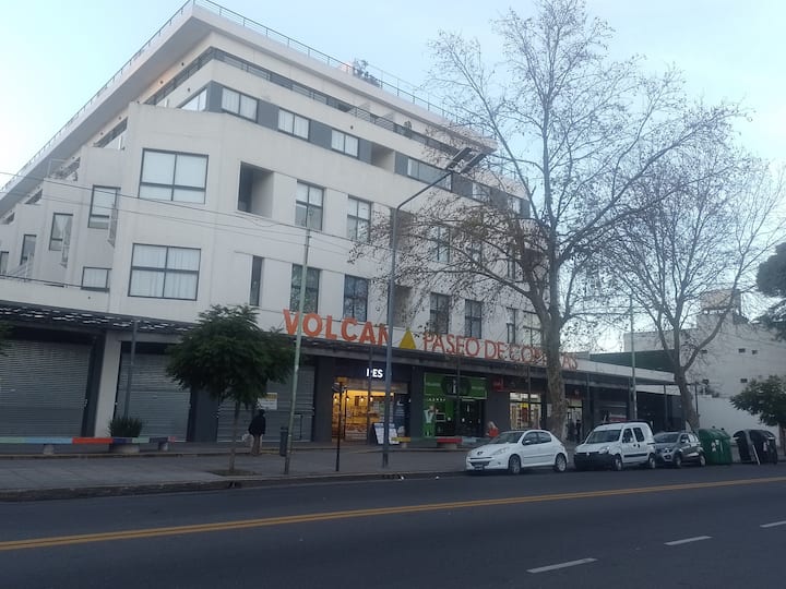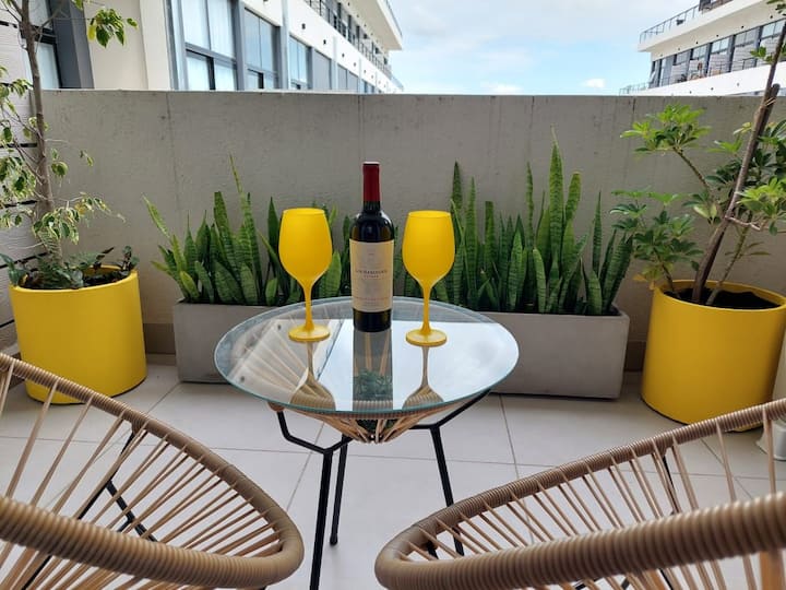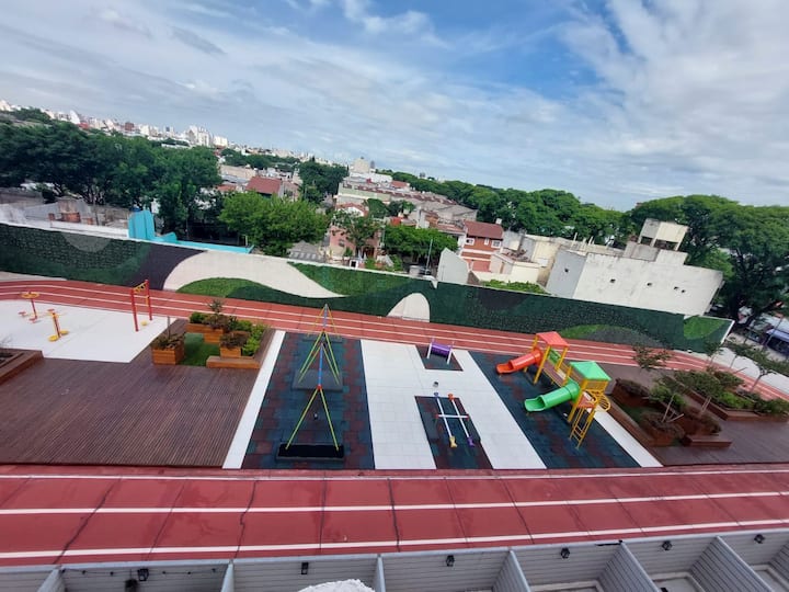 Departamento en 2 niveles con 1 dormitorio y 2 baños completos. En la planta alta cuenta con dormitorio con cama doble y baño privado, y un sector de oficina con escritorio y silla ergonómica. En la planta baja hay living con TV de 50", cocina completa (heladera con freezer, cocina eléctrica con horno, microondas y pava eléctrica) y balcón privado con mesa y sillones. Incluye conexión WiFi, aire acondicionado con uso durante todo el año, seguridad 24 horas, grupo electrógeno y espacios de cowork