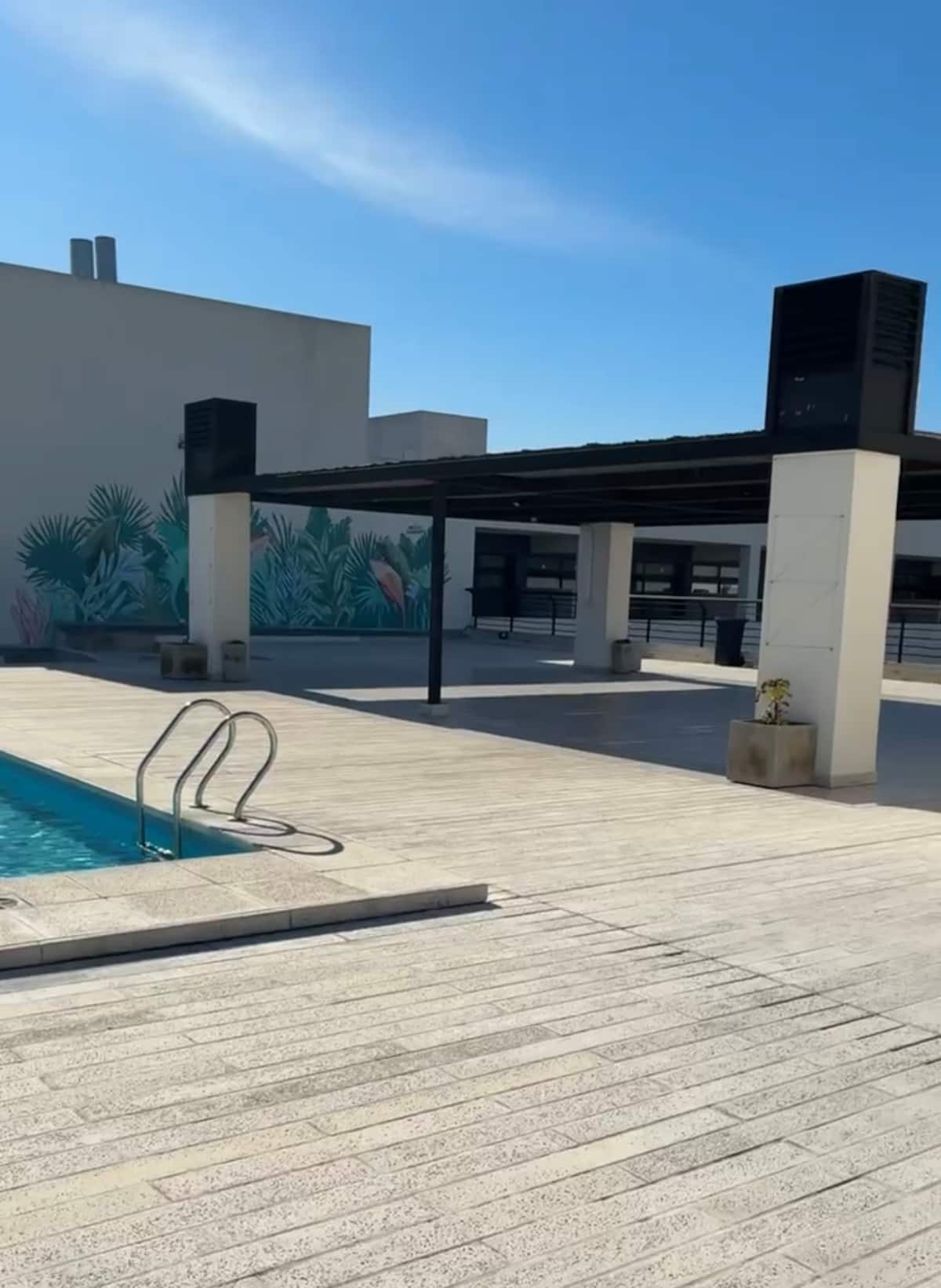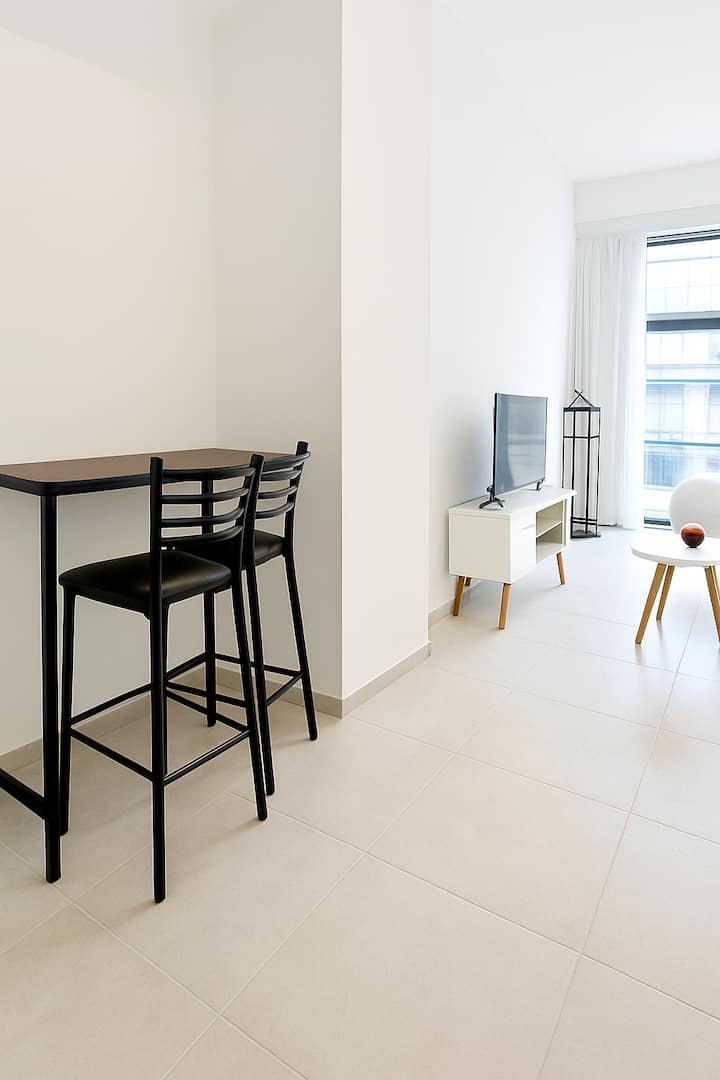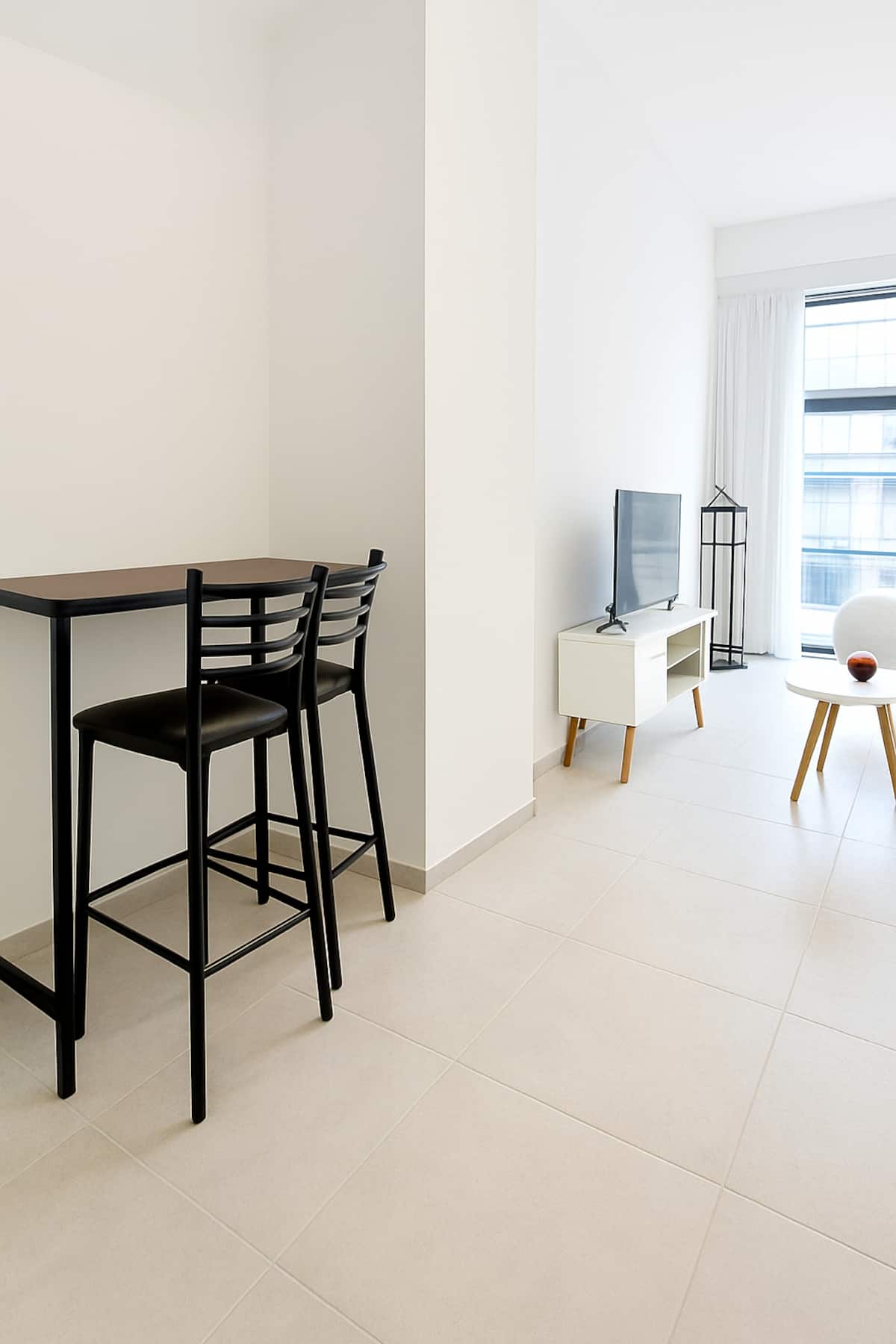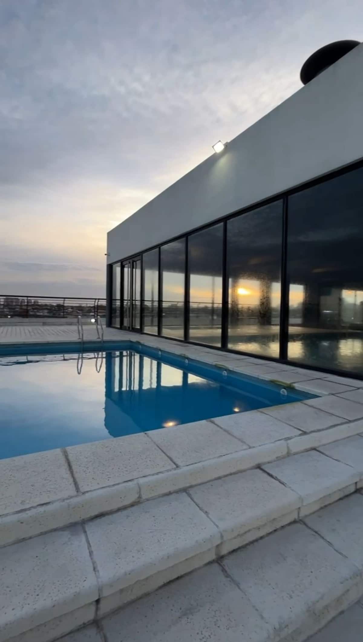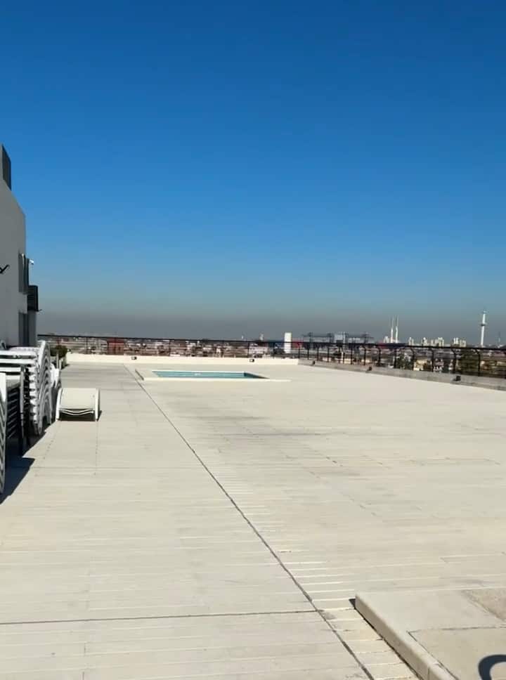 Departamento de 2 ambientes en Parque Chacabuco, con 1 dormitorio y 1 baño completo. Cuenta con cama doble, living con TV de 50" y cocina equipada con heladera con freezer, anafe eléctrico y horno, microondas, pava eléctrica y cafetera. Incluye balcón privado con sillones y mesa. El complejo tiene pileta exterior (temporada de verano) y pileta climatizada interior, jacuzzi, sauna seca, gimnasio, circuito aeróbico con pista para correr y 4 salas de coworking con WiFi, además de solárium, parque i