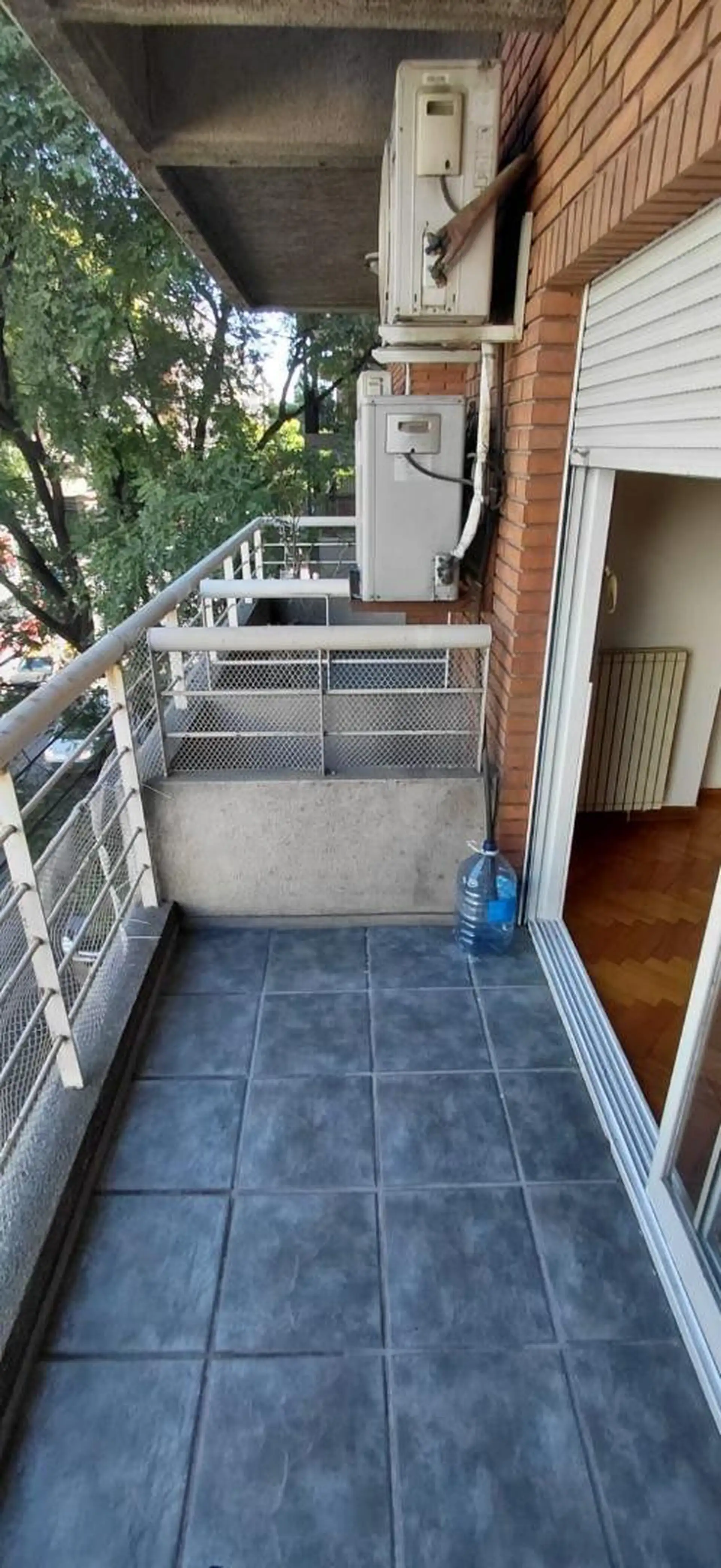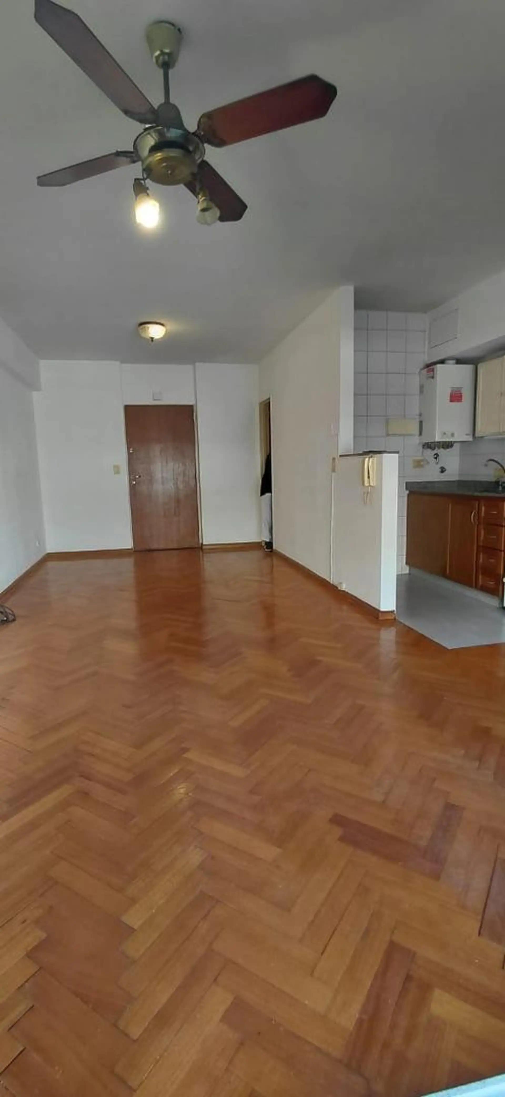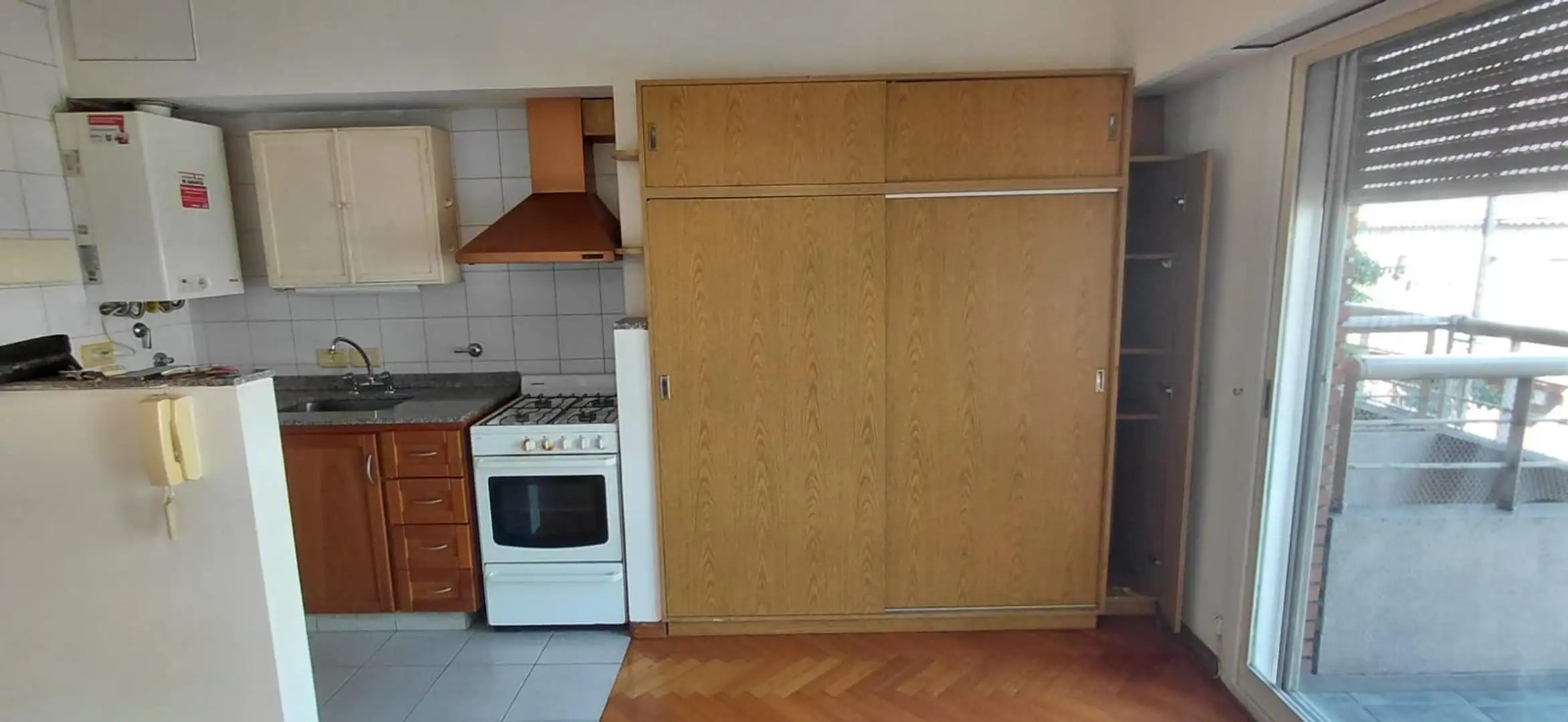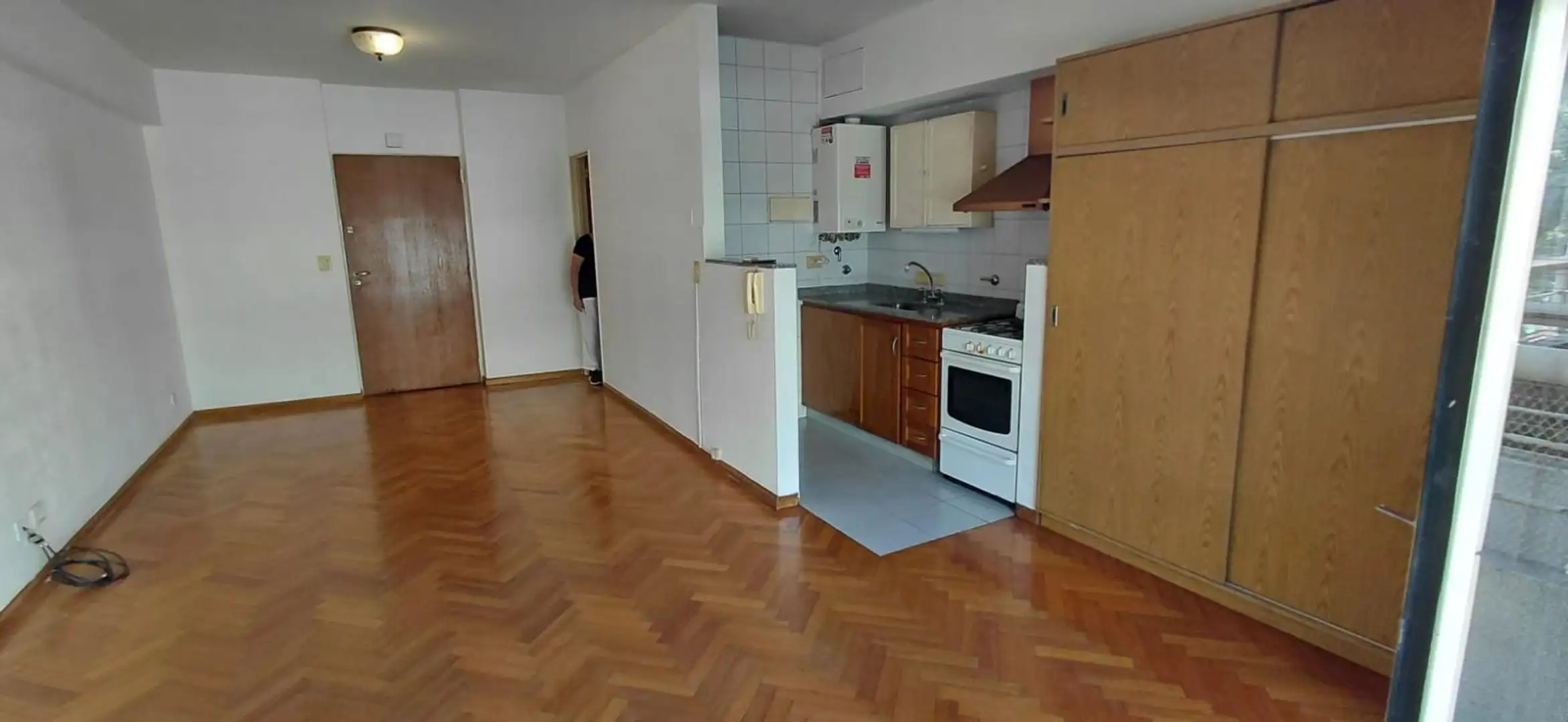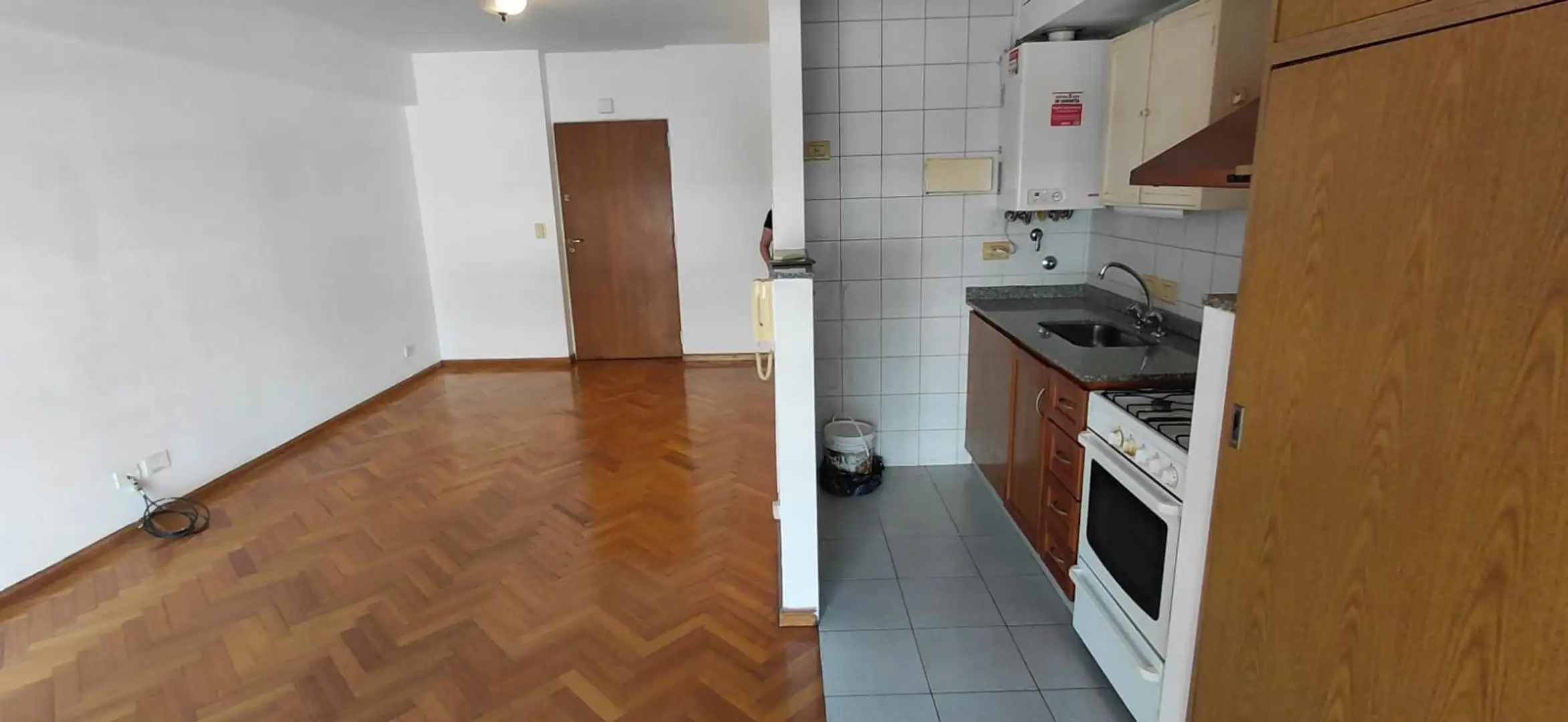 Departamento monoambiente de 38 m² al frente con balcón, orientación suroeste y calefacción individual. Cuenta con ambiente con placar y aire acondicionado frío, cocina semi integrada con caldera individual y baño completo con bañera. El edificio tiene jardín de uso común en planta baja y laundry en terraza. Seguridad diurna por Totem y seguridad nocturna de 22 a 06 hs presencial. Contrato a 2 años: 1 mes de depósito y 1 mes adelantado.
