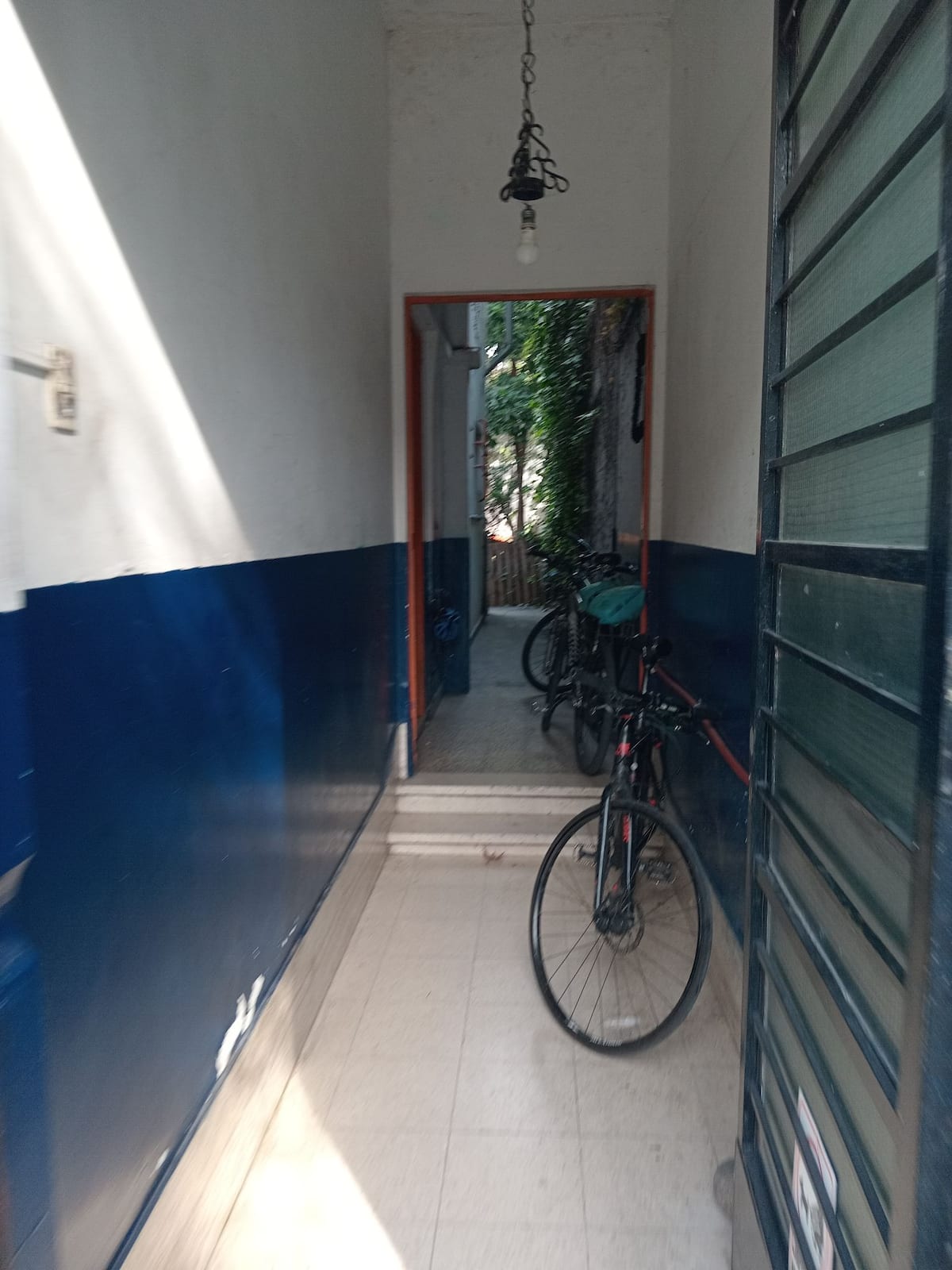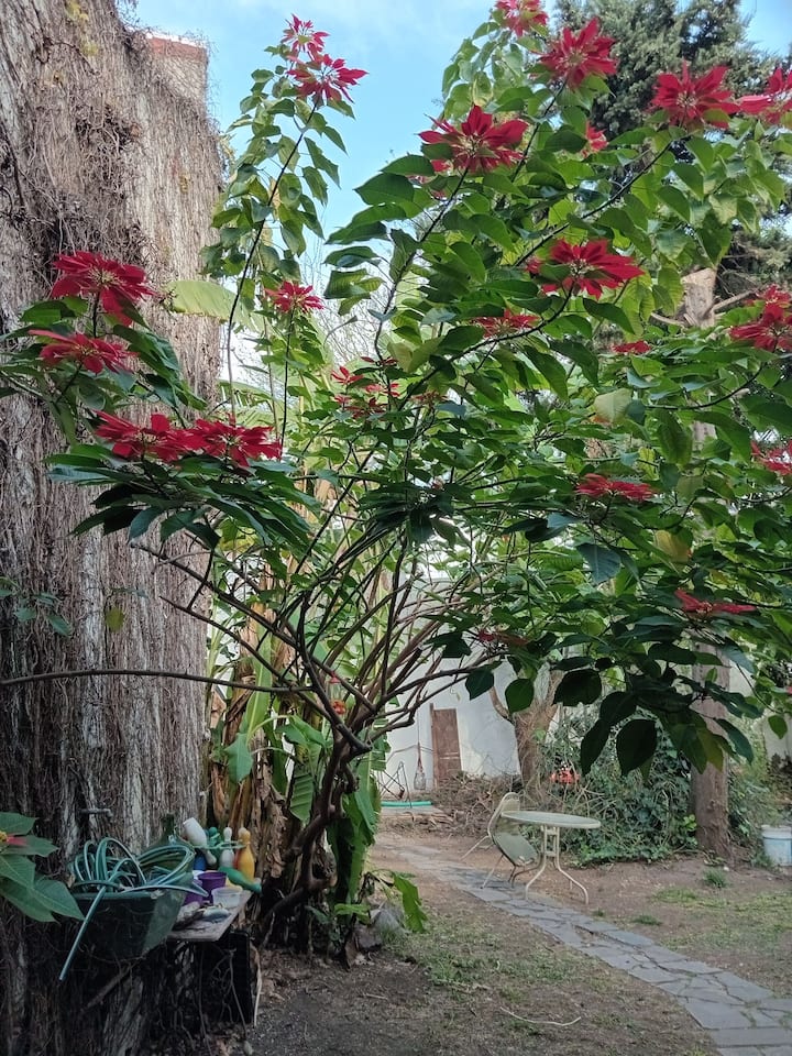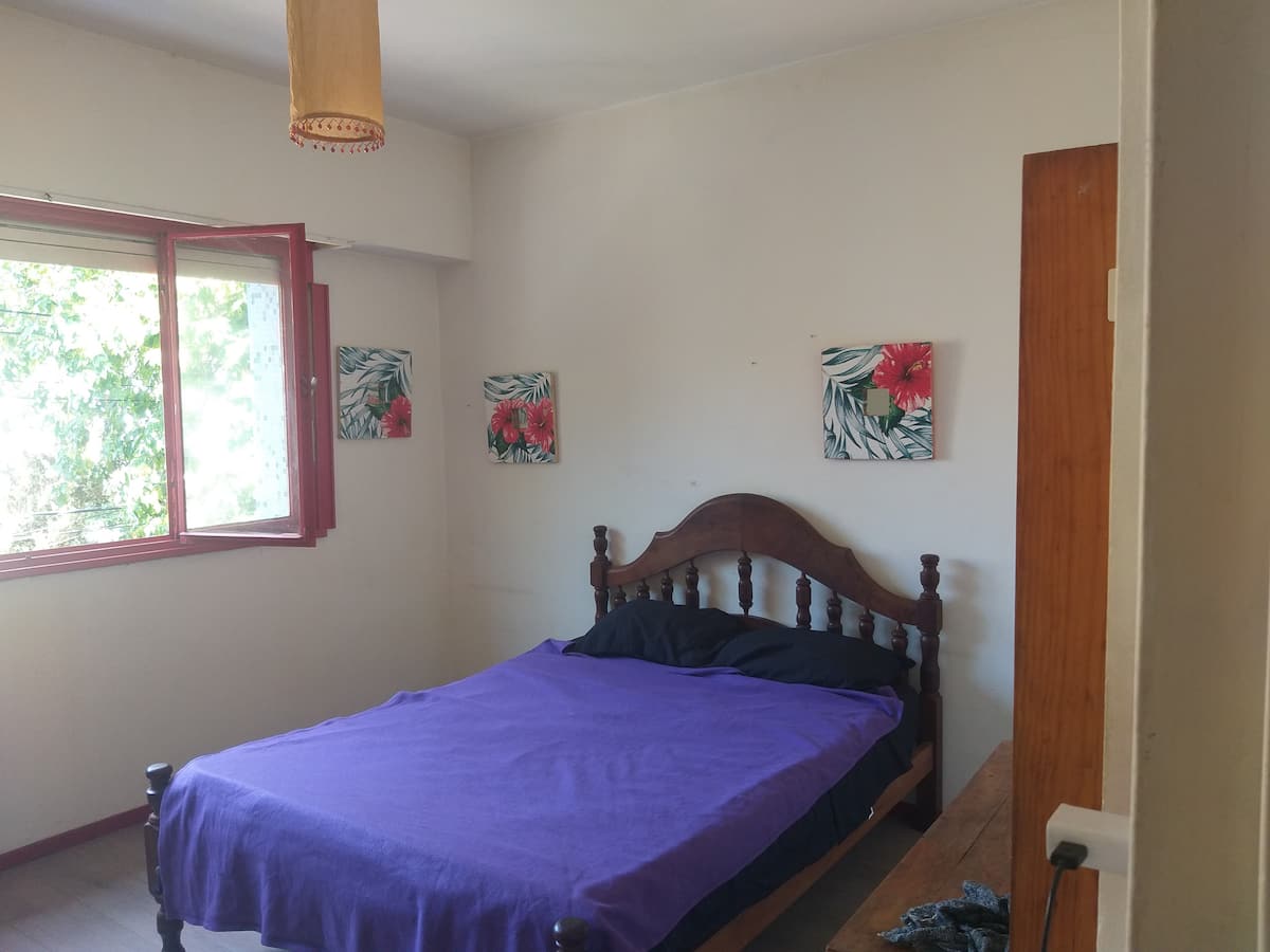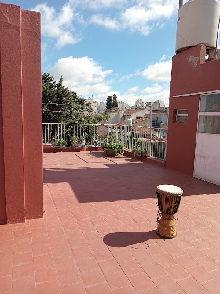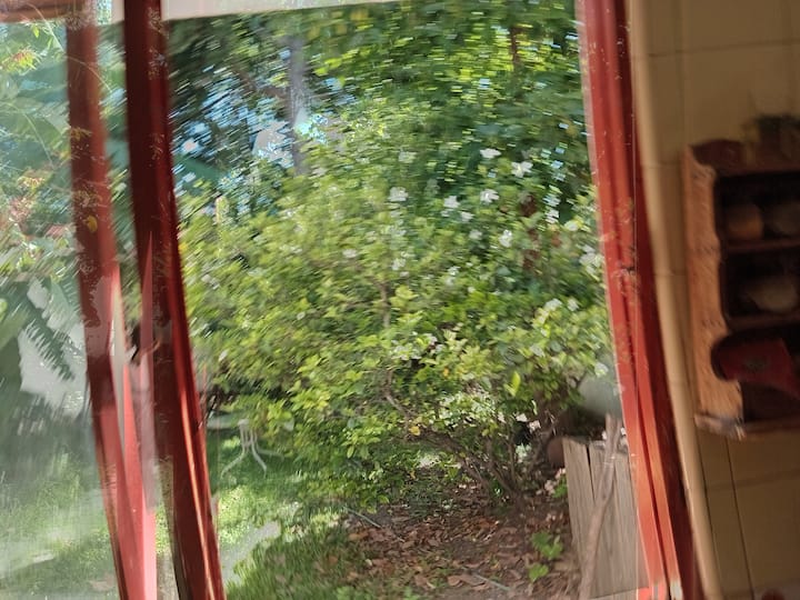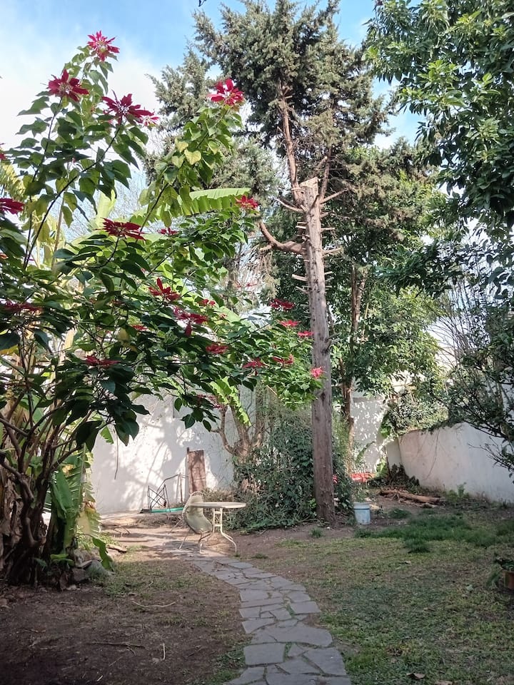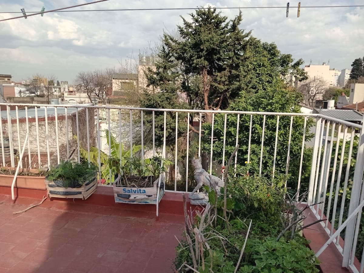 Departamento de 1 dormitorio con acceso a terraza y patio. Cuenta con comedor y cocina. El espacio está en una zona arbolada con vegetación y se menciona presencia de pájaros y, a veces, sonidos de percusión.