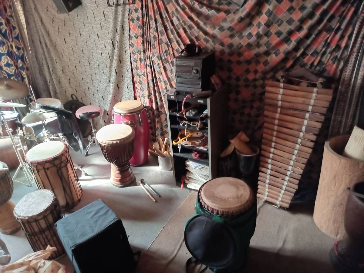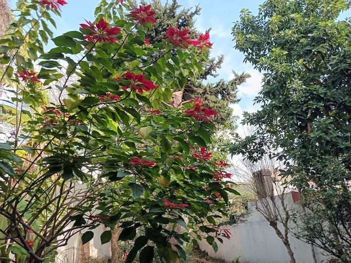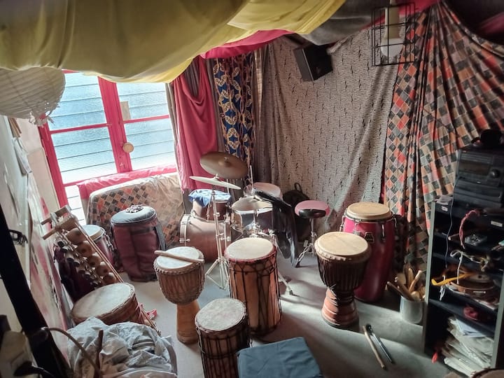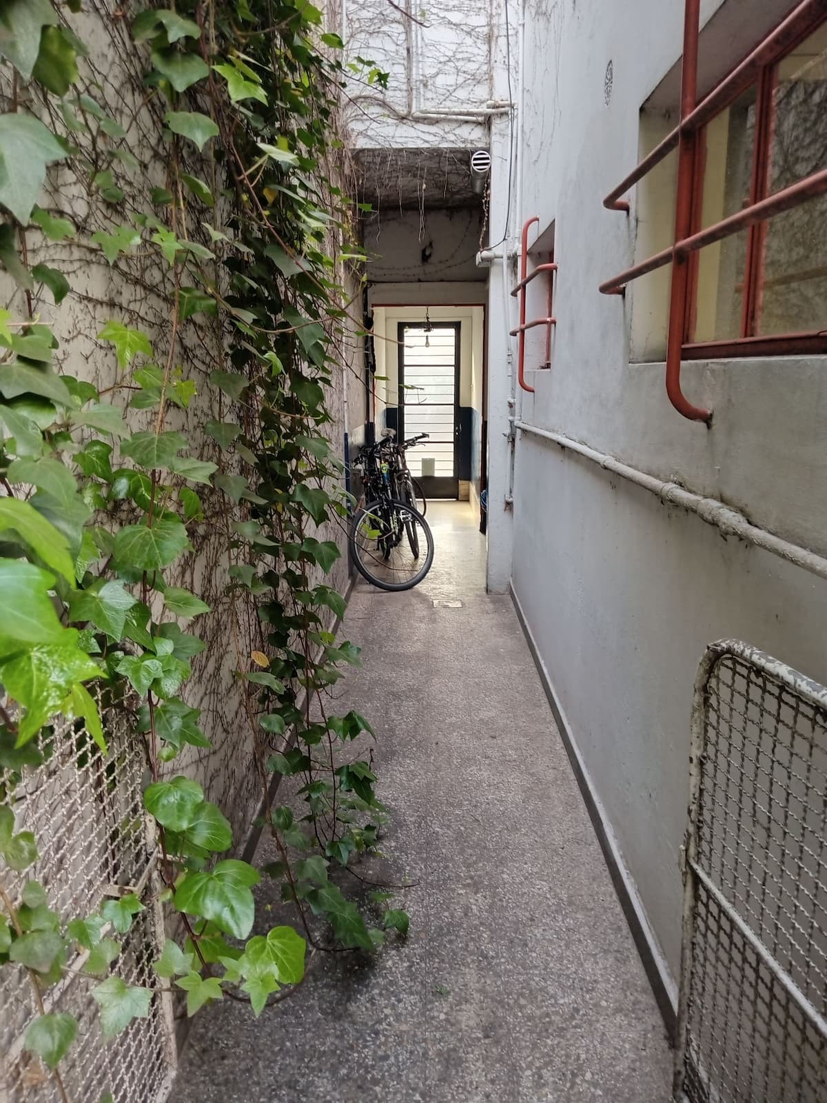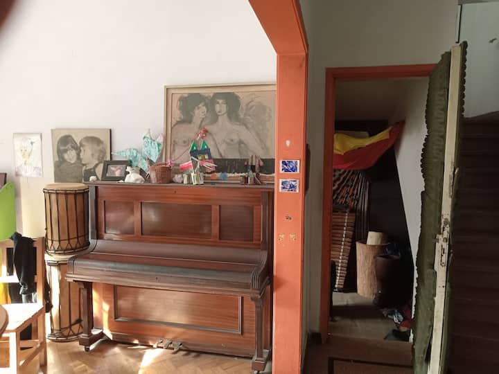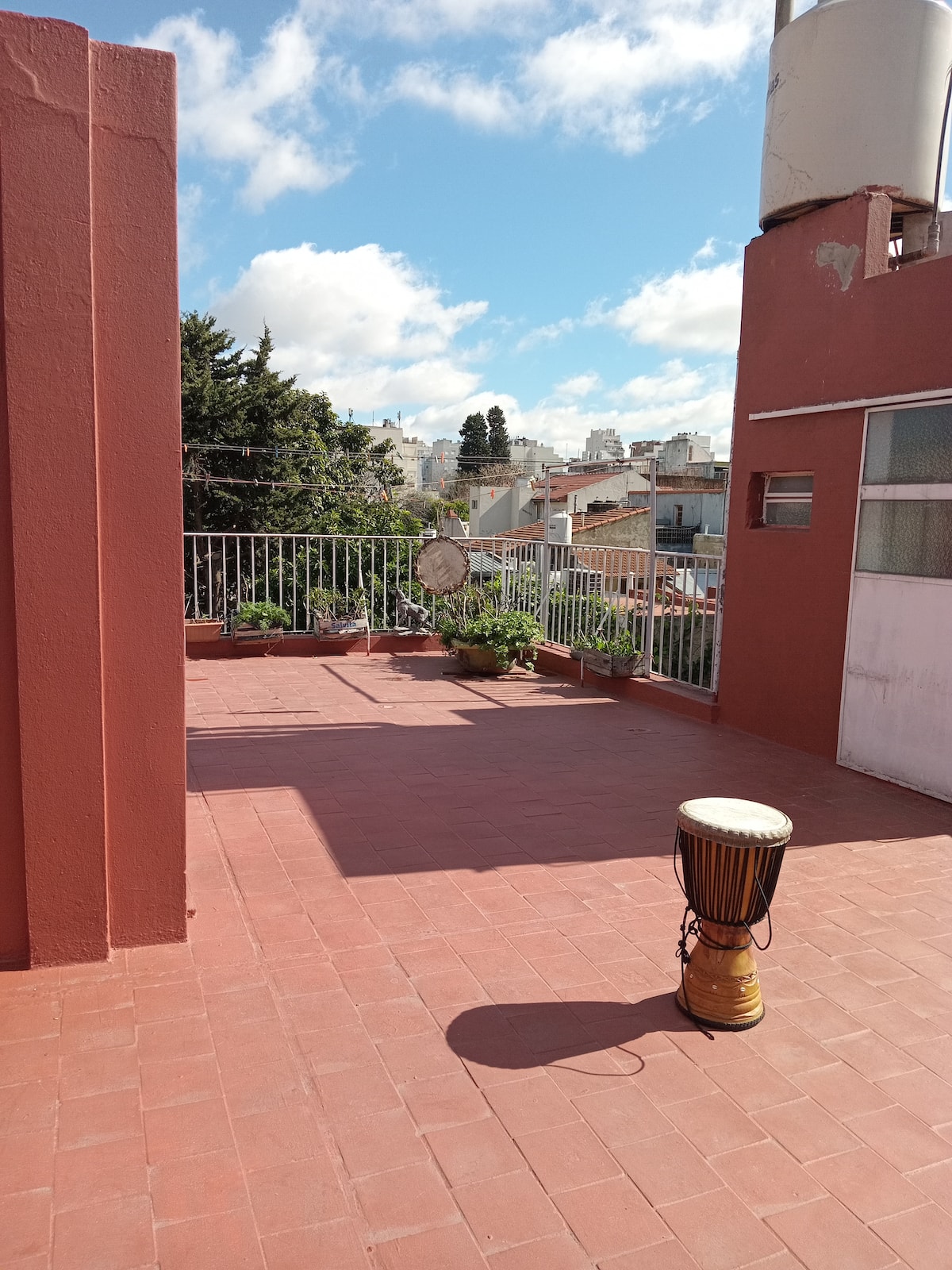 Departamento de 1 dormitorio con acceso a terraza y patio. Cuenta con comedor y cocina. El espacio está en una zona arbolada con vegetación y se menciona presencia de pájaros y, a veces, sonidos de percusión.