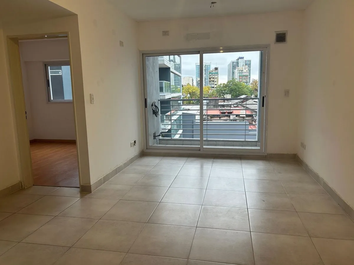 Departamento de 2 ambientes en Parque Patricios, en el 5to piso contrafrente, en el edificio Torres Blancas. Cuenta con living comedor con piso de porcelanato, cocina integrada, balcón y dormitorio con placard y piso flotante. Tiene 1 baño completo y no incluye cochera.