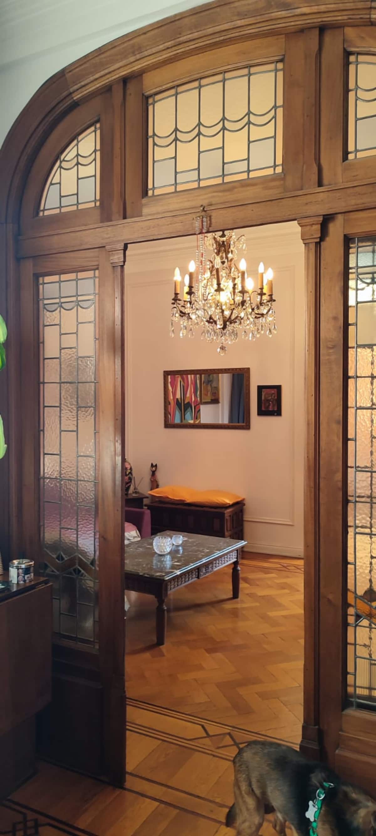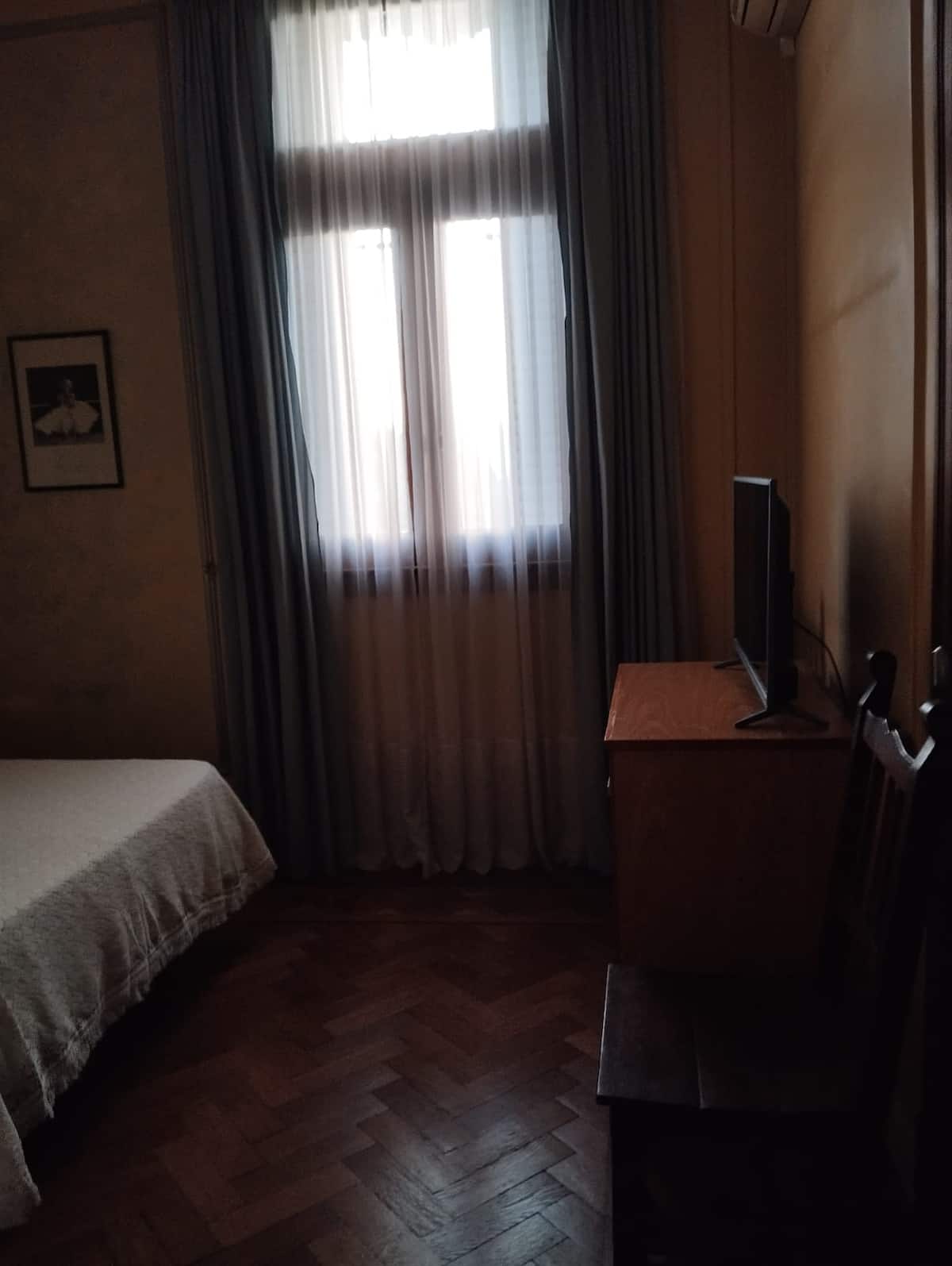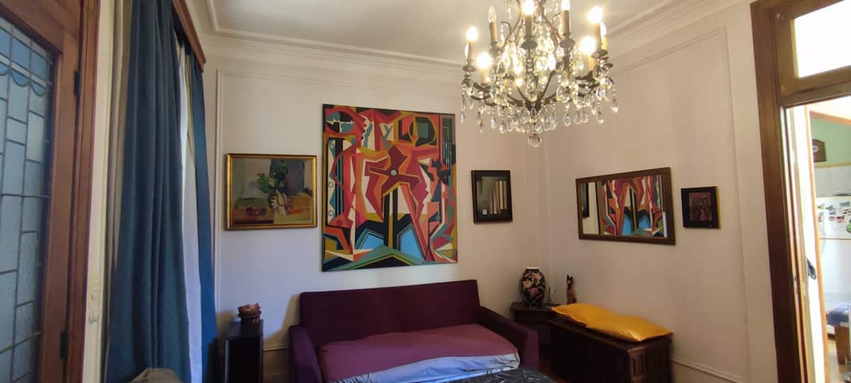 Habitación privada en un departamento de estilo francés en Parque Patricios. La publicación indica que es amplia y muy luminosa, con baño compartido y un baño de servicio. Incluye acceso a áreas comunes, como cocina y living. Se menciona proximidad a la línea H del subte, a pocos metros, y buena conectividad en Buenos Aires.