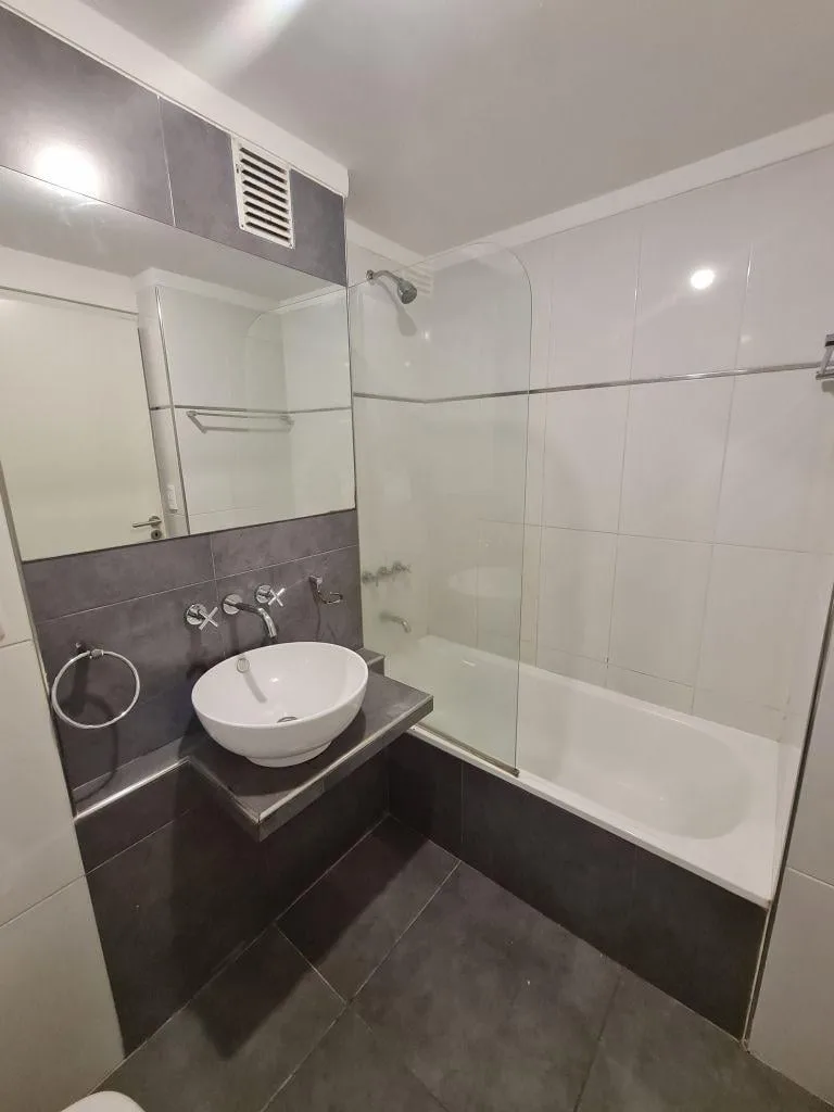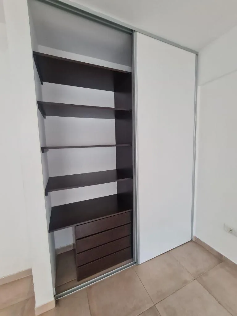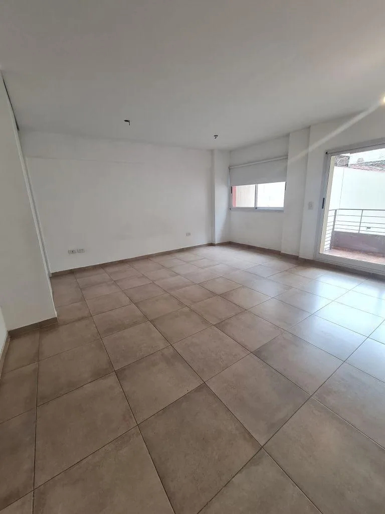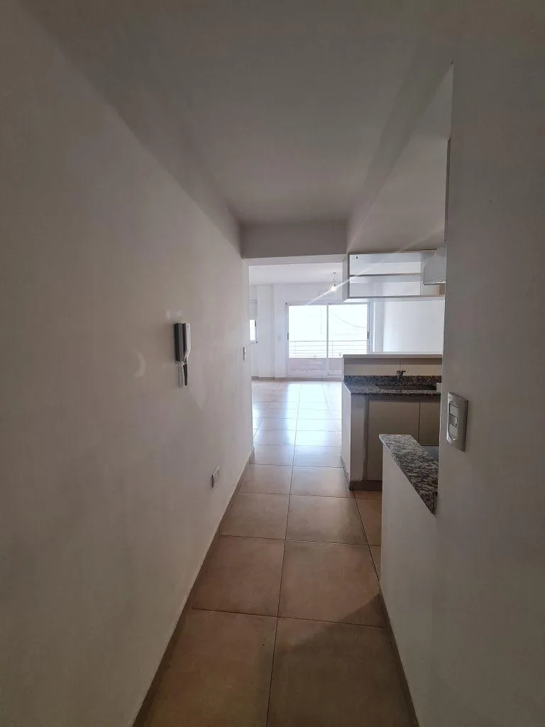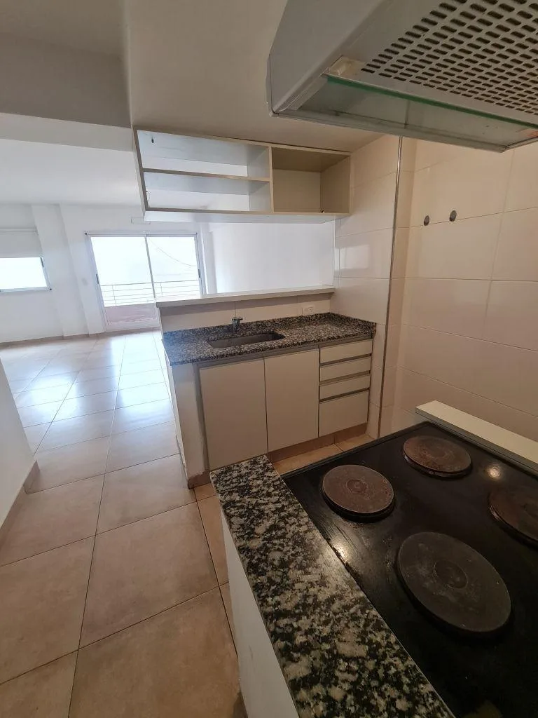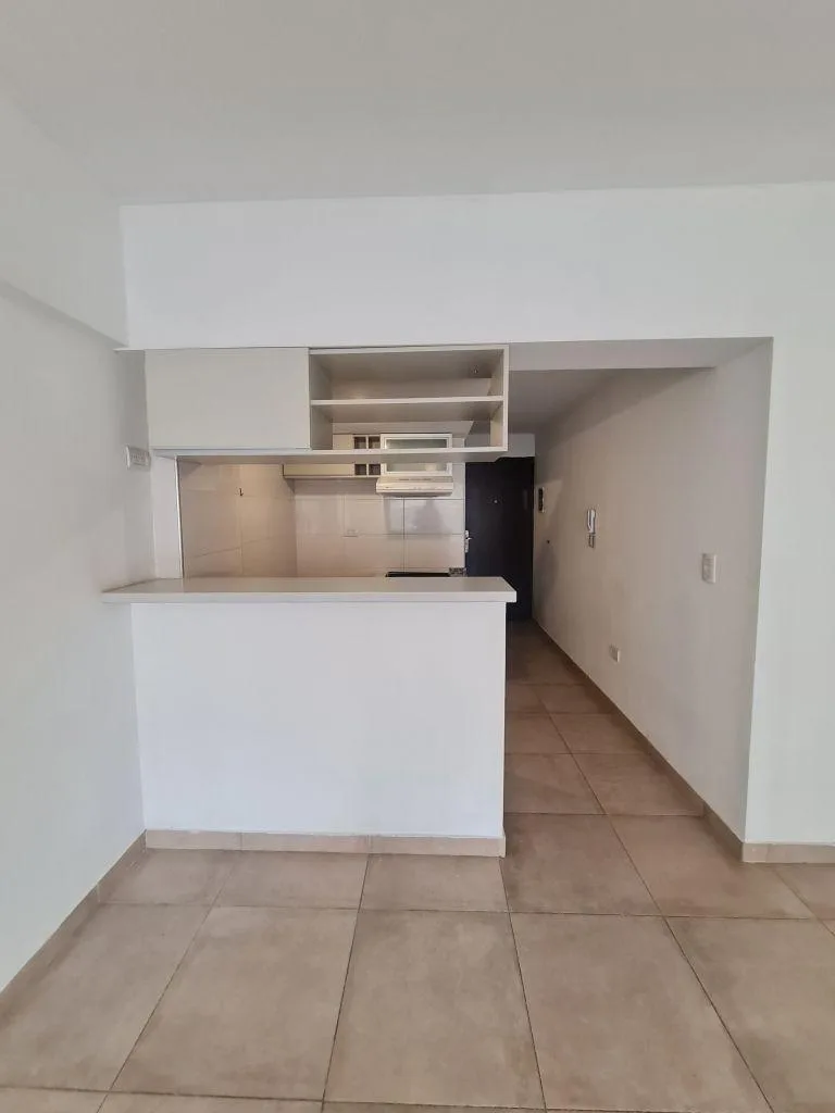 Monoambiente de 1 ambiente en primer piso, con balcón a contrafrente y toldo. Cocina equipada con alacena, bajo mesada, bacha con grifería monocomando, cocina de 4 hornallas con horno y extractor, comedor con dormitorio integrado y placard con interior. Baño completo con bañera. Aberturas DVH, puerta blindada, preinstalación para aire acondicionado (split) y calefacción/equipamiento eléctrico. Cochera descubierta propia con portón automático y sector de laundry compartido en el último piso. A 50