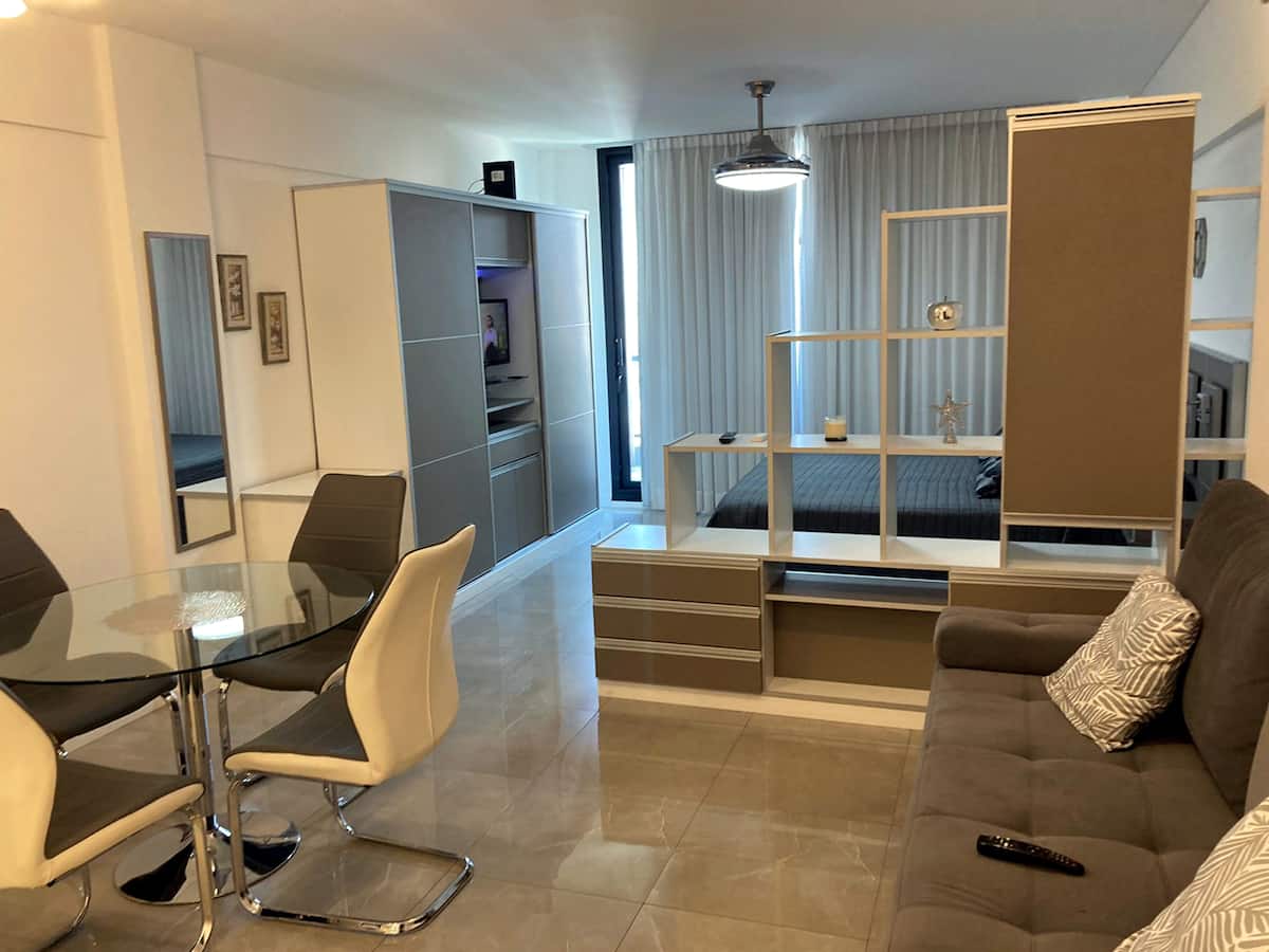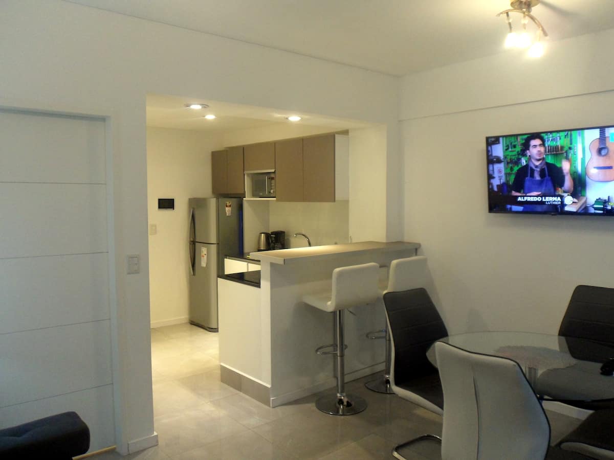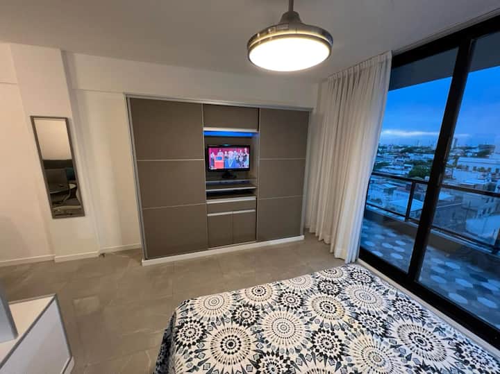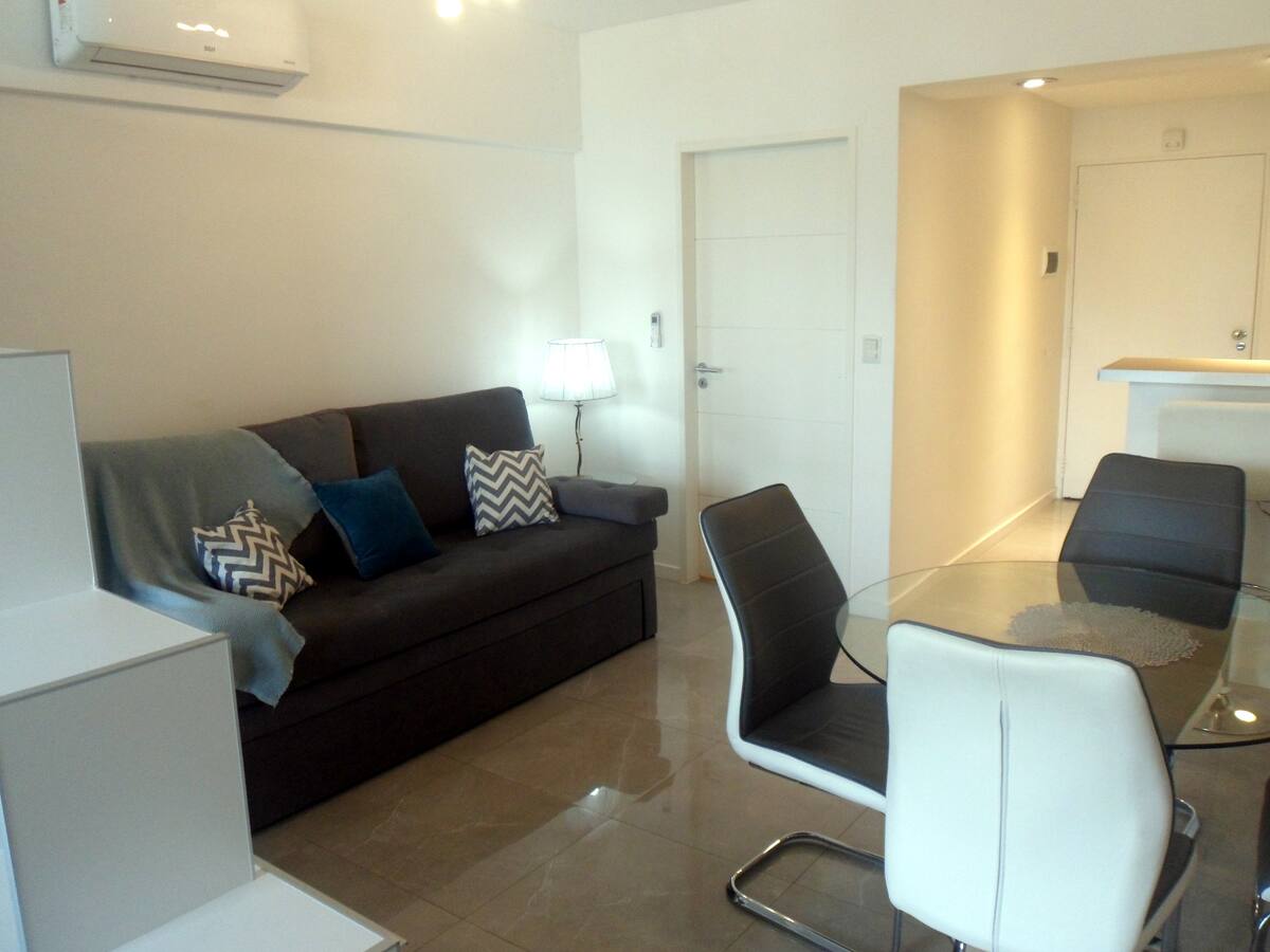 Departamento de 1 dormitorio y 46 m², con vista a la ciudad y 6 m² adicionales. Se ubica en Polo Tecnico (Parque Patricios) y cuenta con pileta, SUM, gimnasio, laundry, parrilla, sala de juegos y espacio de coworking con recepción. Incluye cochera y seguridad en el edificio. Tiene cama king y sofá cama de 2 plazas. Se encuentra a 400 metros de la estación de Subte Línea E y a 500 metros de la estación de la Línea H.