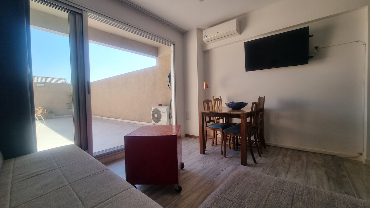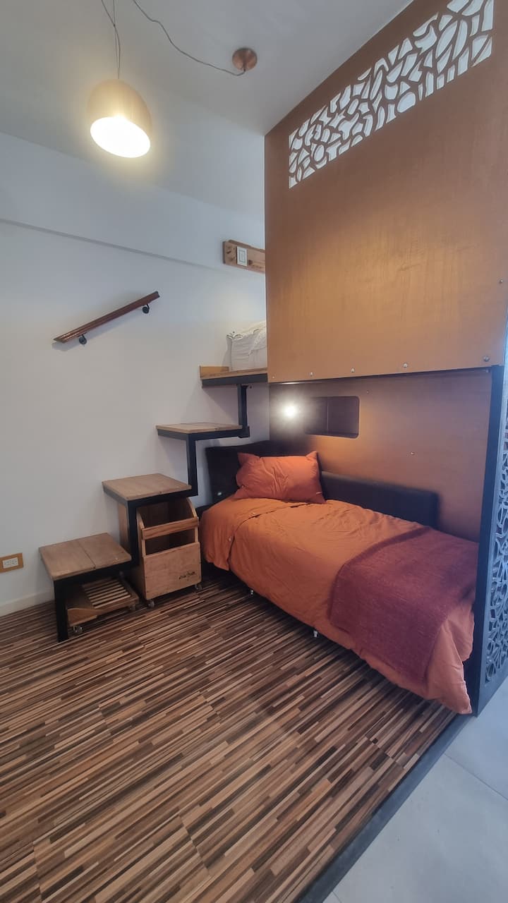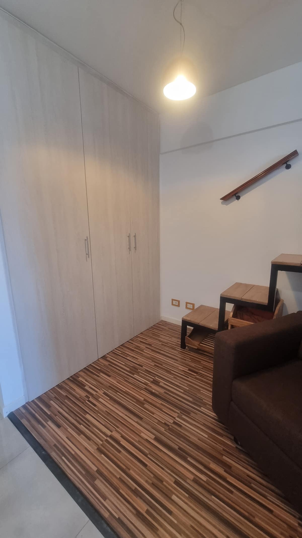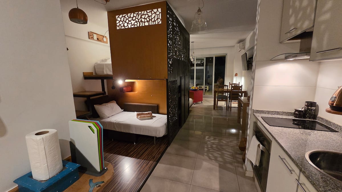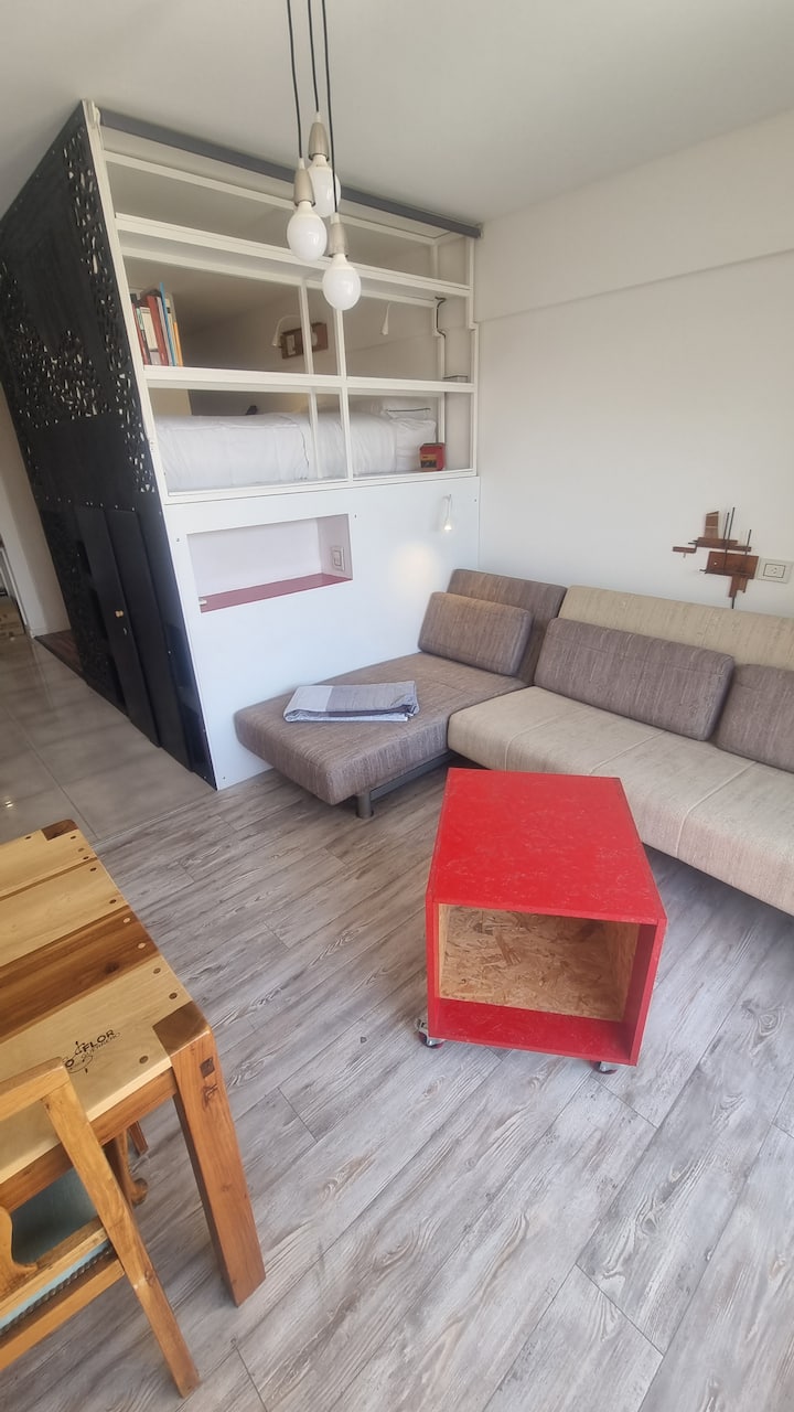 Departamento tipo estudio con 1 dormitorio y patio. Cuenta con cinco espacios interiores organizados en módulos, con área de dormitorio en plataforma. Incluye patio que funciona como un espacio verde y se integra al tamaño del departamento.