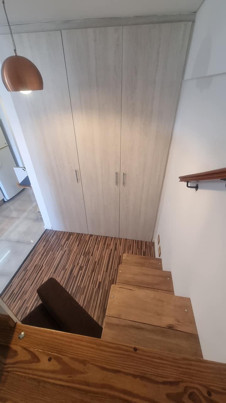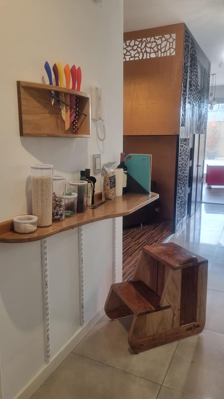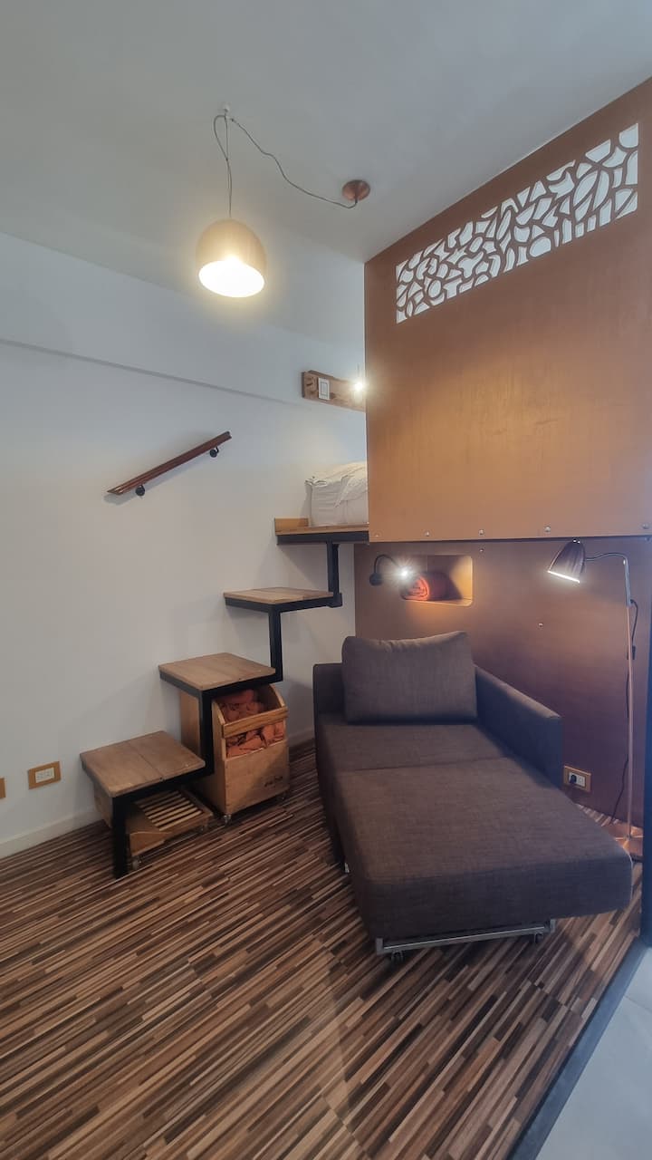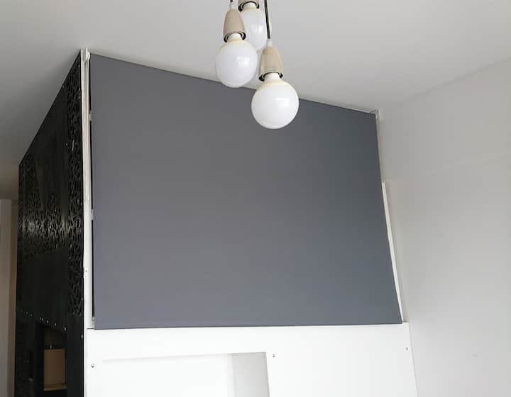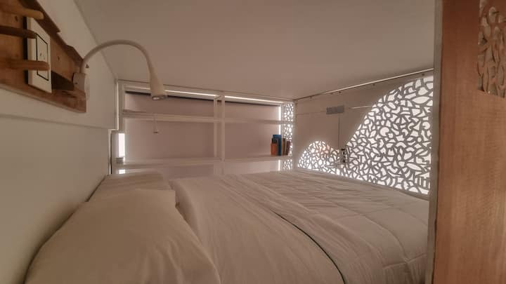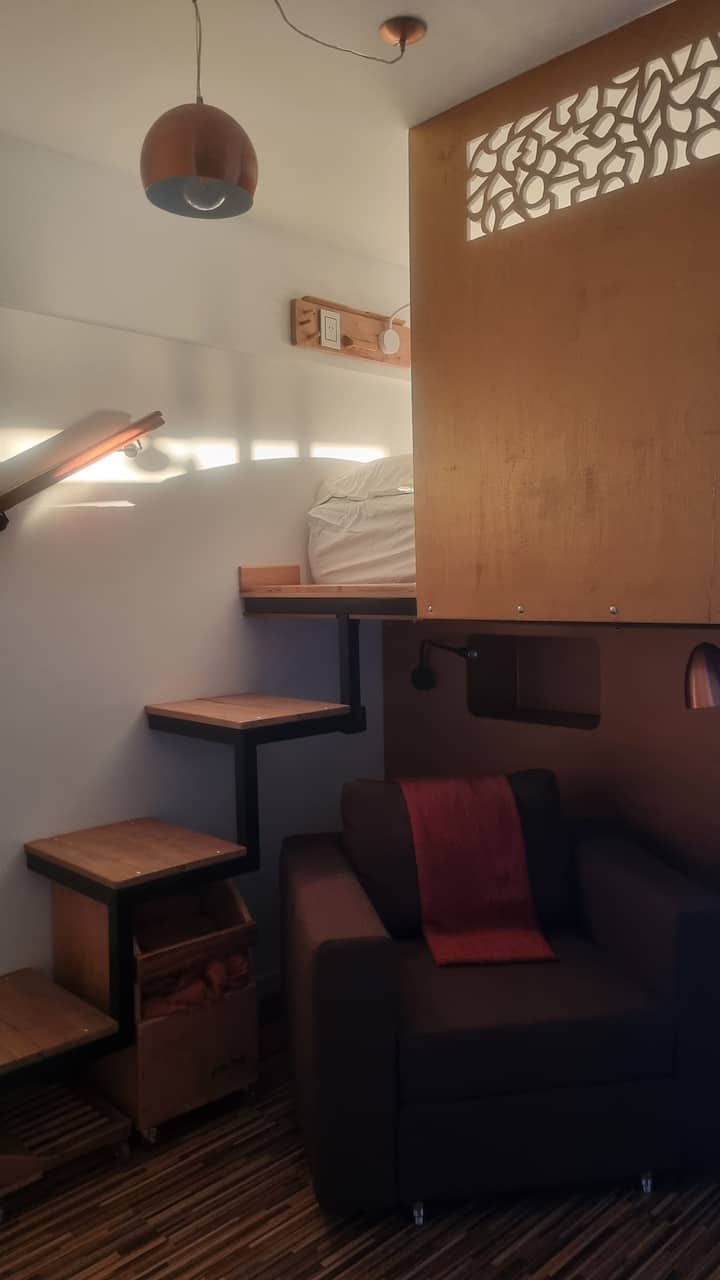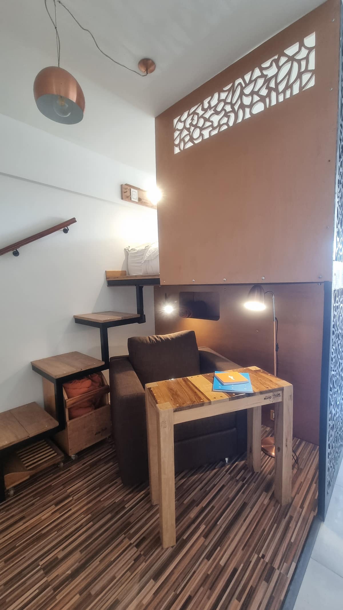 Departamento tipo estudio con 1 dormitorio y patio. Cuenta con cinco espacios interiores organizados en módulos, con área de dormitorio en plataforma. Incluye patio que funciona como un espacio verde y se integra al tamaño del departamento.