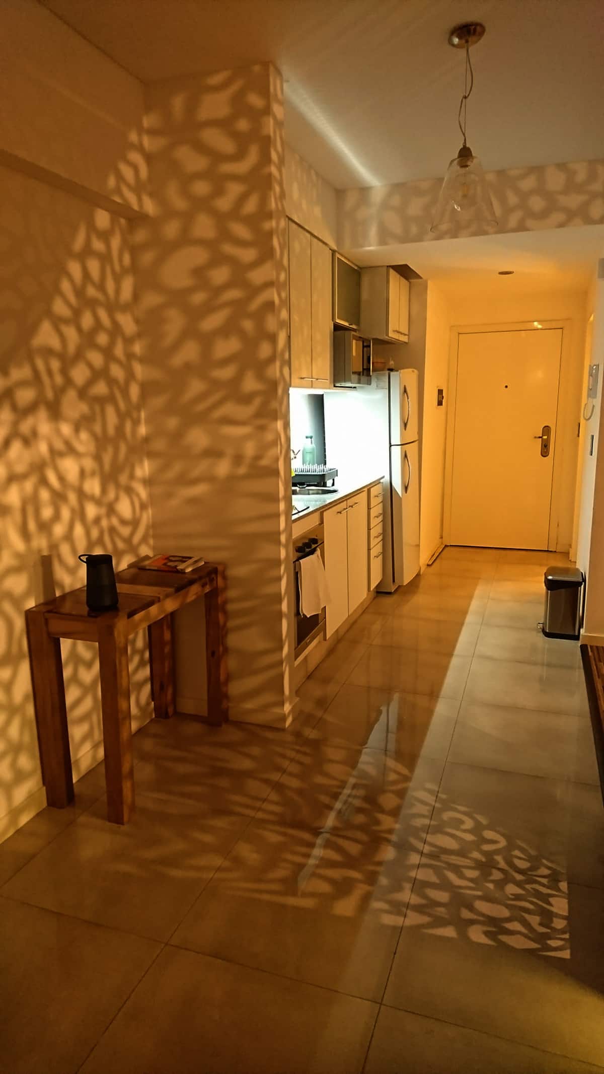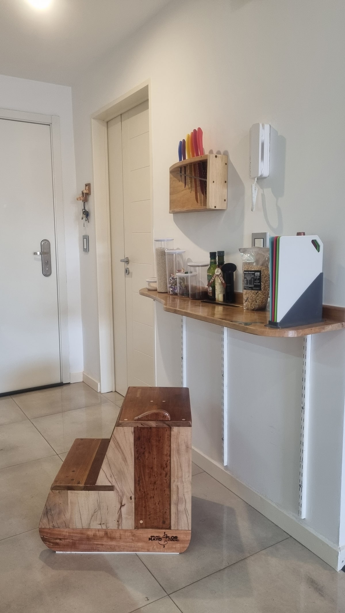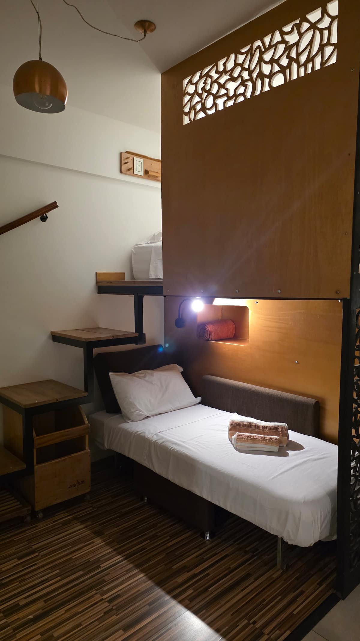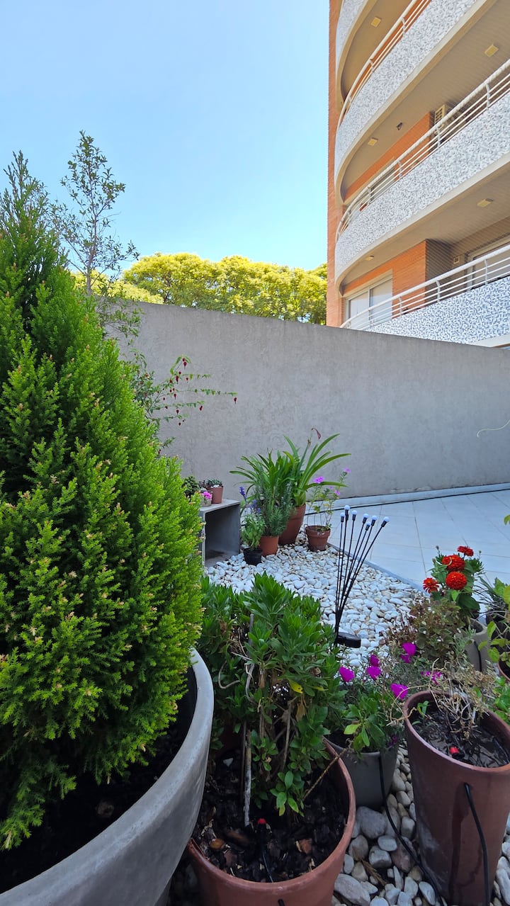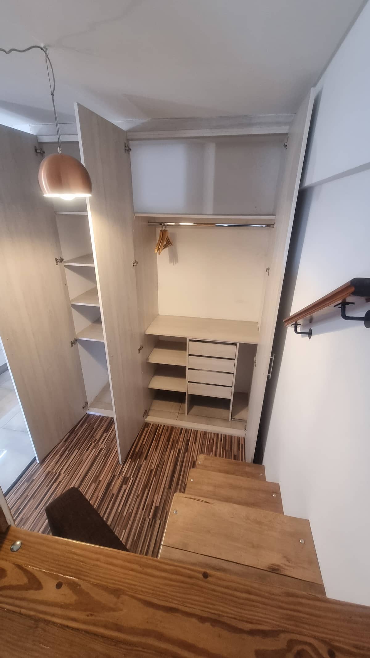 Departamento tipo estudio con 1 dormitorio y patio. Cuenta con cinco espacios interiores organizados en módulos, con área de dormitorio en plataforma. Incluye patio que funciona como un espacio verde y se integra al tamaño del departamento.