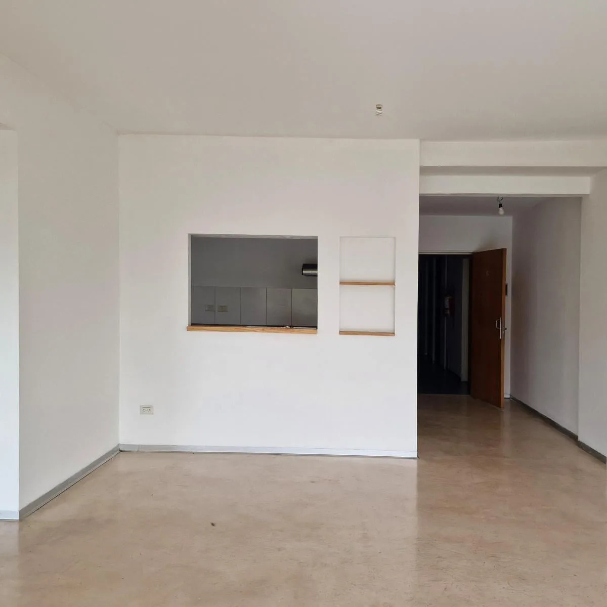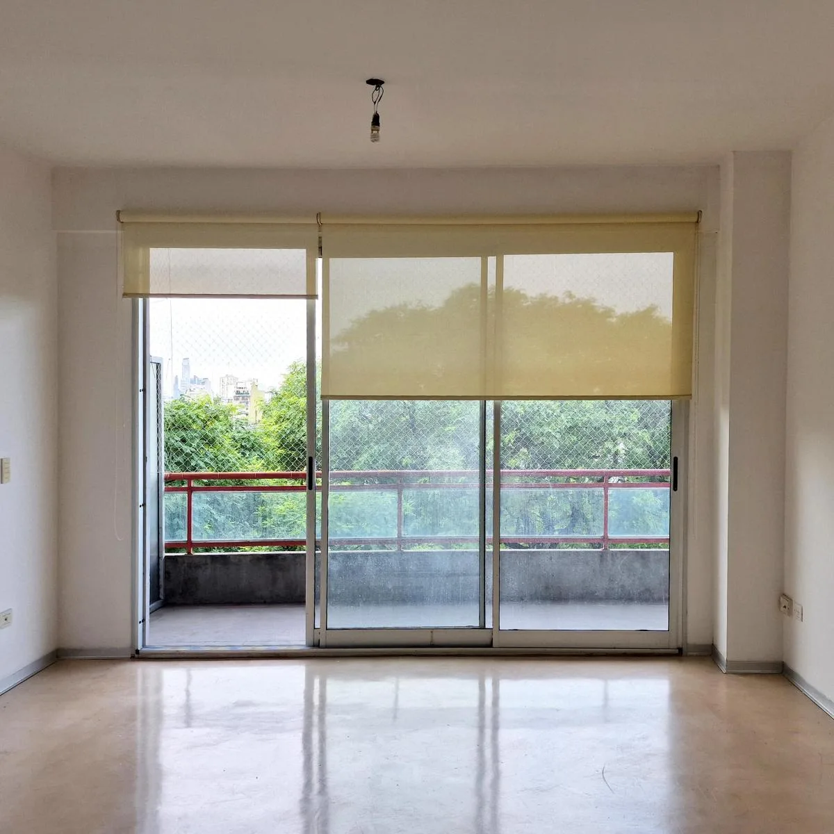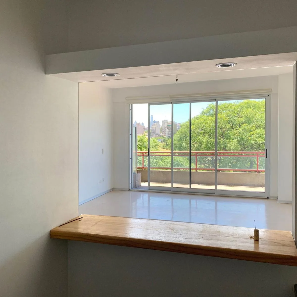 Departamento de 2 ambientes al frente, con balcón corrido, orientación este, con 10 años de antigüedad. Living y dormitorio al frente, con cortinas roller en ambos ambientes, cocina y baño completo. Agua caliente central, aire acondicionado frío-calor en el living y en el dormitorio, cochera, terraza con parrilla y laundry, y apto profesional.