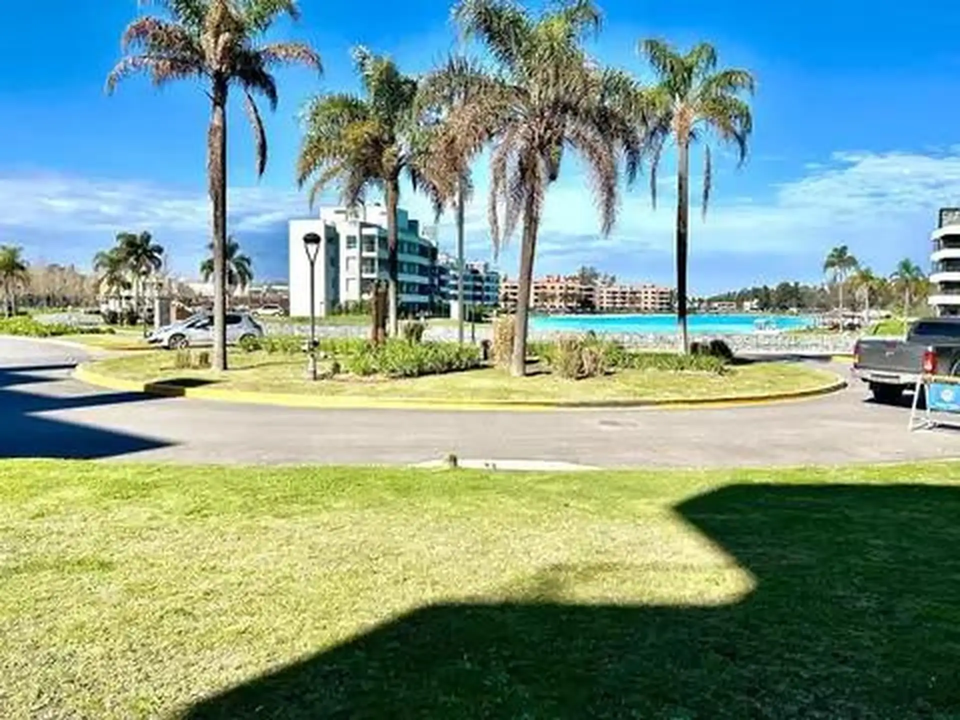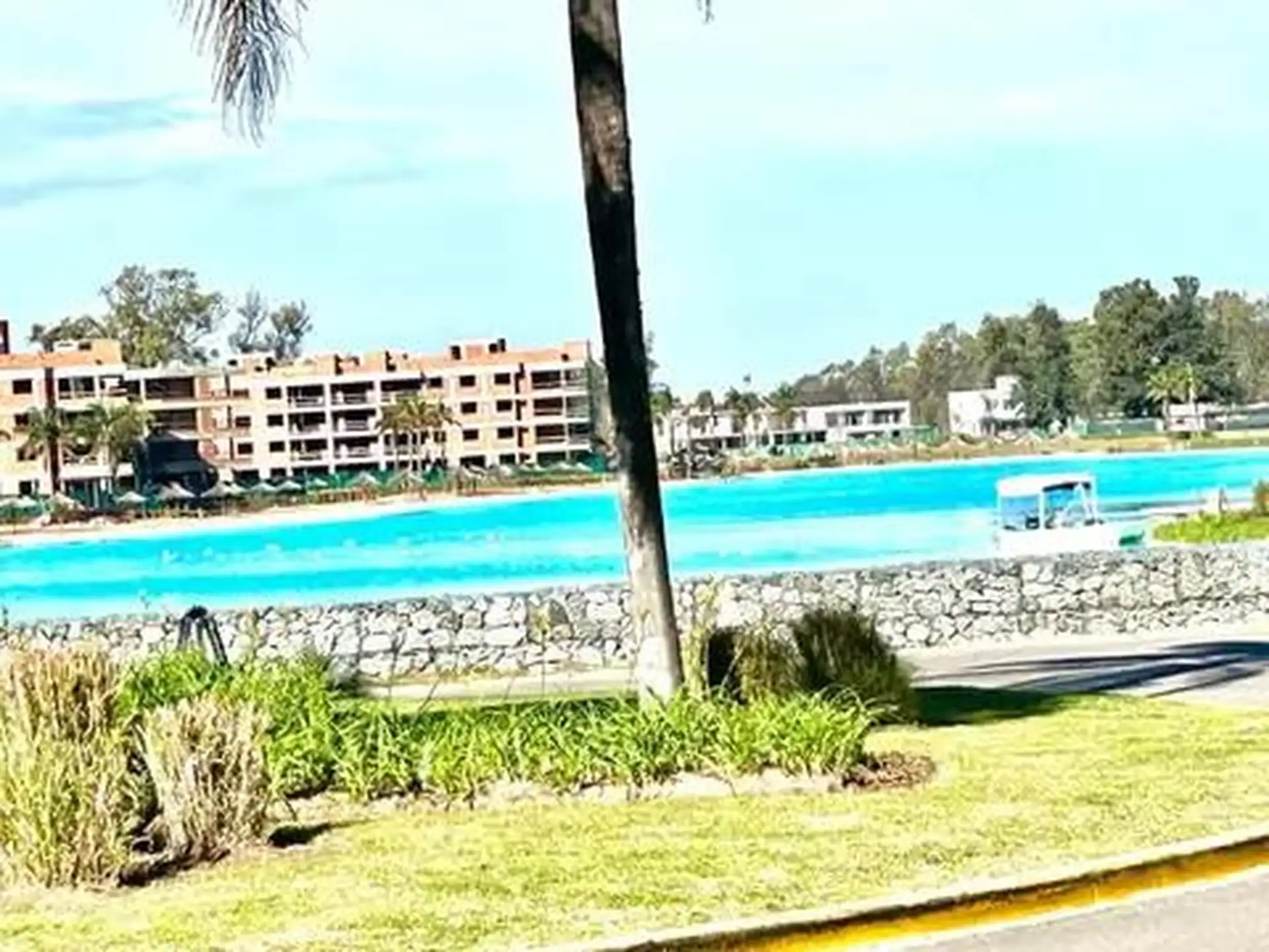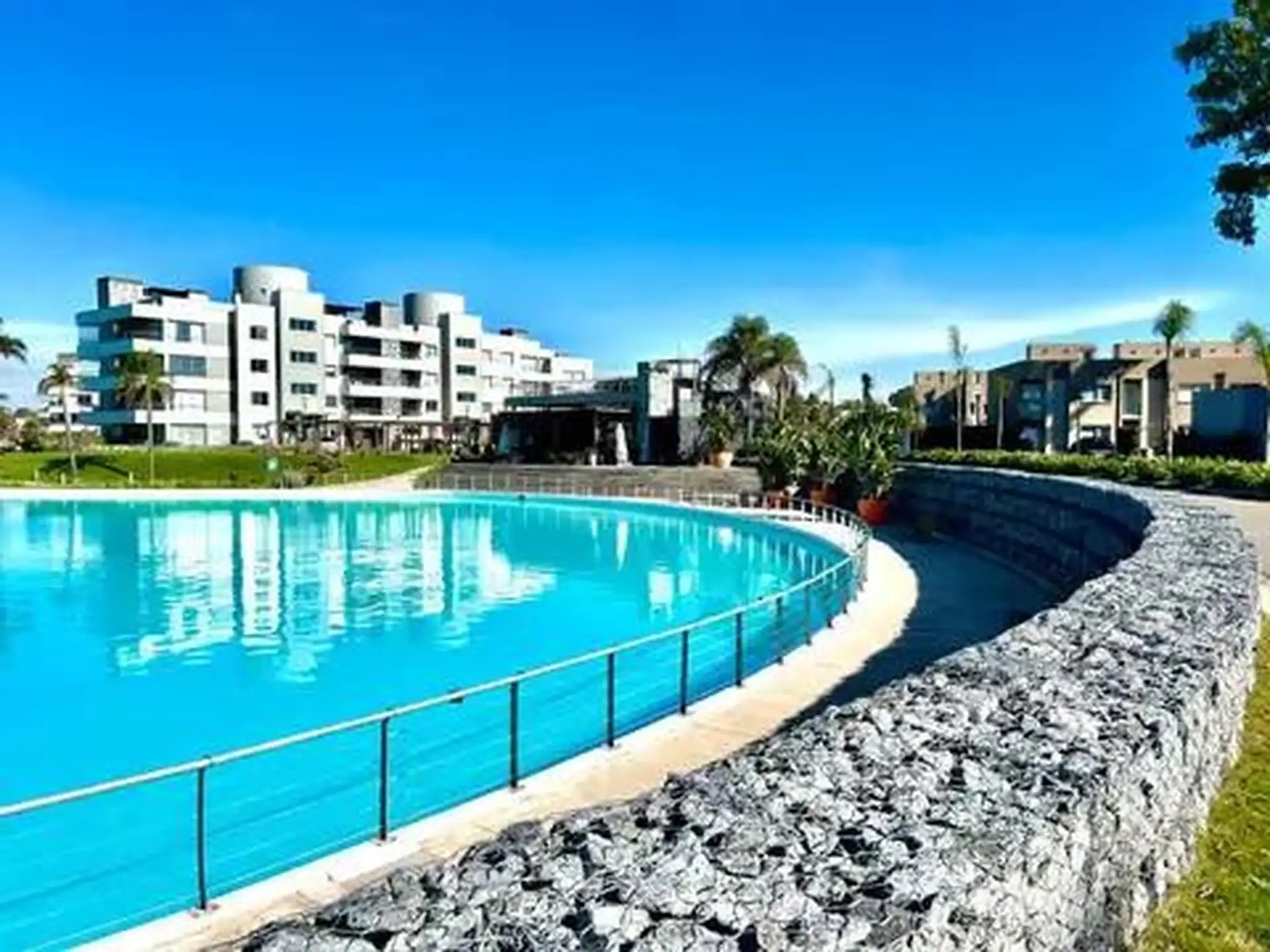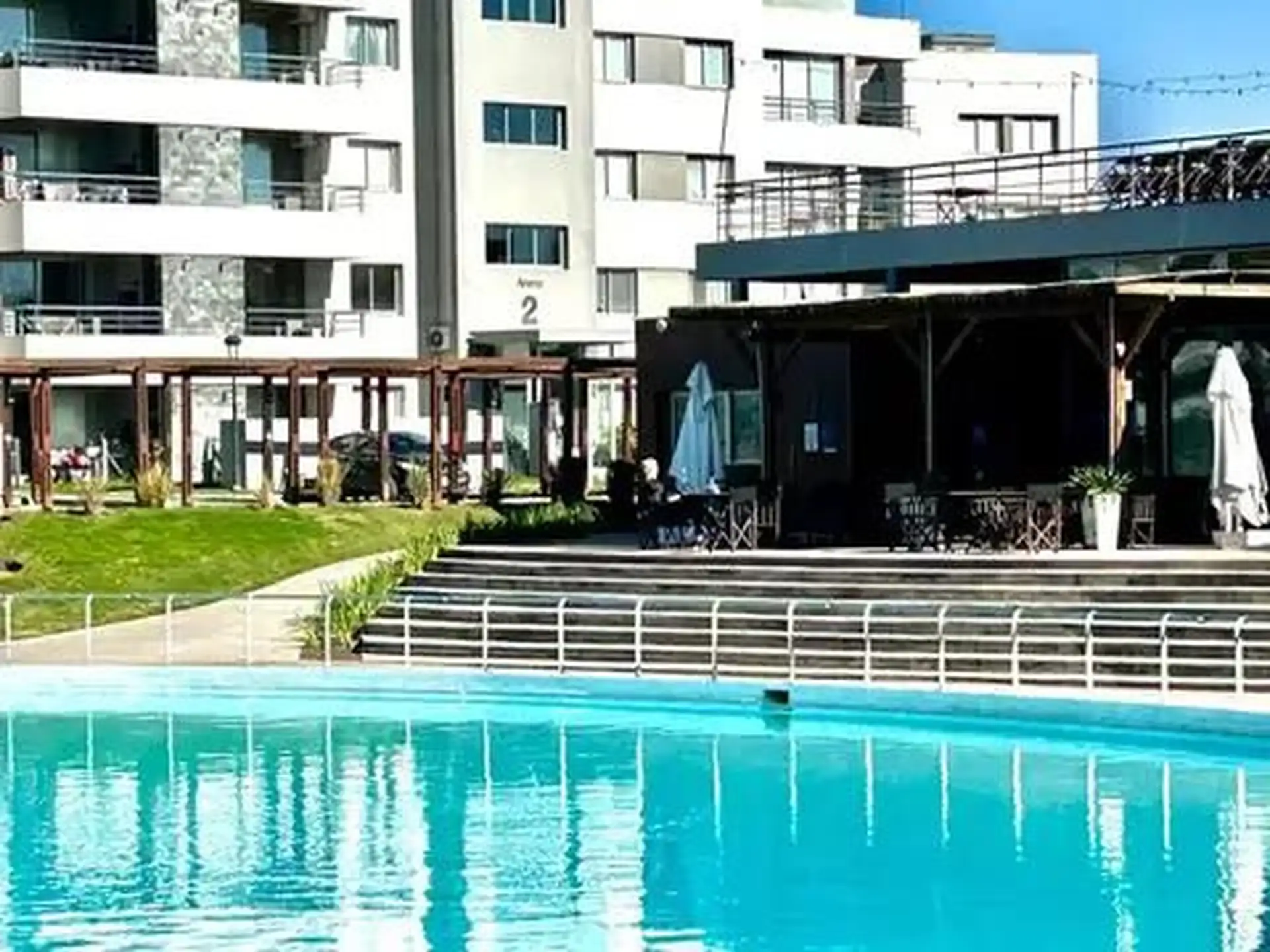 Departamento de 2 ambientes en planta baja en Pilar Lagoon, en Pilar. Incluye jardín, parrilla propia y cochera semicubierta al lado del ingreso al edificio; totalmente amoblado. Cuenta con losa radiante y aire acondicionado frío-calor en el living y el dormitorio. El complejo dispone de SUM, sauna, portero visor y alarma, con seguridad las 24 h. El valor publicado por mes es U$S 1900 para diciembre y enero, U$S 1400 para febrero y U$S 1000 para marzo.