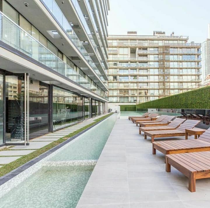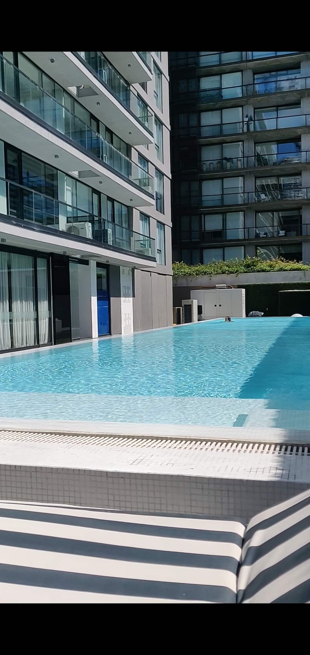 Departamento monoambiente con balcón y vista interna a la pileta, en piso alto. Cuenta con equipamiento completo. El edificio tiene seguridad y recepción 24 horas, gimnasio, SUM y laundry.