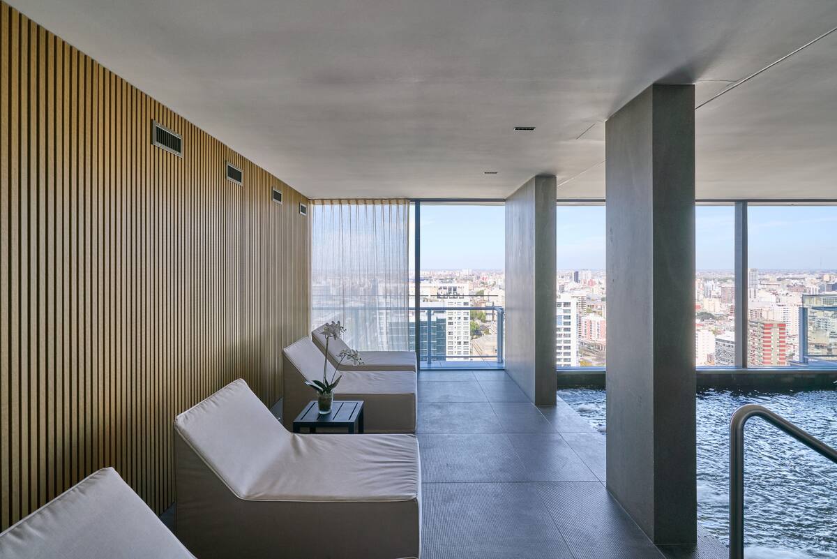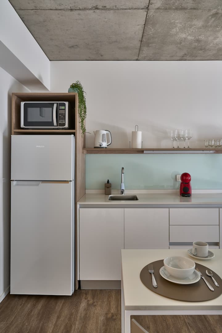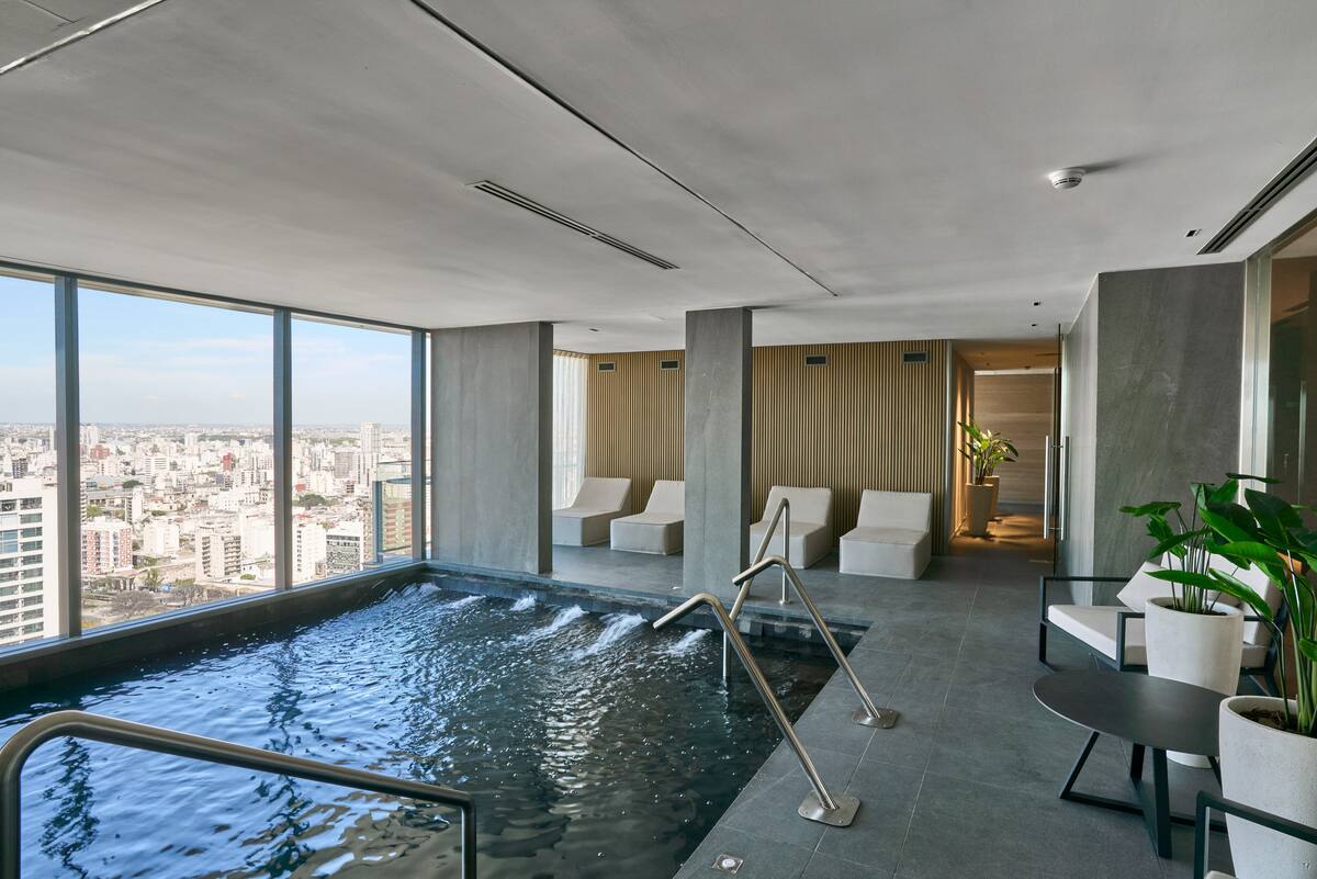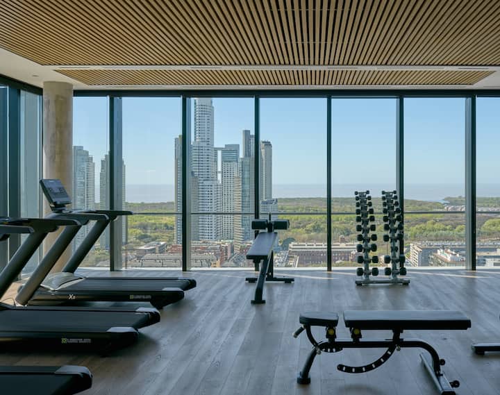 Departamento de 2 ambientes en Puerto Madero, con balcón y vista a la ciudad y al río. Incluye dormitorio y living, cocina abierta totalmente equipada, un toilette y un baño completo. Cuenta con placard y el estar se integra al balcón. El edificio tiene pileta climatizada/jacuzzi indoor fuera de servicio hasta nuevo aviso.