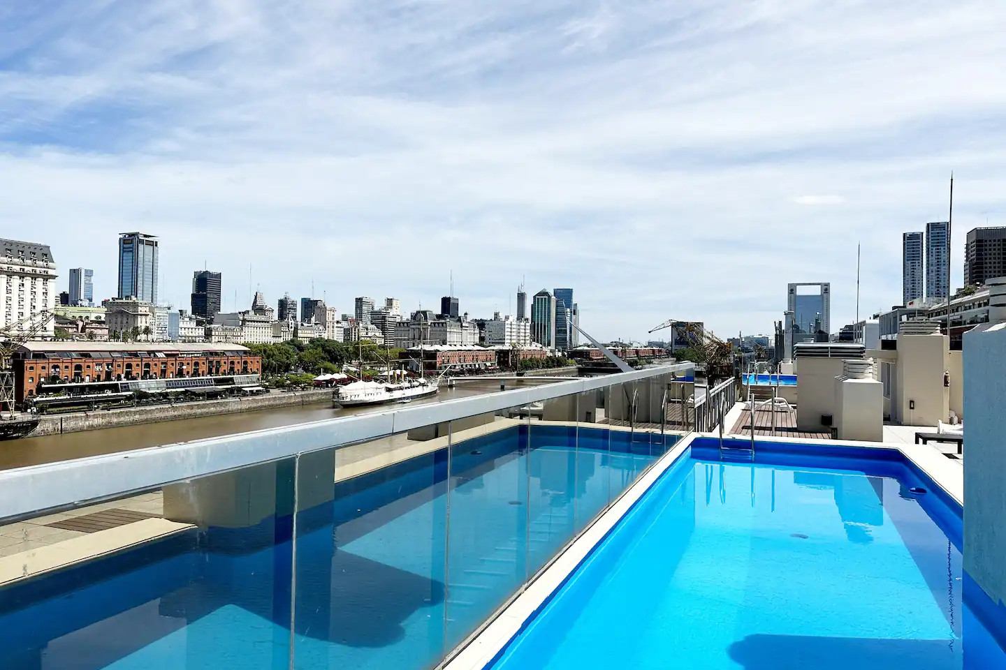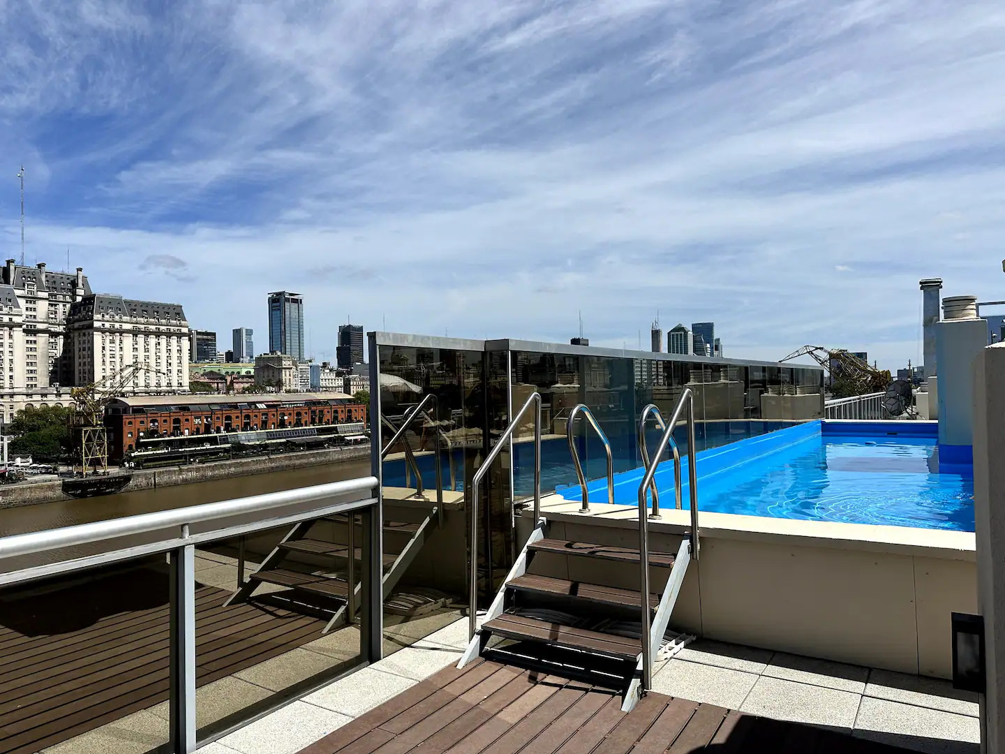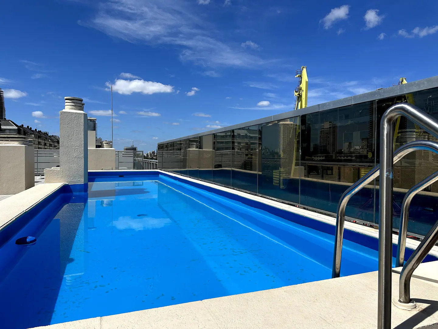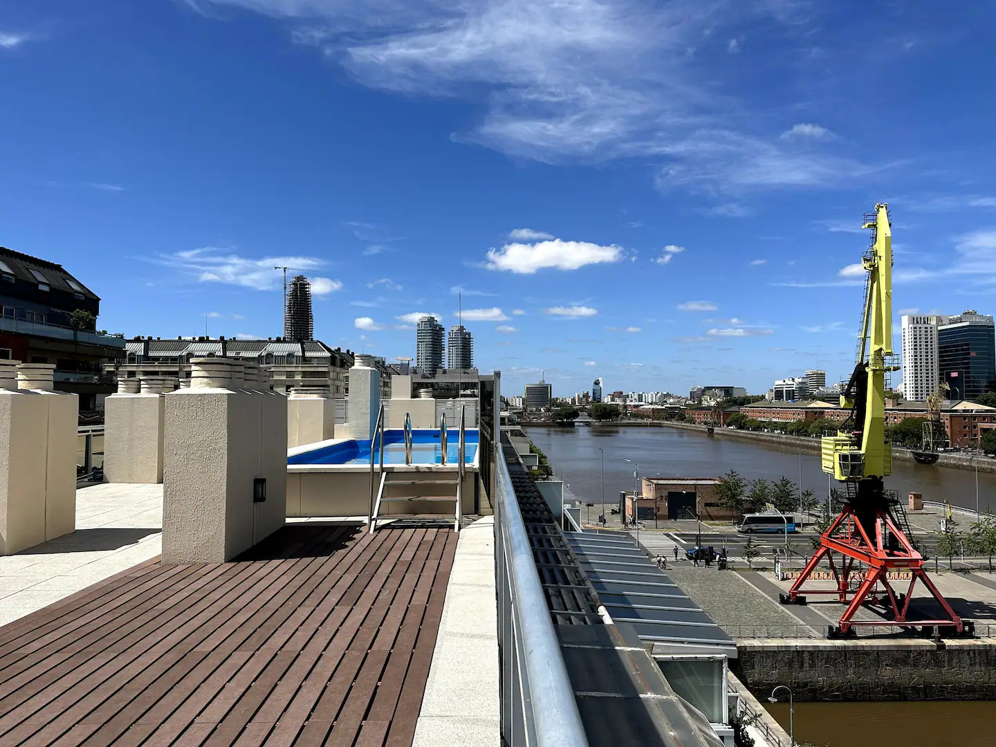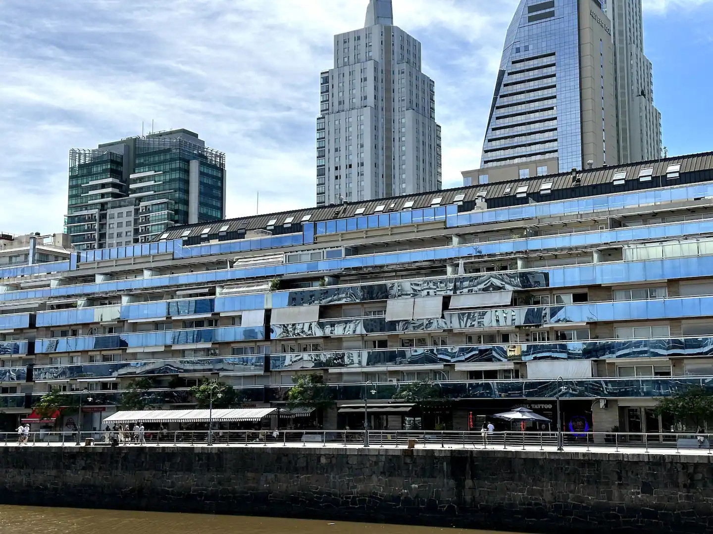 Departamento de 2 ambientes de 50 m² totales, sin muebles, en el Edificio BA HOUSE. Tiene balcón a la calle y cocina tipo kitchenette integrada. Cuenta con aire acondicionado en ambos ambientes y un placard grande en el dormitorio. El edificio dispone de seguridad 24 h, gimnasio, vestuario con sauna, 2 piscinas, jacuzzi en la azotea, y está frente al Dique 3 en Puerto Madero.