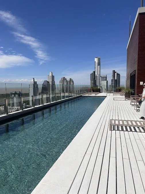 Monoambiente de 31 m² cubiertos en una torre de 36 pisos, piso 26, al que se suma 5 m de balcón aterrazado con vista lateral al Río. Superficie total de 35 m², con cochera para moto. Incluye aire acondicionado, cocina integrada con amoblamiento bajo mesada, termotanque para agua caliente individual y grupo electrógeno. El edificio cuenta con parrilla, solarium, laundry, SUM, piscina descubierta, piscina cubierta, sauna, baño de vapor, gimnasio y salas de relax. Expensas: $150.000. Requisitos: in