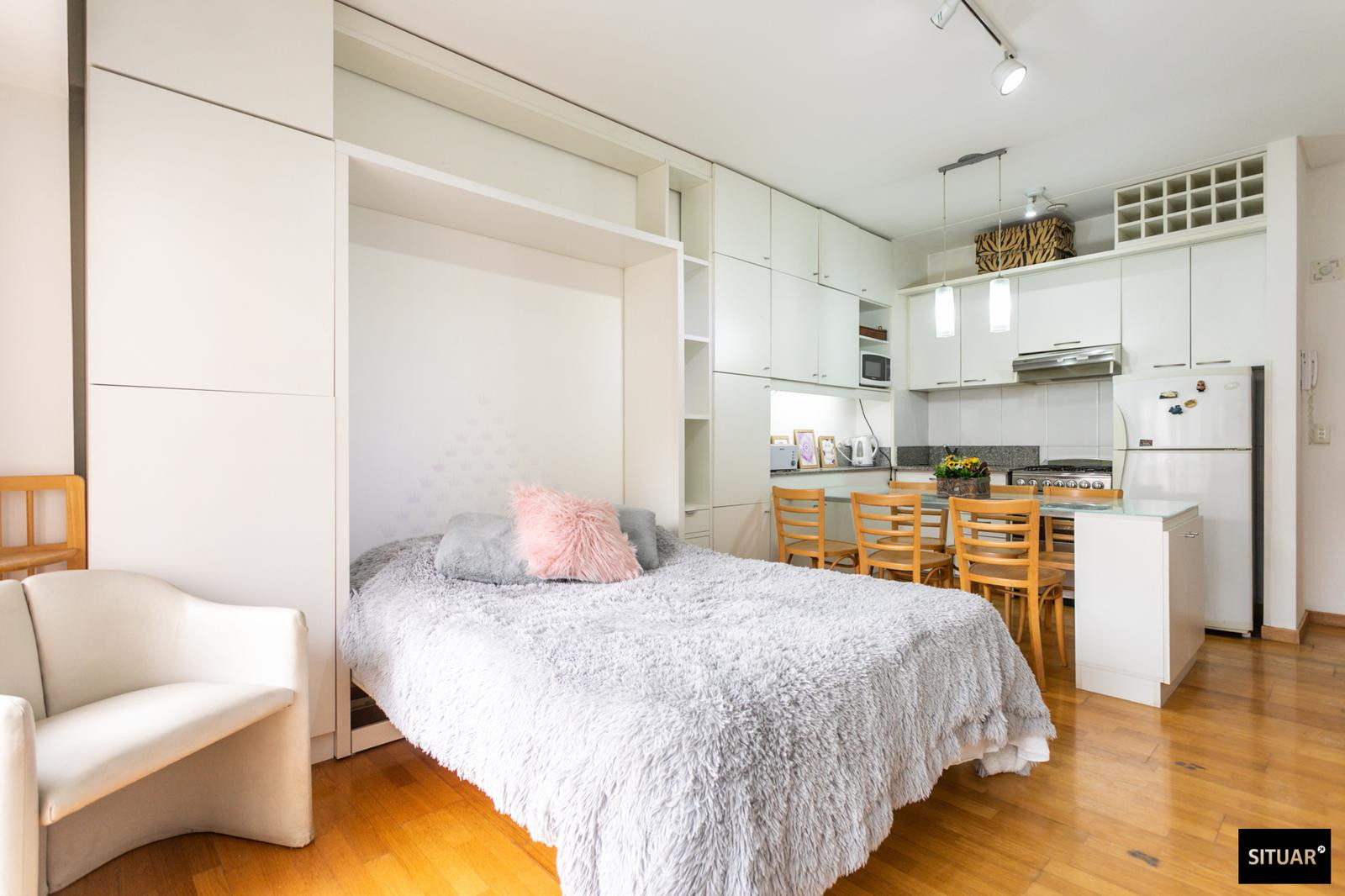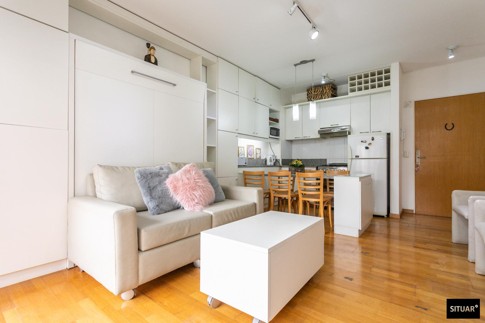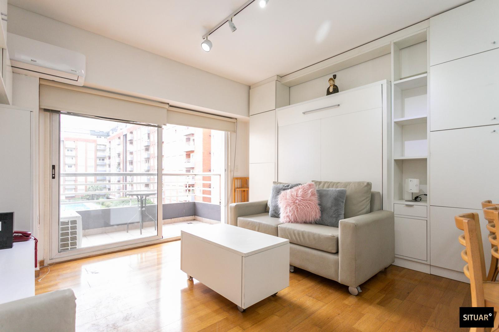 Departamento de 1 dormitorio en Puerto Madero, en Terrazas de Puerto Madero. Incluye balcón al contrafrente con vista verde. Cuenta con cama rebatible que permite alternar entre living y dormitorio, cocina con espacio de guardado y amenities en el edificio: pileta climatizada, solarium, SUM, laundry, spa con jacuzzi y sauna, y gimnasio, con seguridad 24 h.