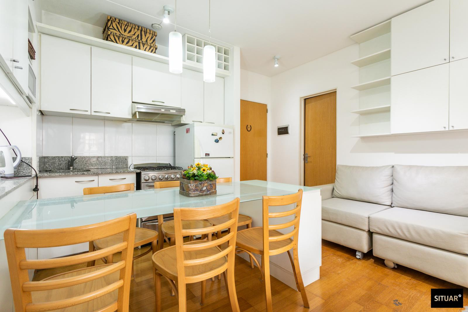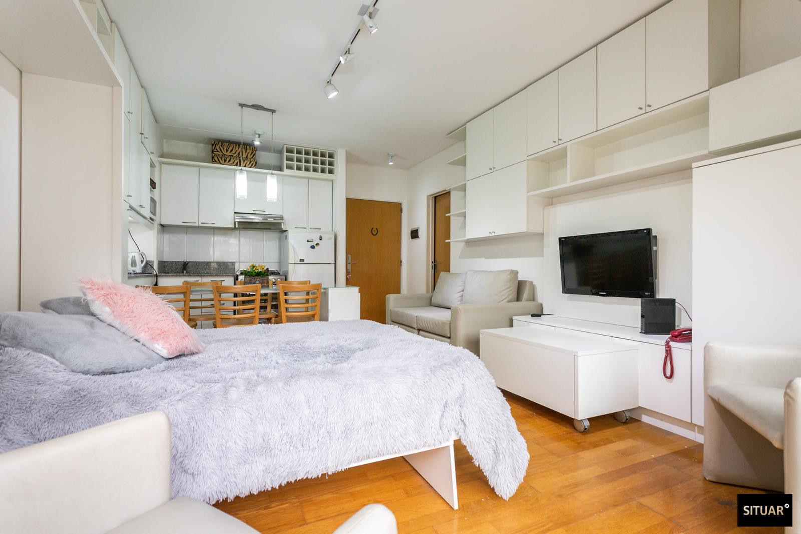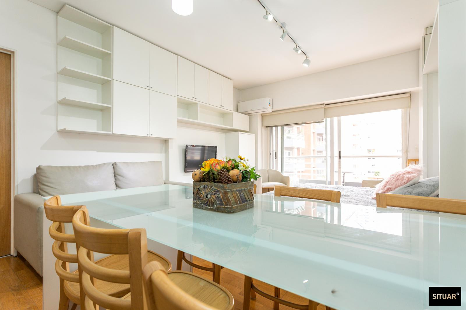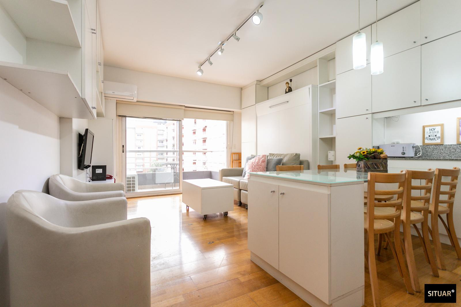 Departamento de 1 dormitorio en Puerto Madero, en Terrazas de Puerto Madero. Incluye balcón al contrafrente con vista verde. Cuenta con cama rebatible que permite alternar entre living y dormitorio, cocina con espacio de guardado y amenities en el edificio: pileta climatizada, solarium, SUM, laundry, spa con jacuzzi y sauna, y gimnasio, con seguridad 24 h.