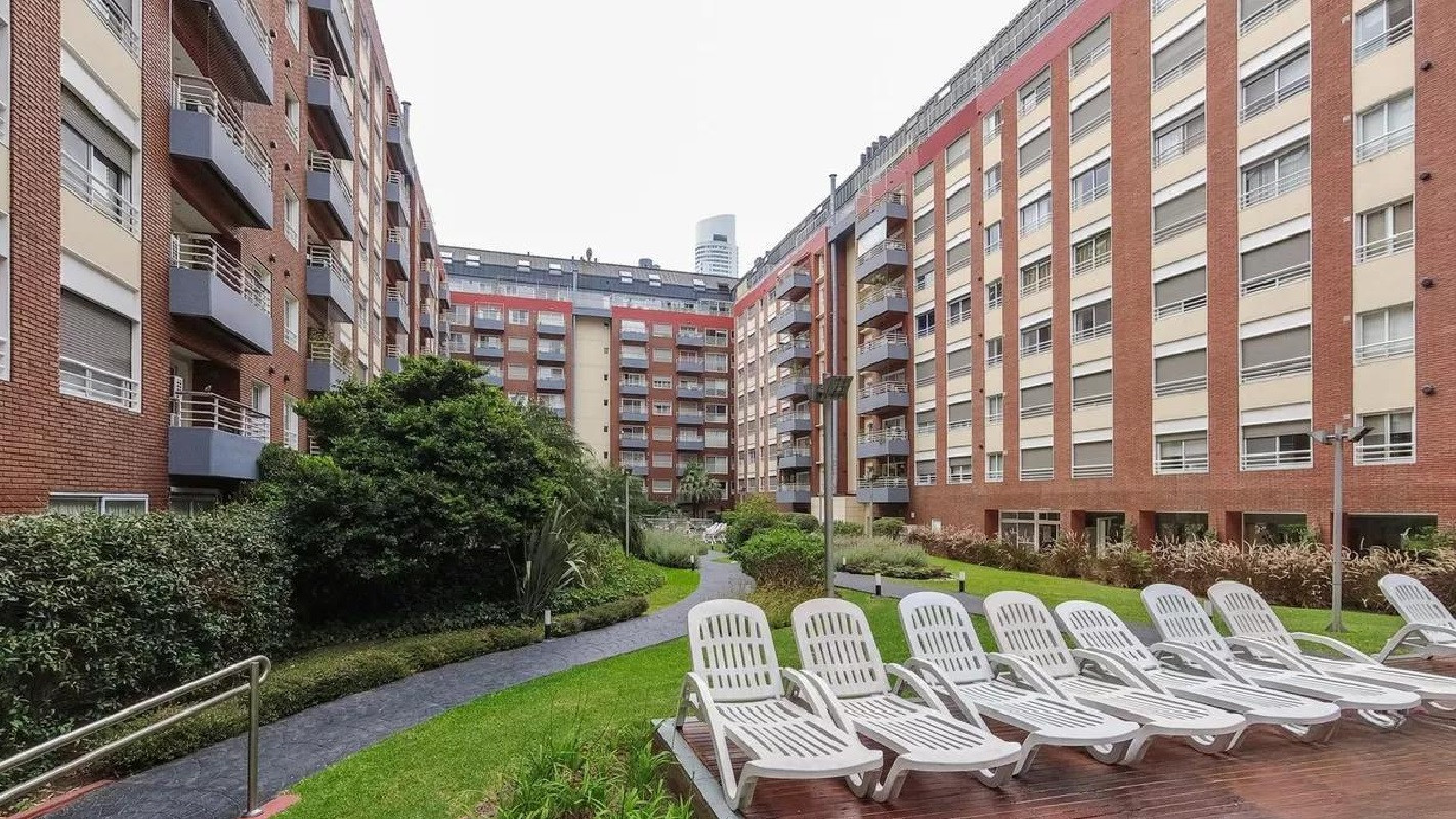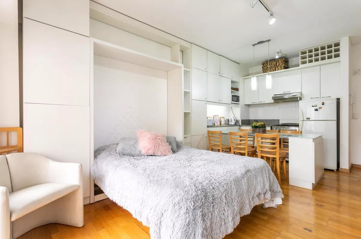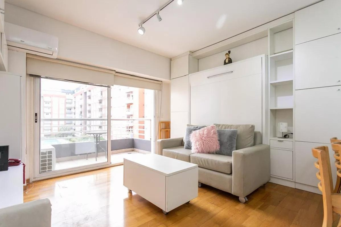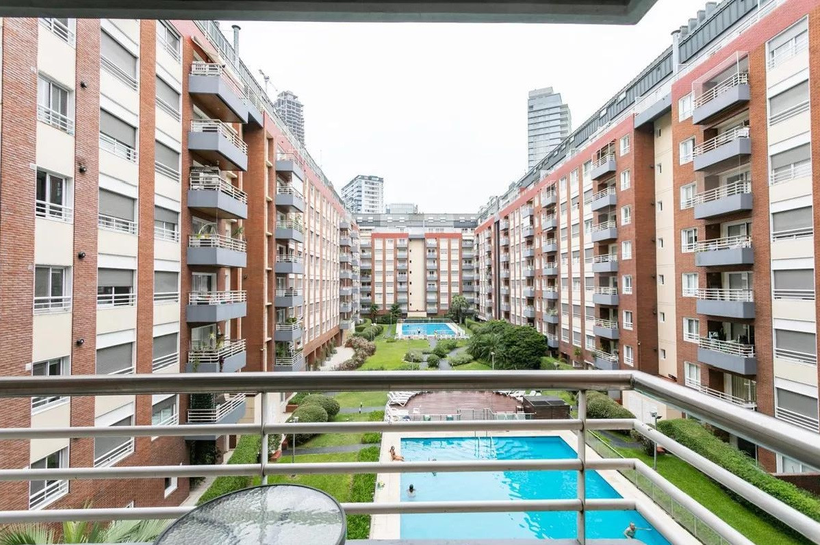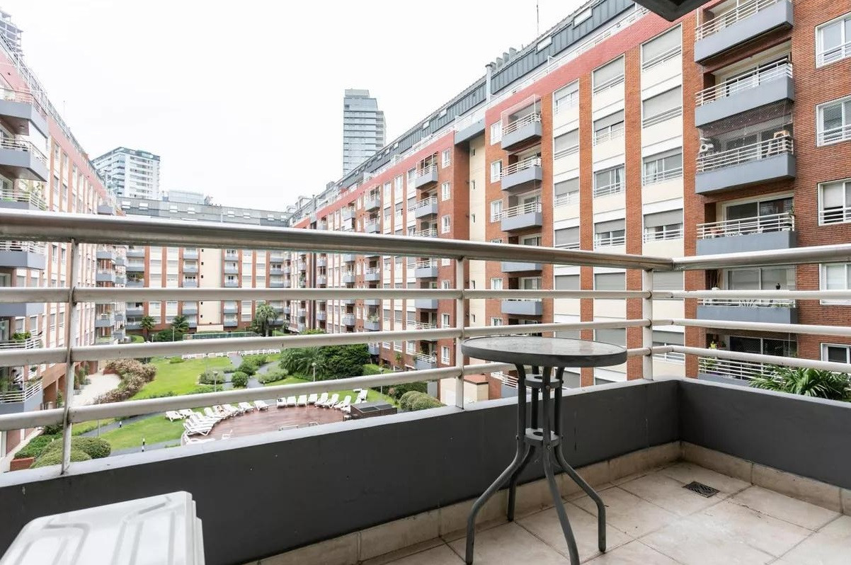 Monoambiente en alquiler en el edificio Terrazas de Puerto Madero. Incluye cama empotrada que se pliega, mesa para 6 personas y espacios de guardado. El balcón da al parque del edificio. El paquete ofrecido indica USD 1.000 e incluye expensas.